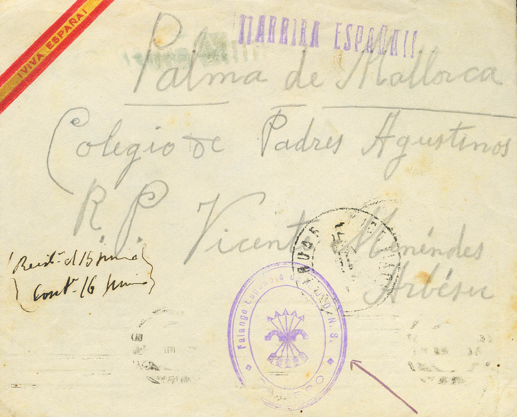 1937. CANERO (ASTURIAS) a PALMA DE MALLORCA, remitida desde el Campo de Concentración de Canero, situado en las escuelas de la Parroquia de Trevías, en funcionamiento entre Abril de 1937 y Abril de 1938. Marca de franquicia FALANGE ESPAÑOLA DE LAS J.O.N.S. / CANERO, en violeta. MAGNIFICA Y RARA.