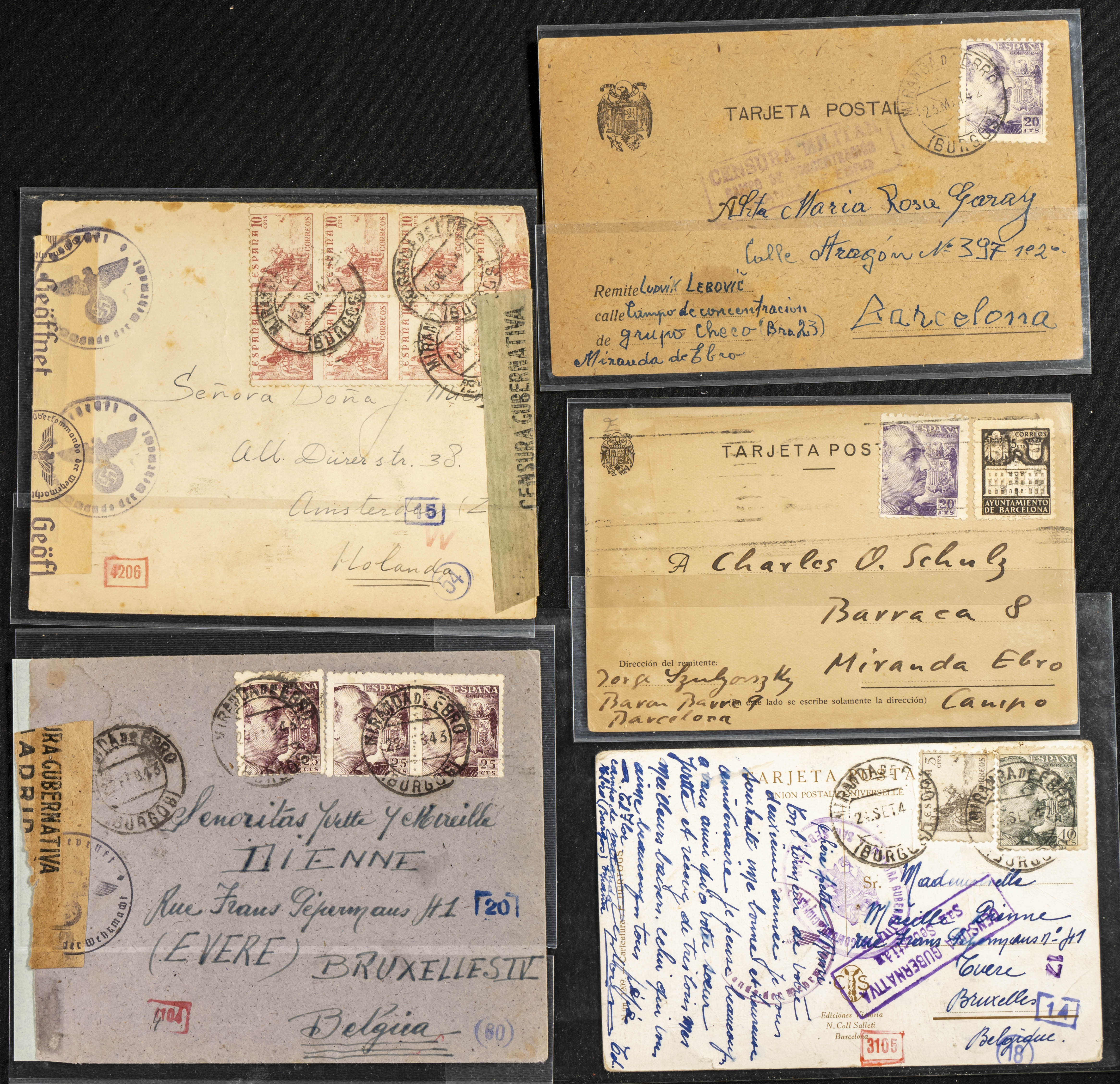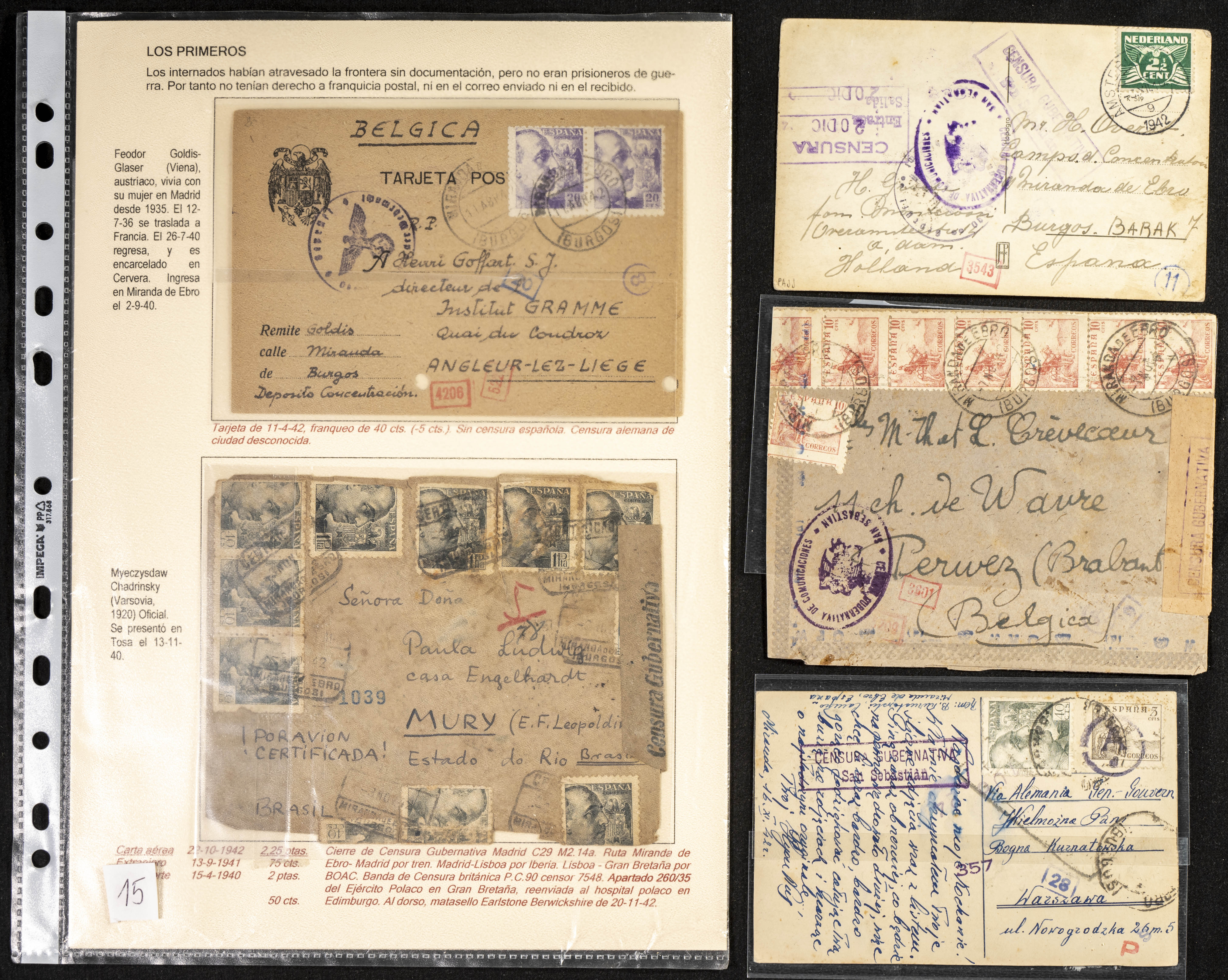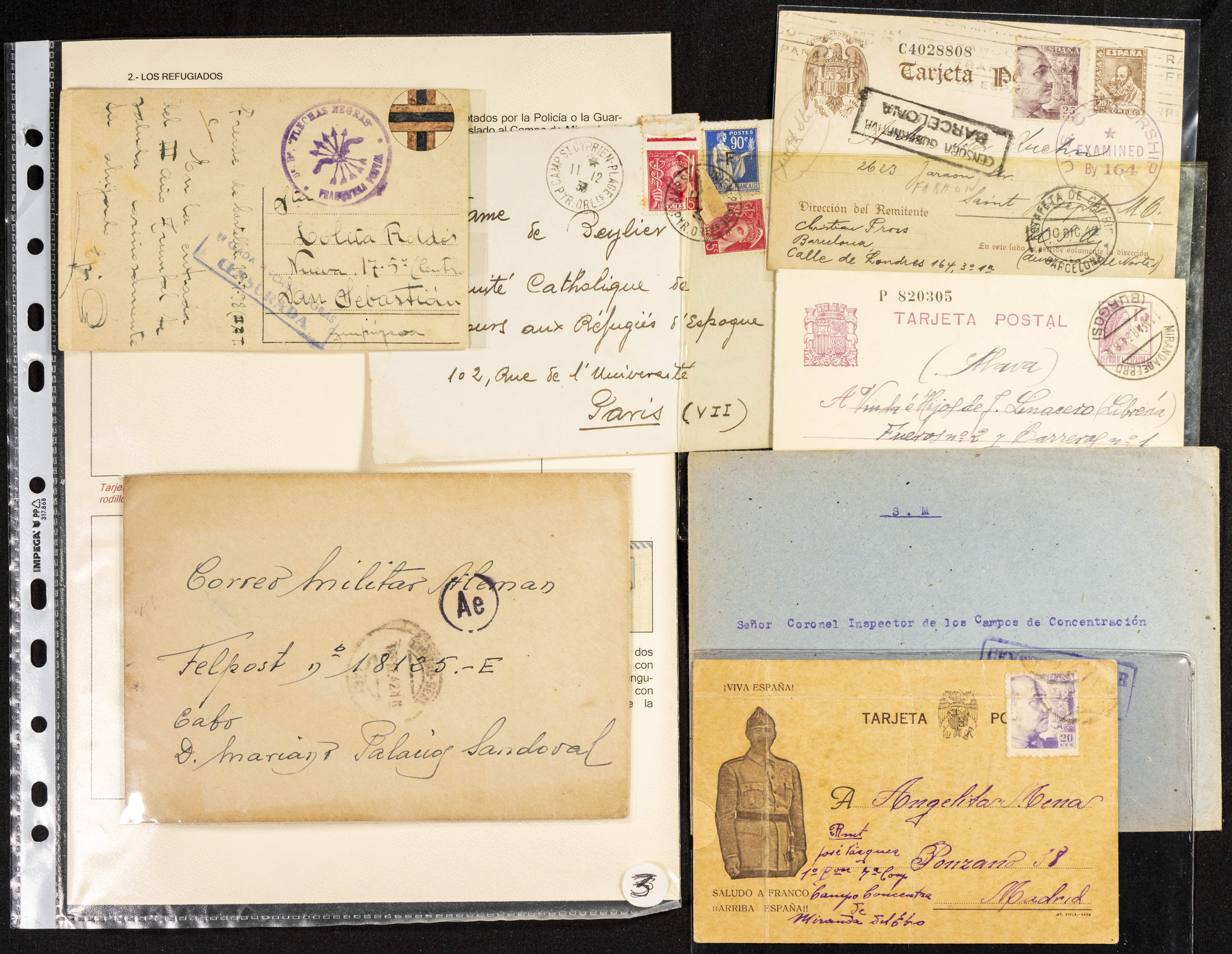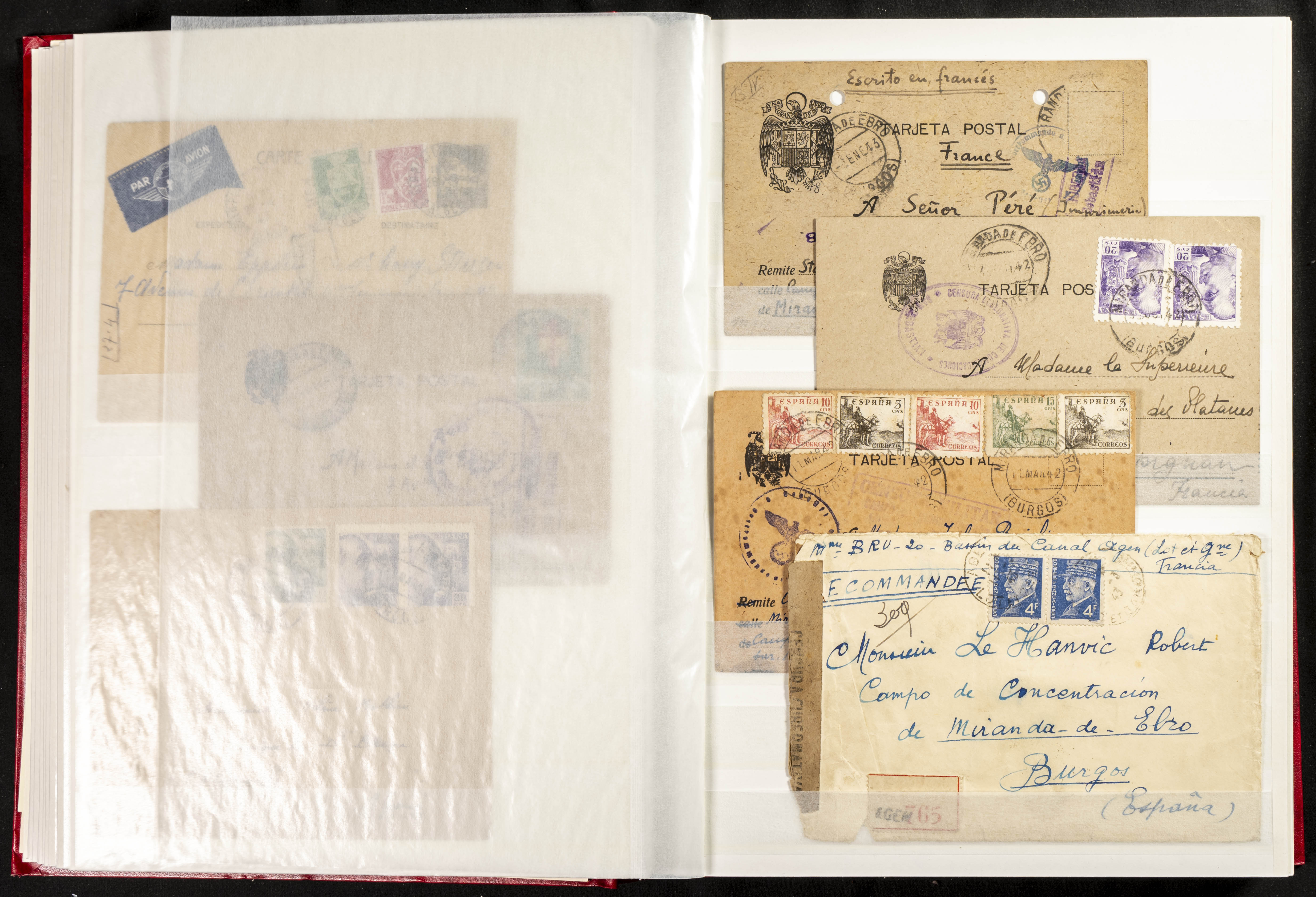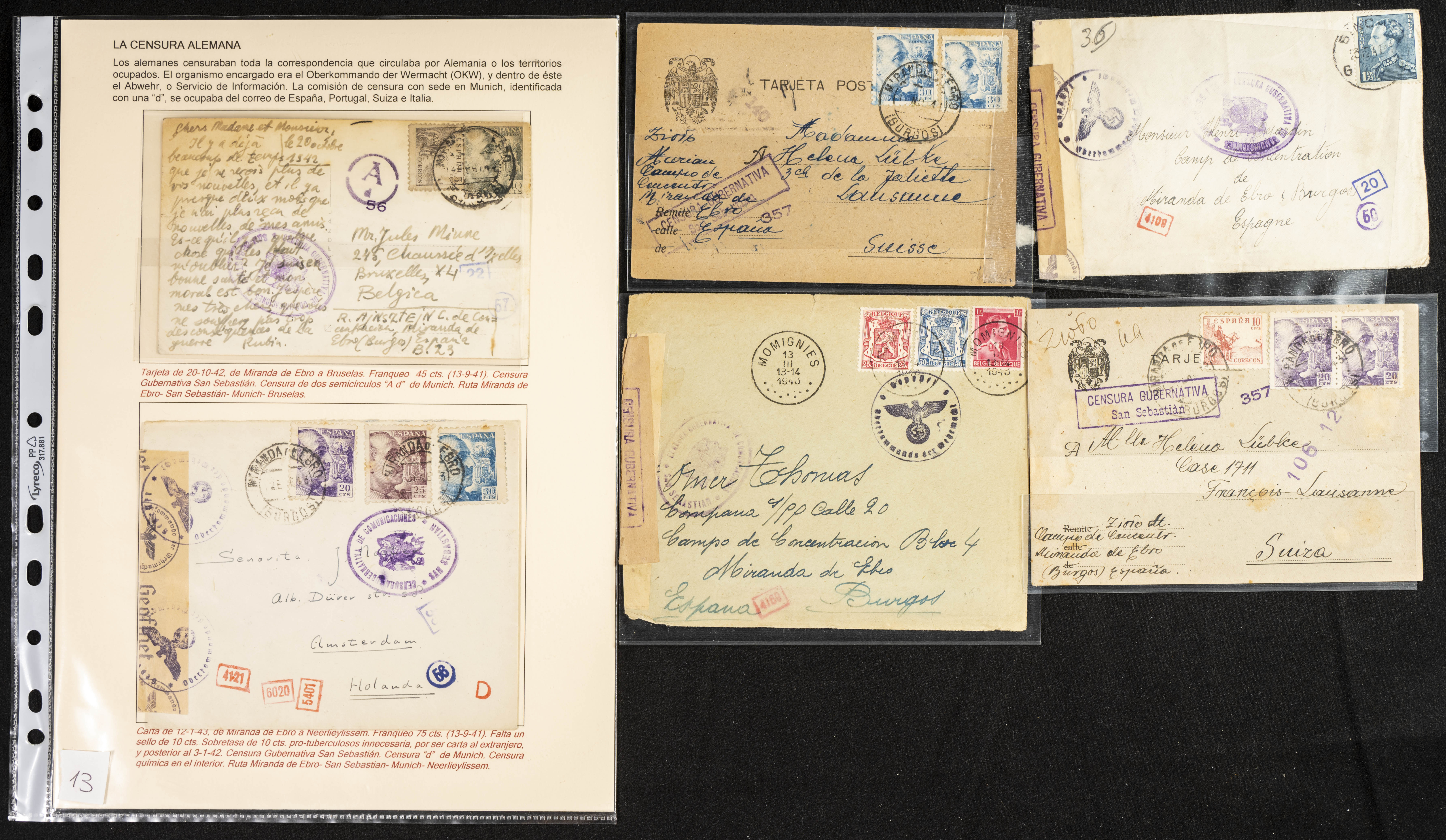 (1937ca). Espectacular colección sobre el Campo de Miranda de Ebro reunida por Estanislao Pan de Alfaro, estudiando numerosa correspondencia generada en este Campo y otros repartidos por España y Europa, incluye más de cuatrocientas cartas, tarjetas, entero postales, tarjetas entero postales, recibos, fotografías, etc, relacionadas con este campo y su periodo de funcionamiento que comienza durante la Guerra Civil y a partir de los años cuarenta sirve además como internado para extranjeros, conteniendo correspondencia de Legión Cóndor, Brigadas, Voluntarios Italianos y correspondencia extranjera, relacionada con campos de refugiados y de trabajadores extranjeros. IMPRESCINDIBLE EXAMINAR.