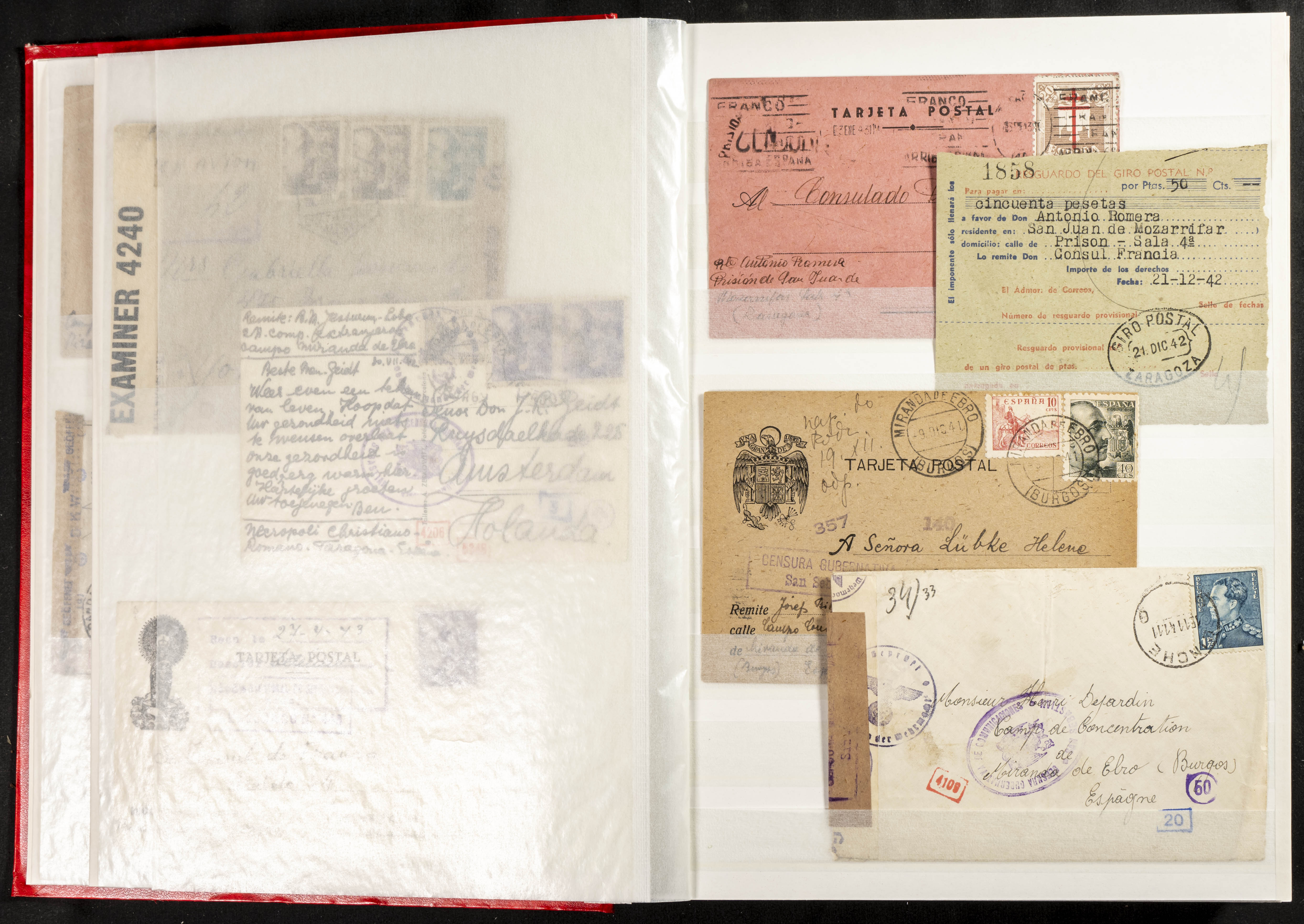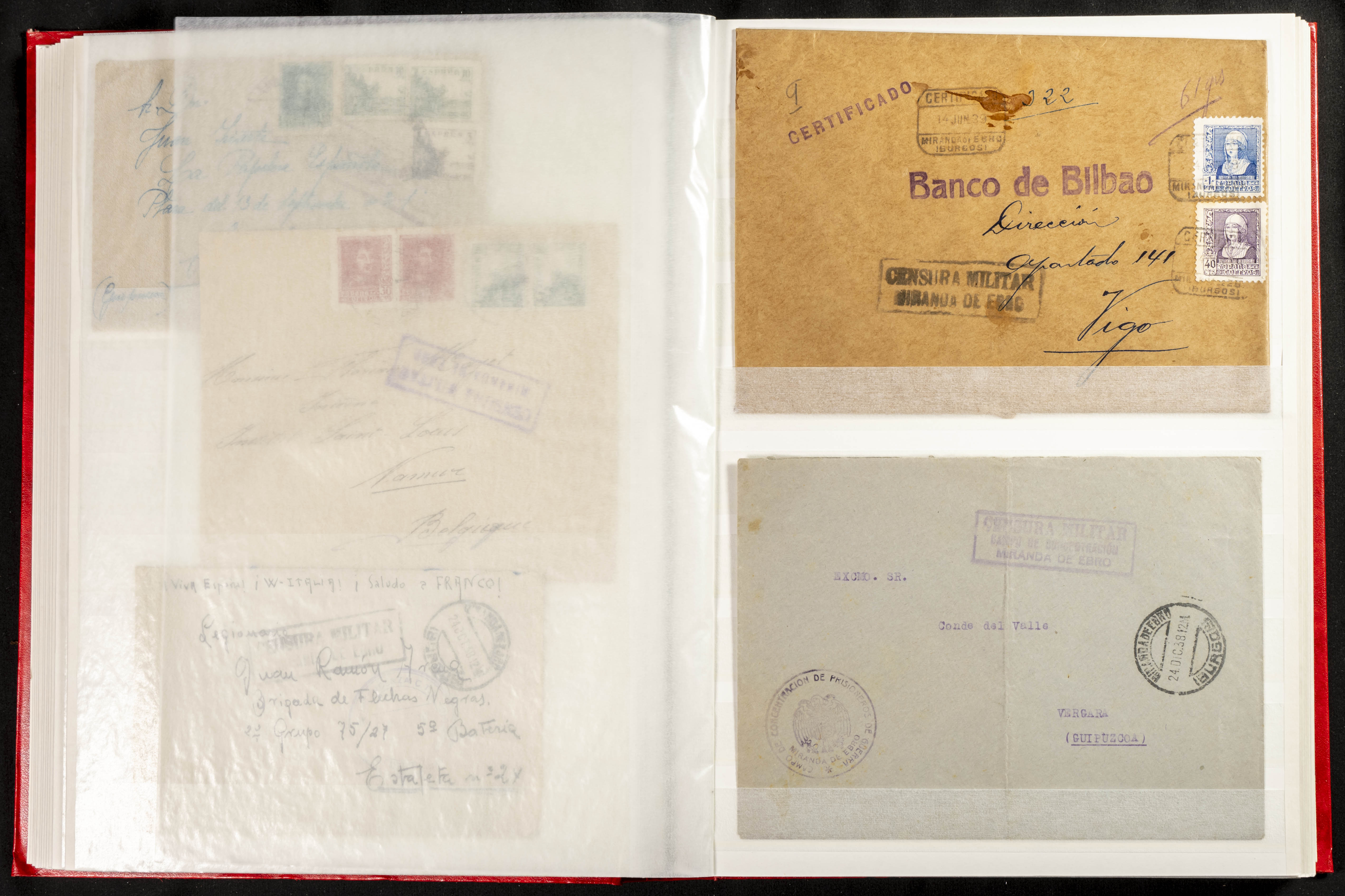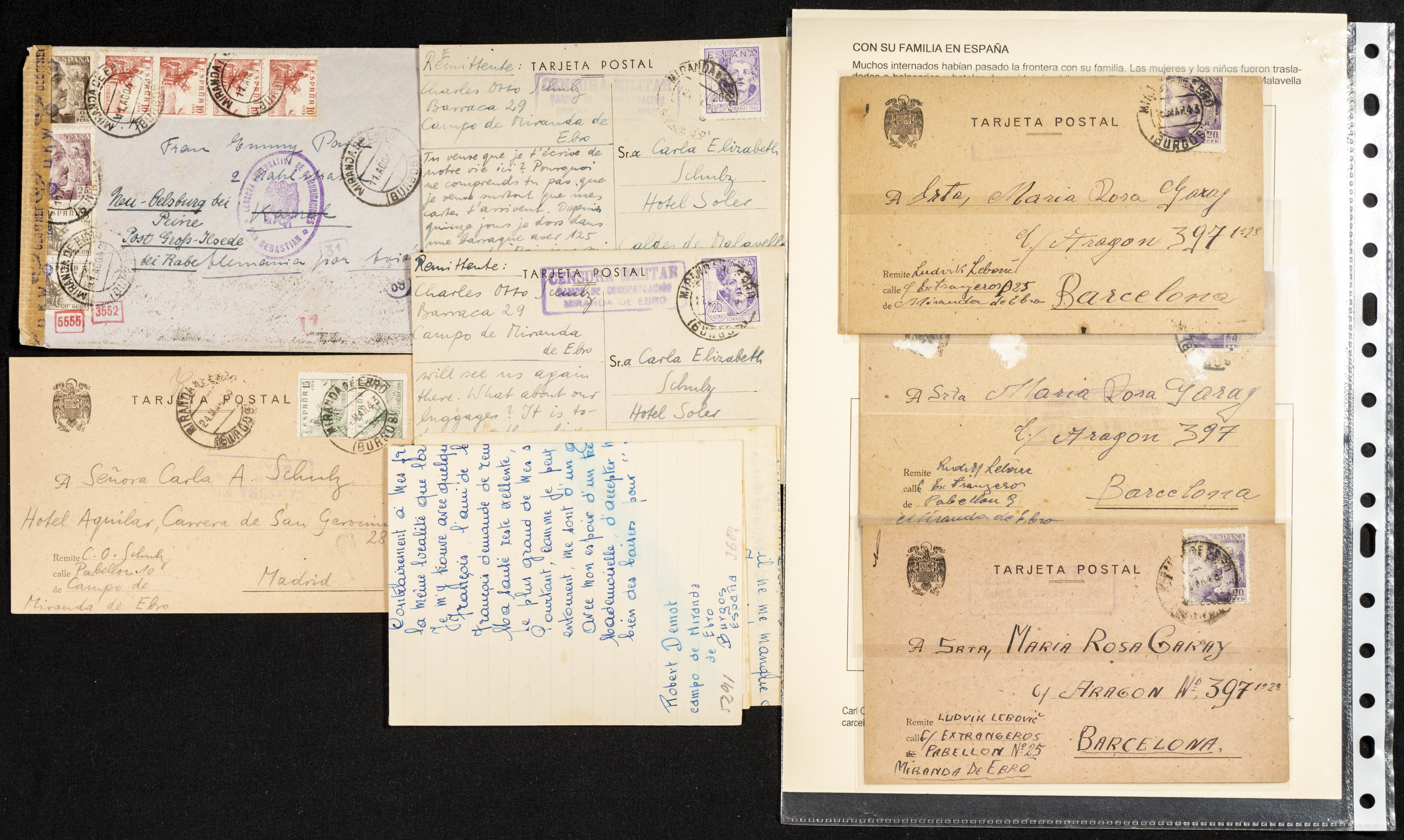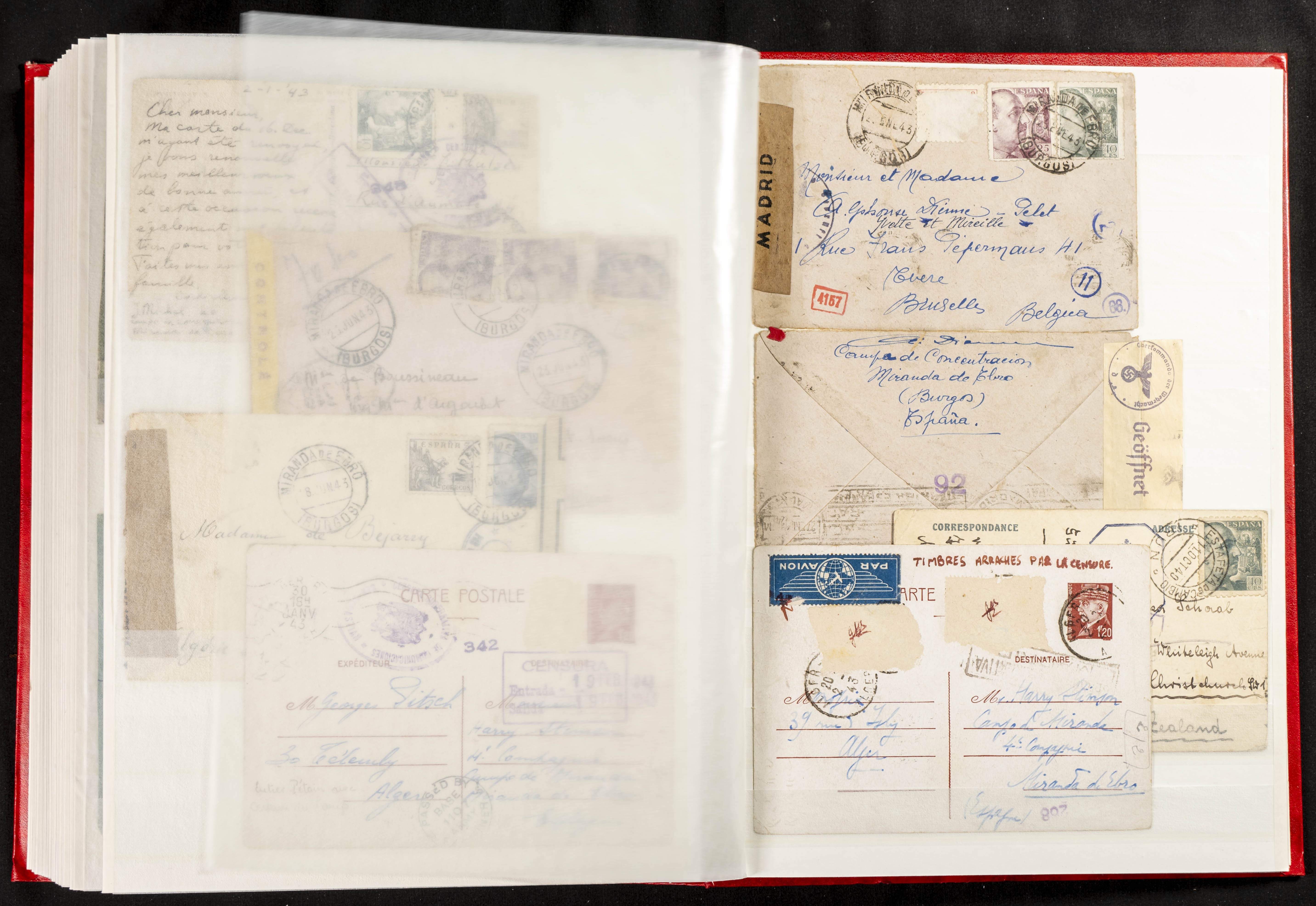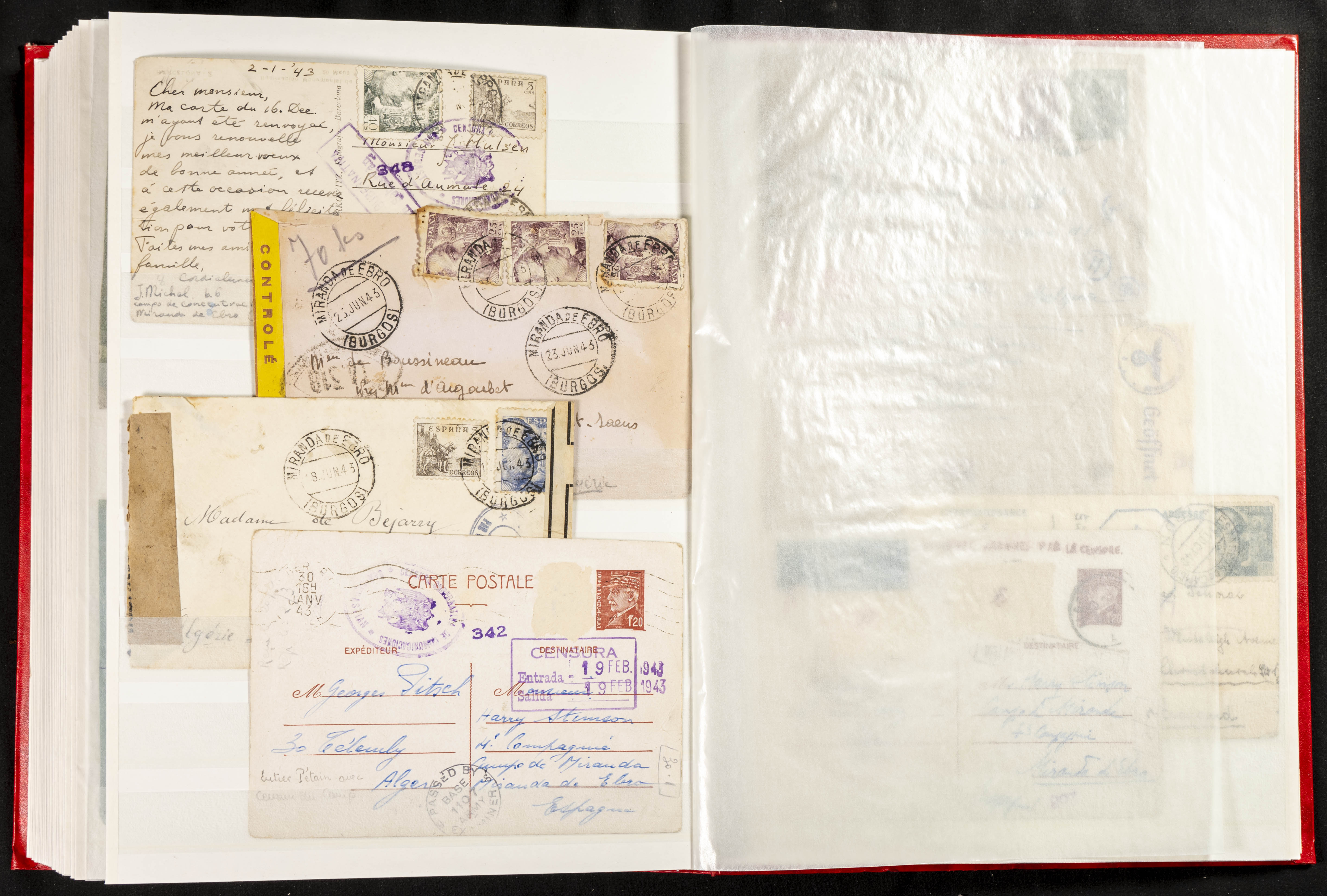 (1937ca). Espectacular colección sobre el Campo de Miranda de Ebro reunida por Estanislao Pan de Alfaro, estudiando numerosa correspondencia generada en este Campo y otros repartidos por España y Europa, incluye más de cuatrocientas cartas, tarjetas, entero postales, tarjetas entero postales, recibos, fotografías, etc, relacionadas con este campo y su periodo de funcionamiento que comienza durante la Guerra Civil y a partir de los años cuarenta sirve además como internado para extranjeros, conteniendo correspondencia de Legión Cóndor, Brigadas, Voluntarios Italianos y correspondencia extranjera, relacionada con campos de refugiados y de trabajadores extranjeros. IMPRESCINDIBLE EXAMINAR.