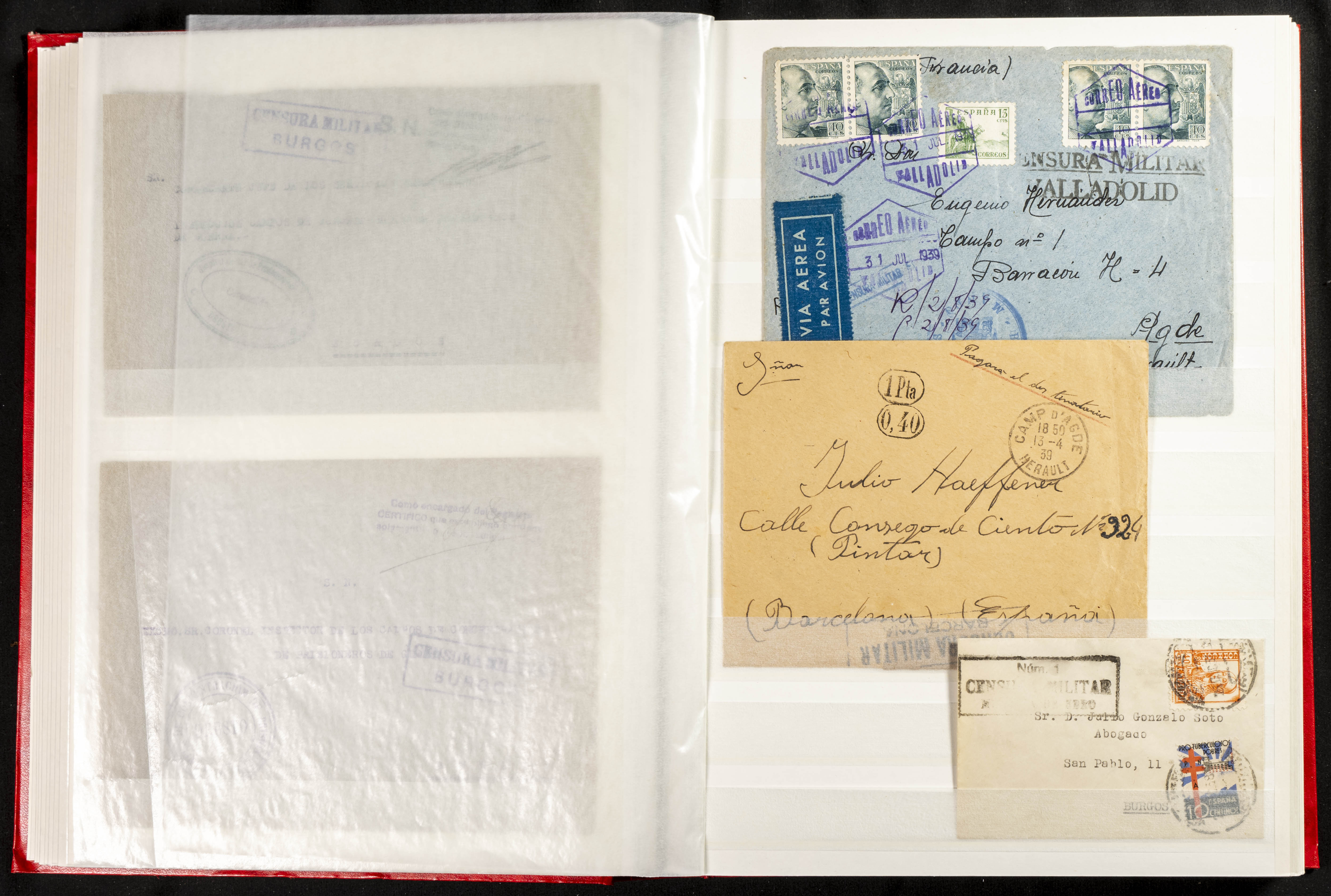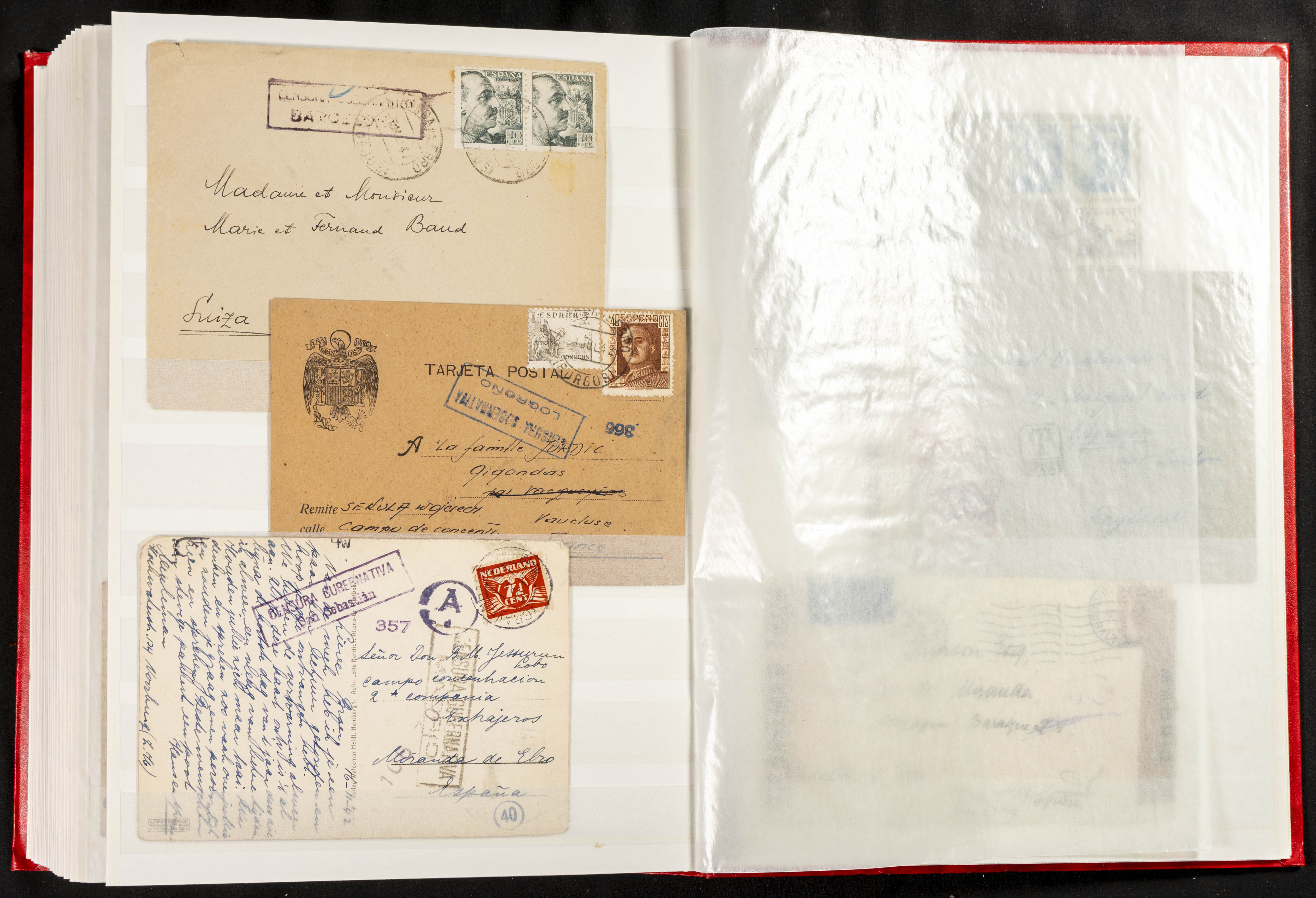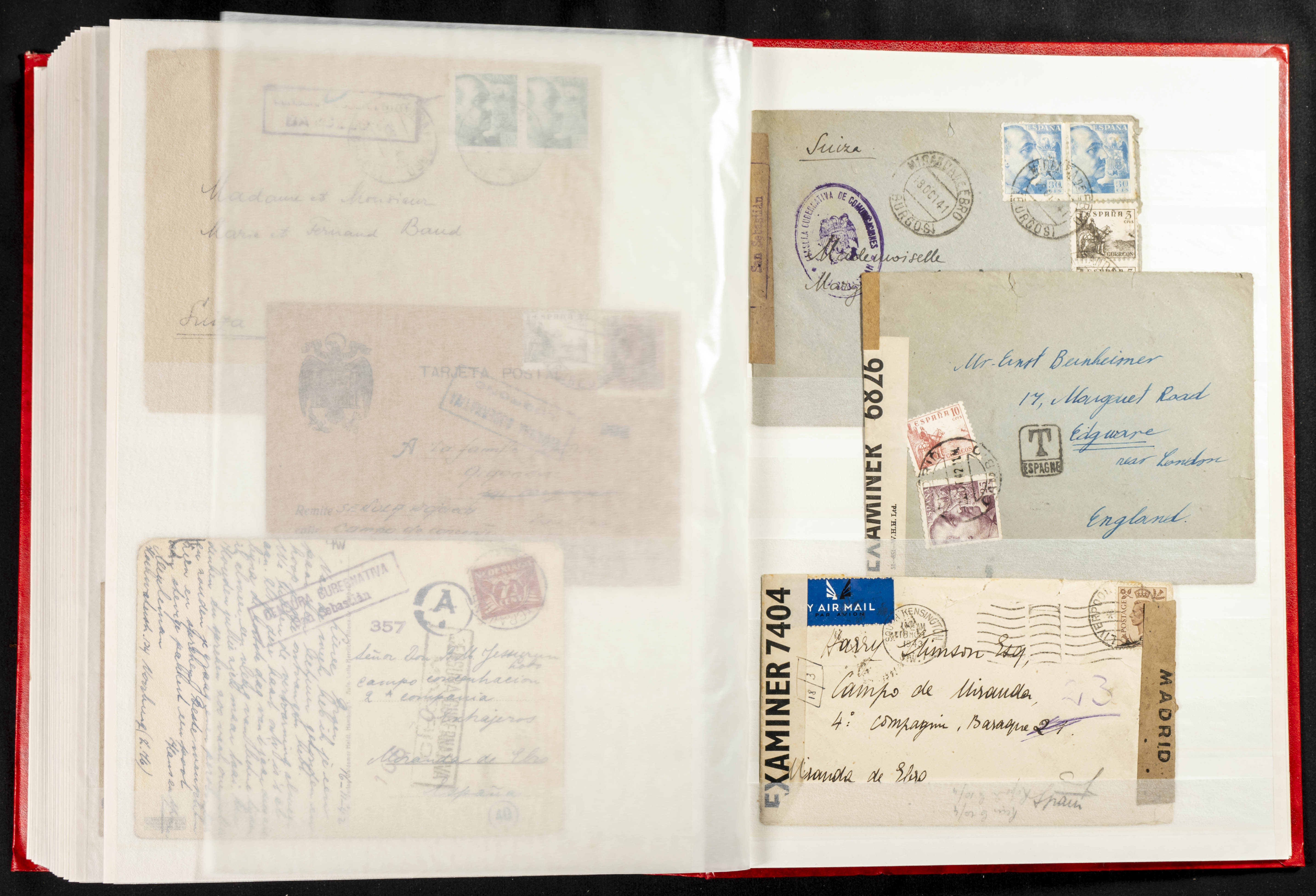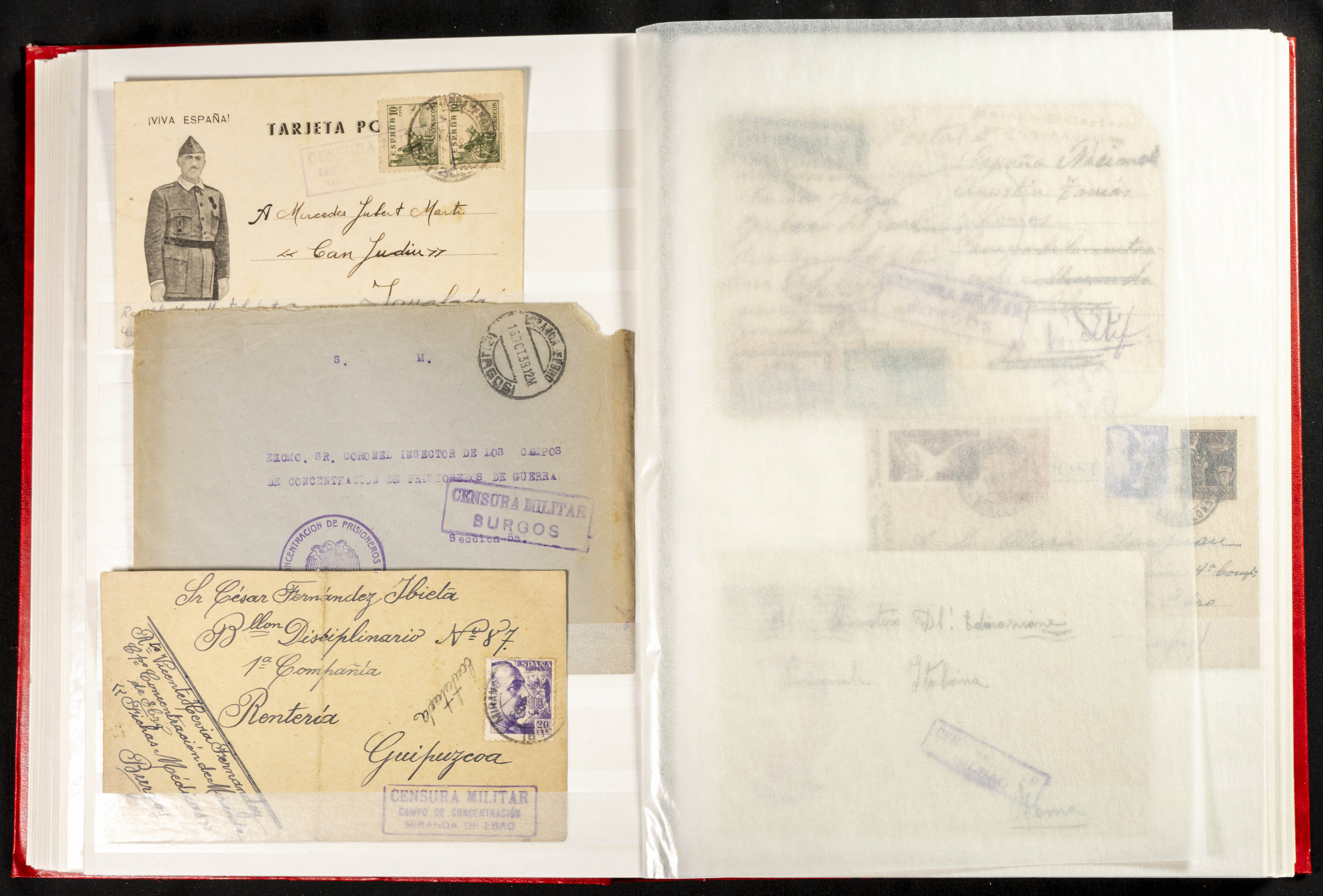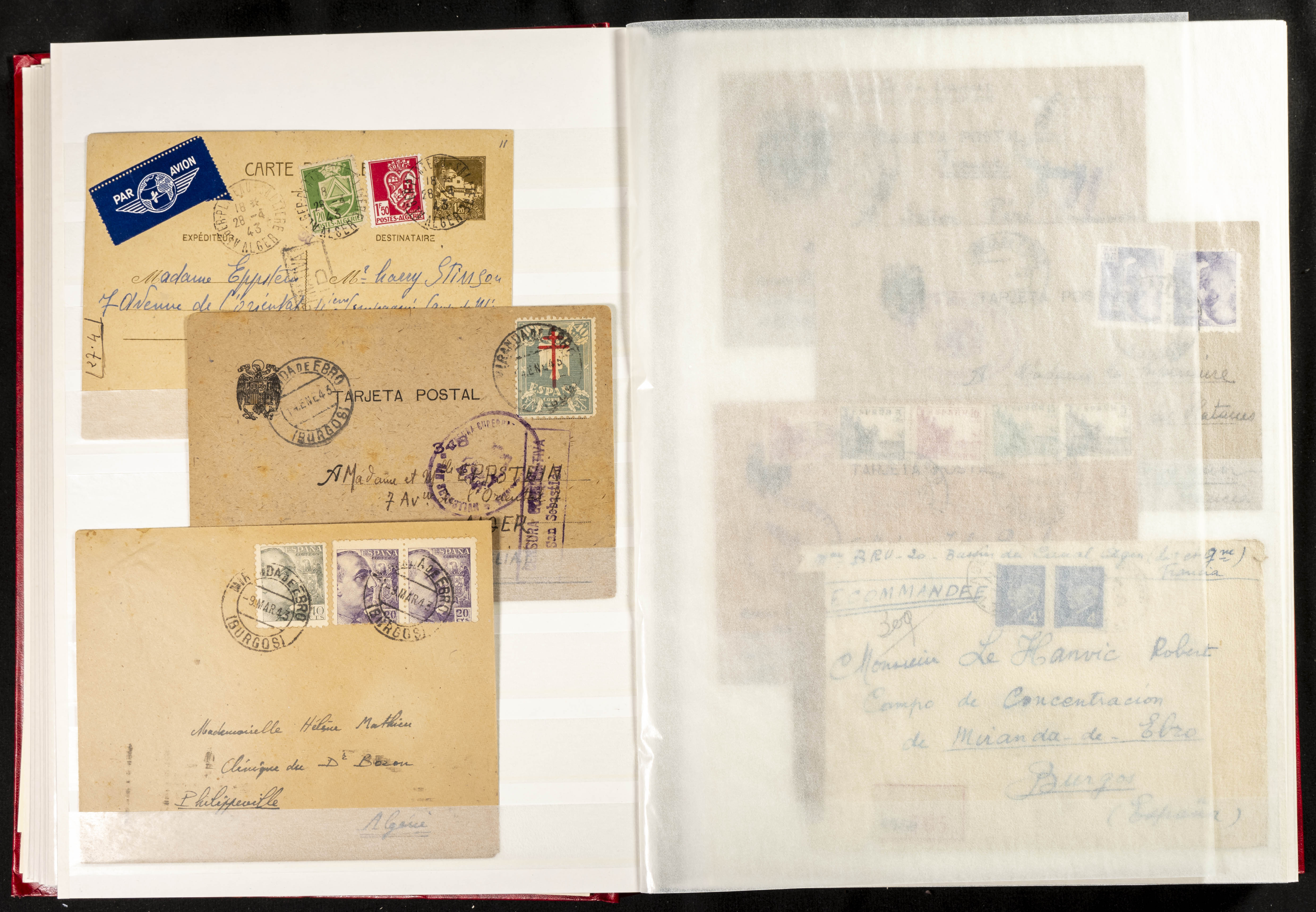 (1937ca). Espectacular colección sobre el Campo de Miranda de Ebro reunida por Estanislao Pan de Alfaro, estudiando numerosa correspondencia generada en este Campo y otros repartidos por España y Europa, incluye más de cuatrocientas cartas, tarjetas, entero postales, tarjetas entero postales, recibos, fotografías, etc, relacionadas con este campo y su periodo de funcionamiento que comienza durante la Guerra Civil y a partir de los años cuarenta sirve además como internado para extranjeros, conteniendo correspondencia de Legión Cóndor, Brigadas, Voluntarios Italianos y correspondencia extranjera, relacionada con campos de refugiados y de trabajadores extranjeros. IMPRESCINDIBLE EXAMINAR.