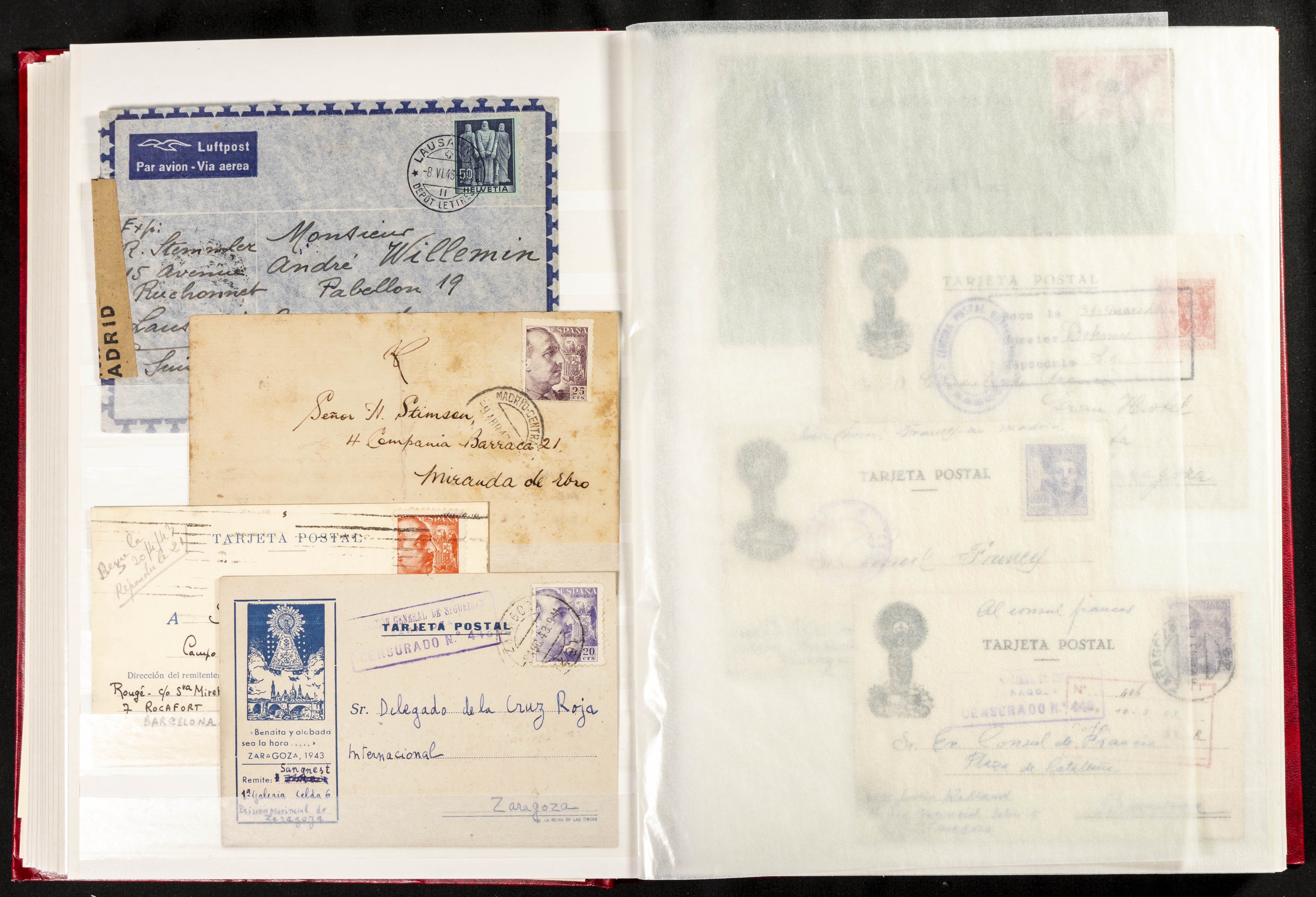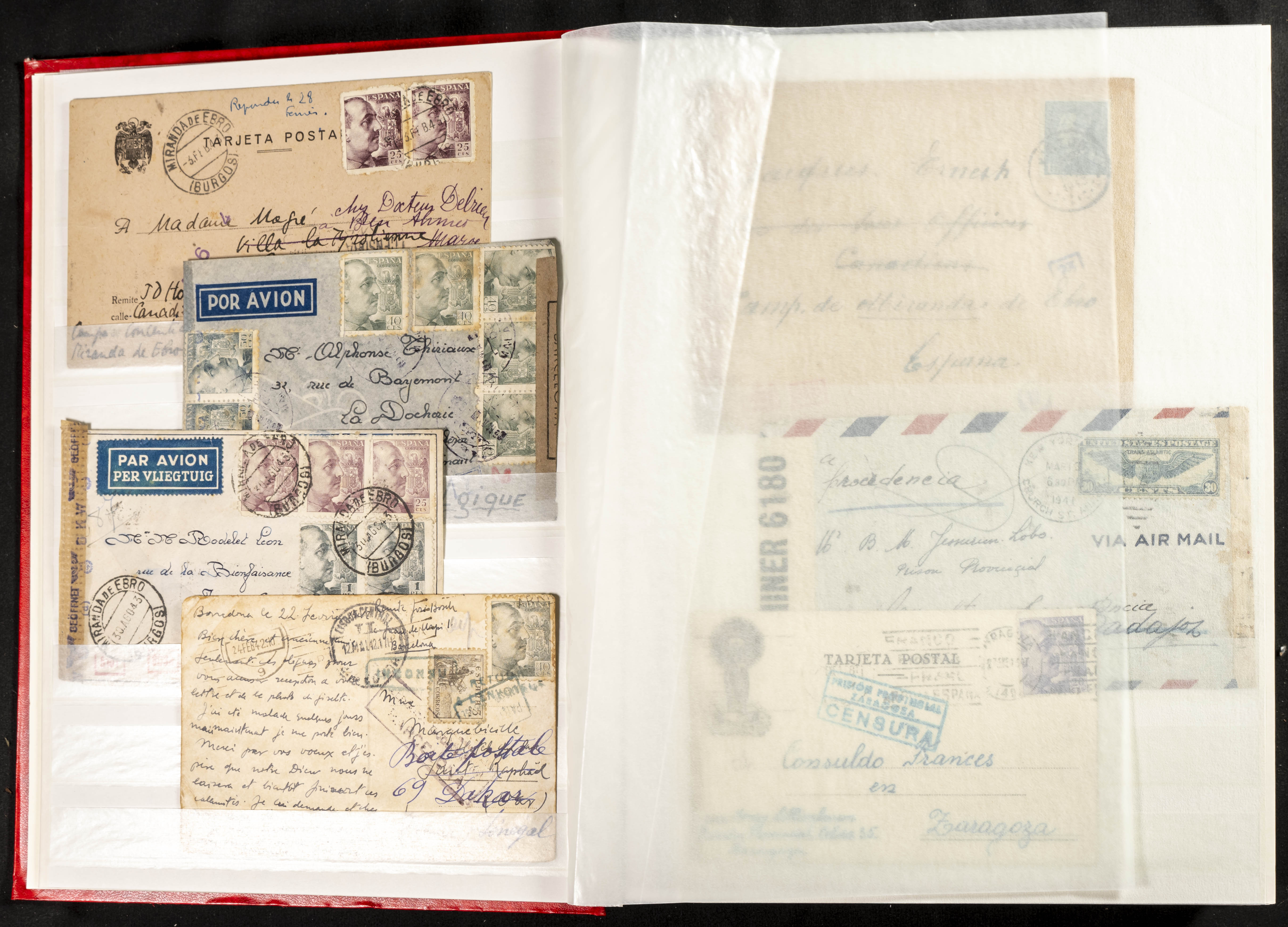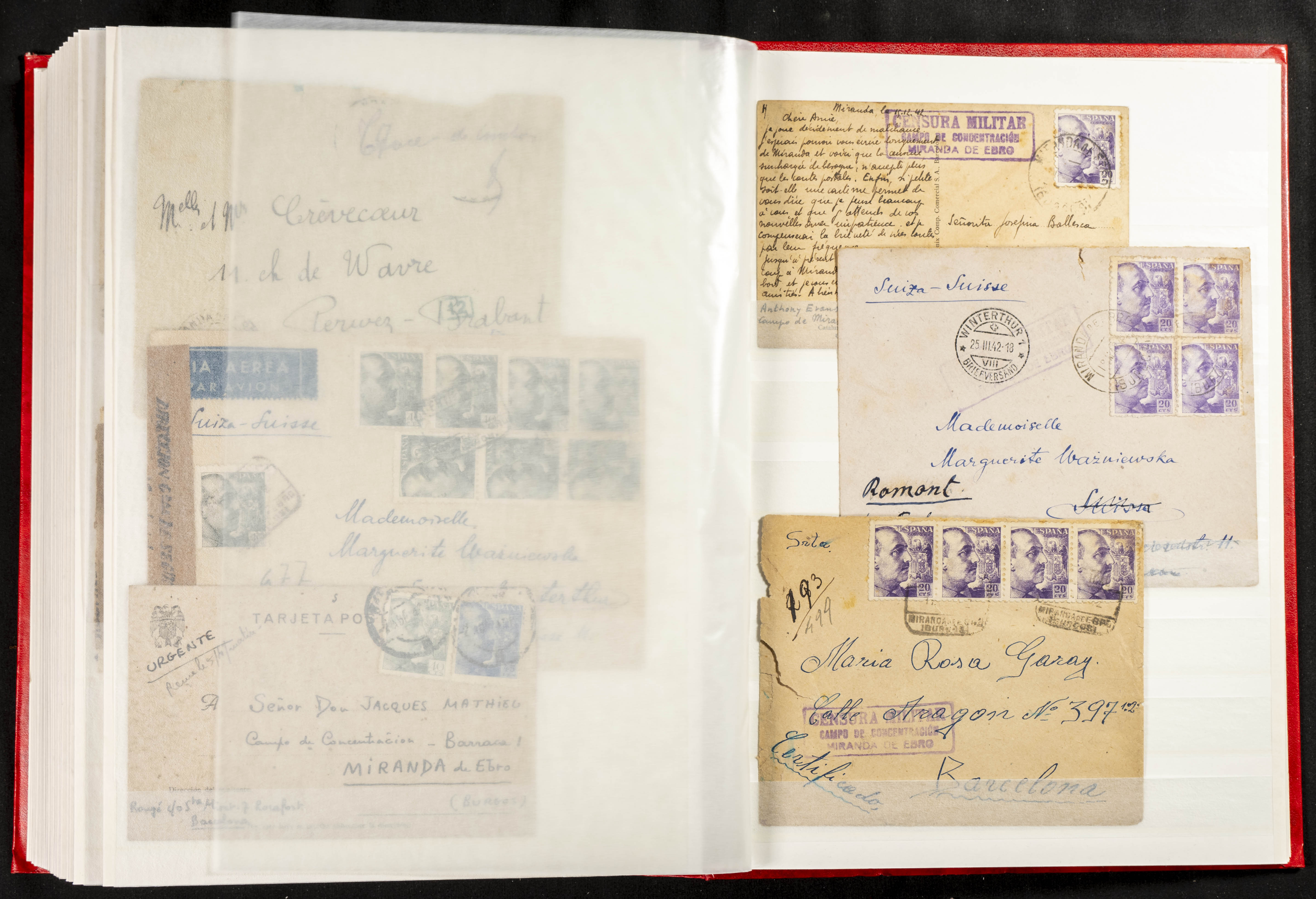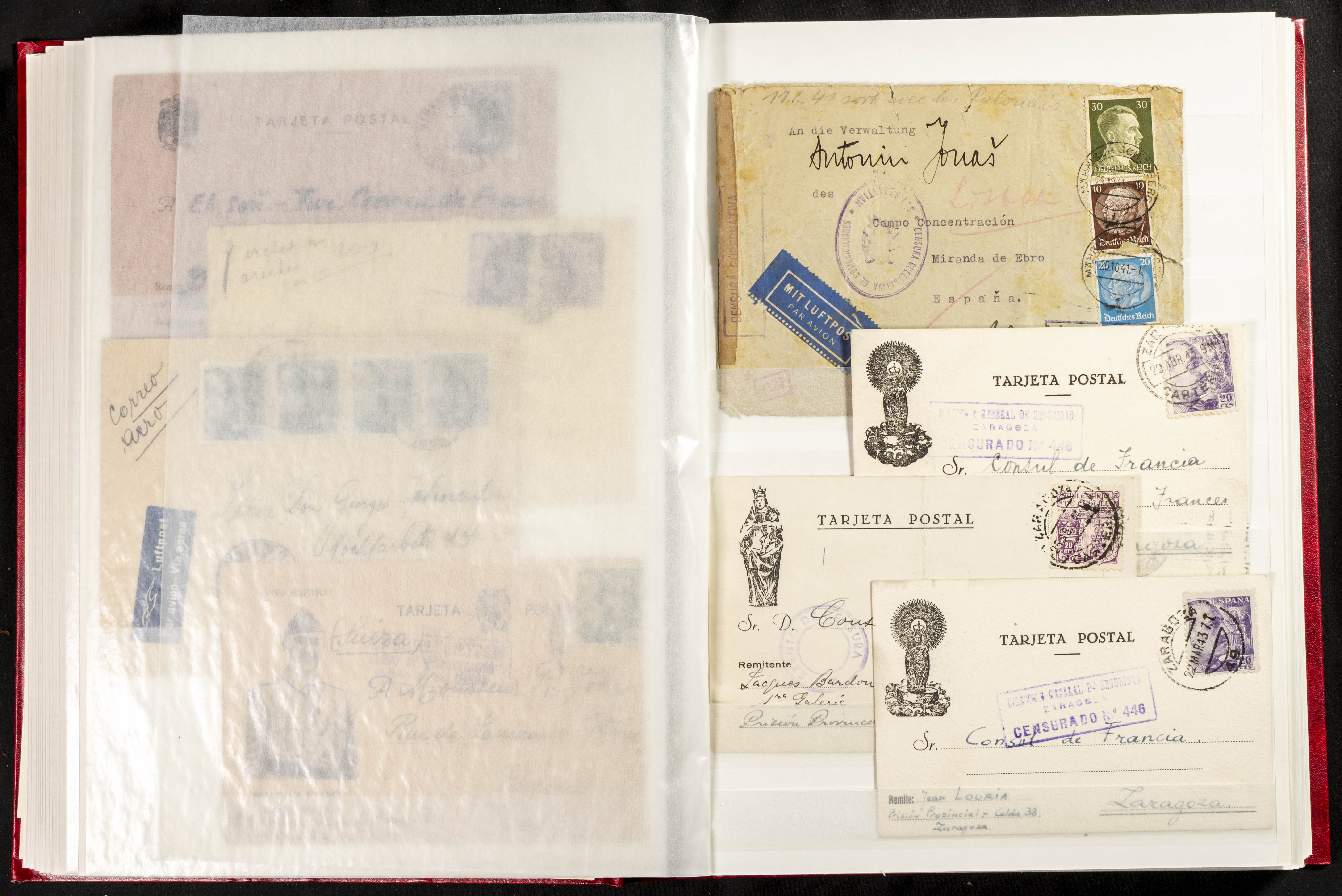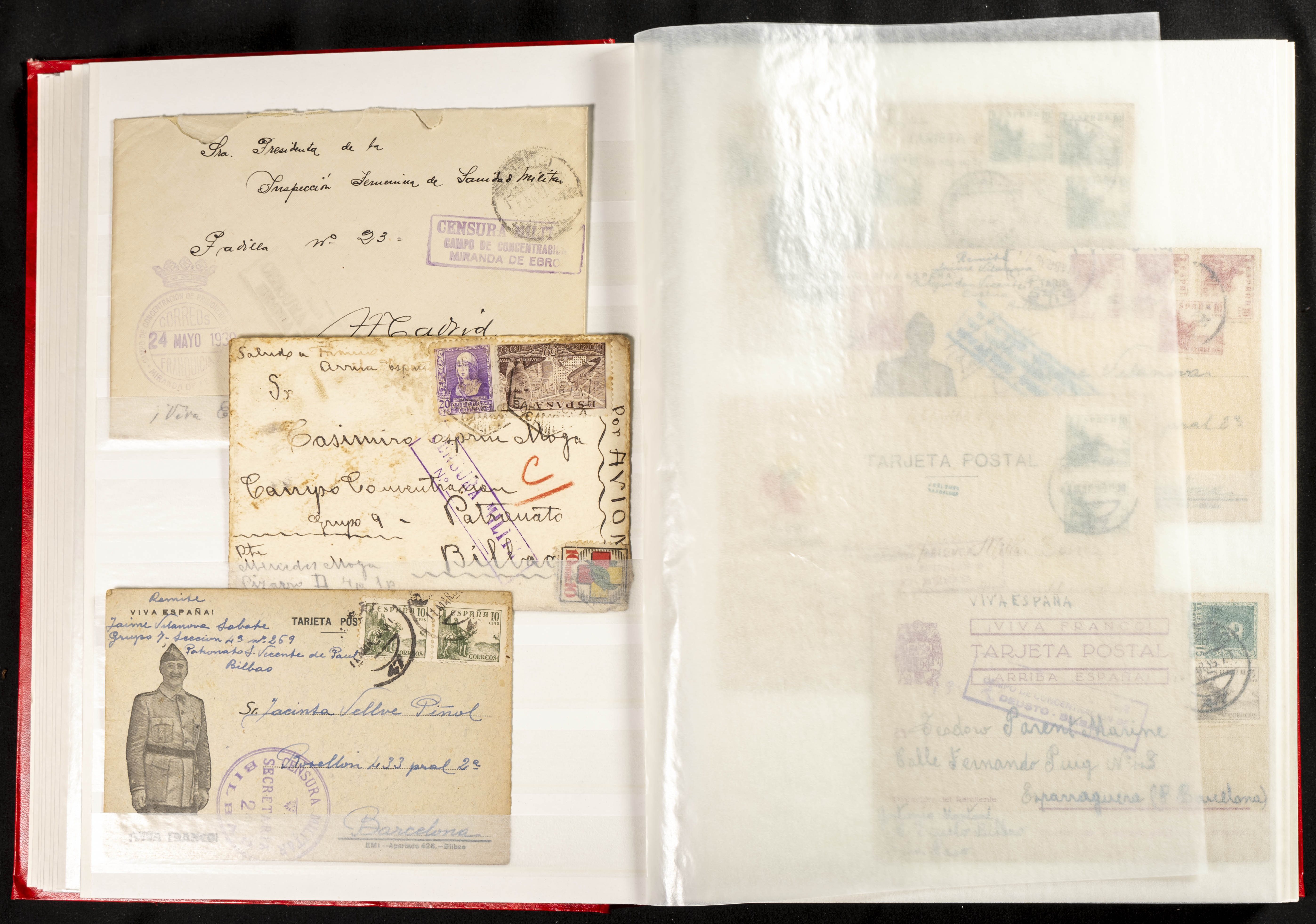 (1937ca). Espectacular colección sobre el Campo de Miranda de Ebro reunida por Estanislao Pan de Alfaro, estudiando numerosa correspondencia generada en este Campo y otros repartidos por España y Europa, incluye más de cuatrocientas cartas, tarjetas, entero postales, tarjetas entero postales, recibos, fotografías, etc, relacionadas con este campo y su periodo de funcionamiento que comienza durante la Guerra Civil y a partir de los años cuarenta sirve además como internado para extranjeros, conteniendo correspondencia de Legión Cóndor, Brigadas, Voluntarios Italianos y correspondencia extranjera, relacionada con campos de refugiados y de trabajadores extranjeros. IMPRESCINDIBLE EXAMINAR.
