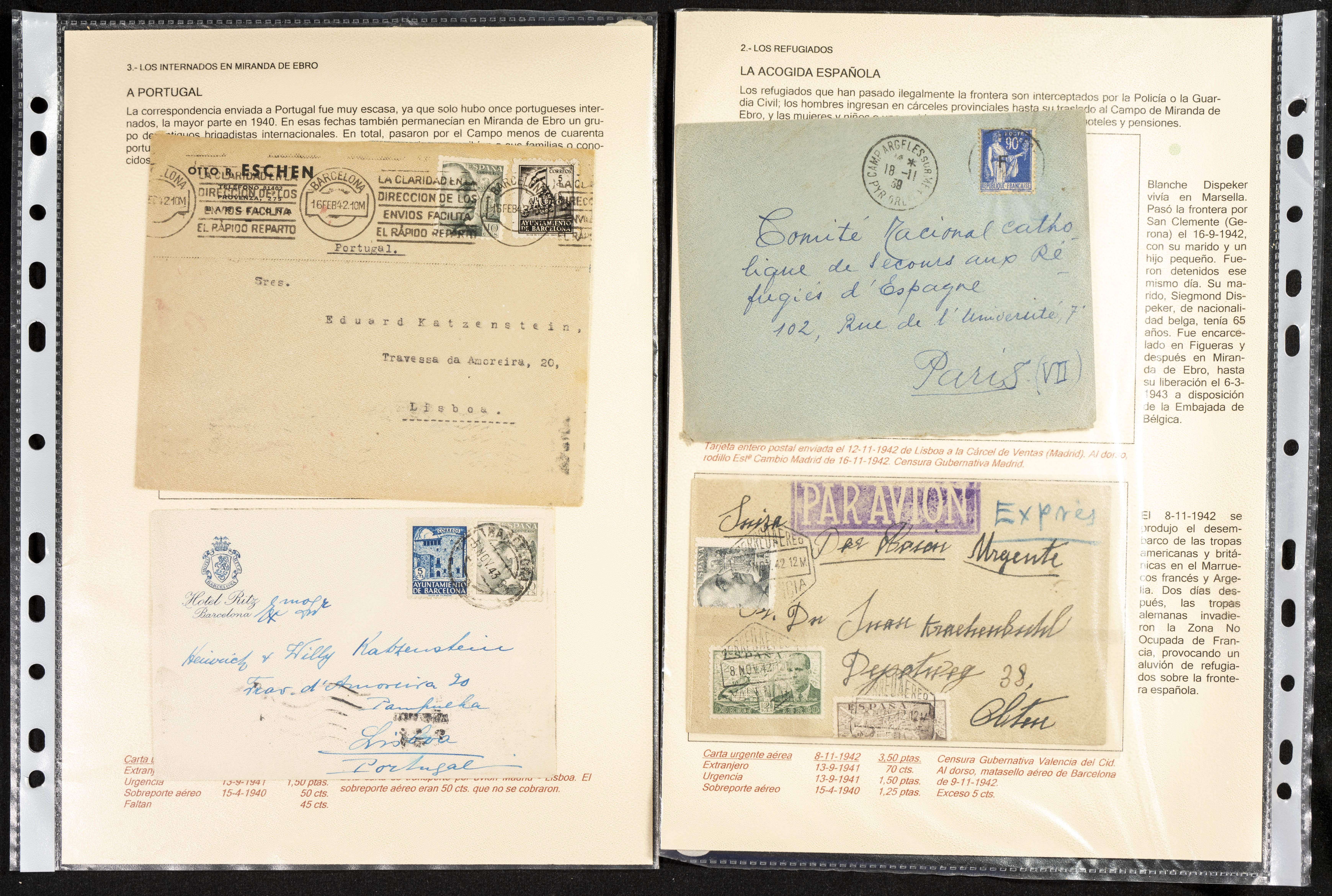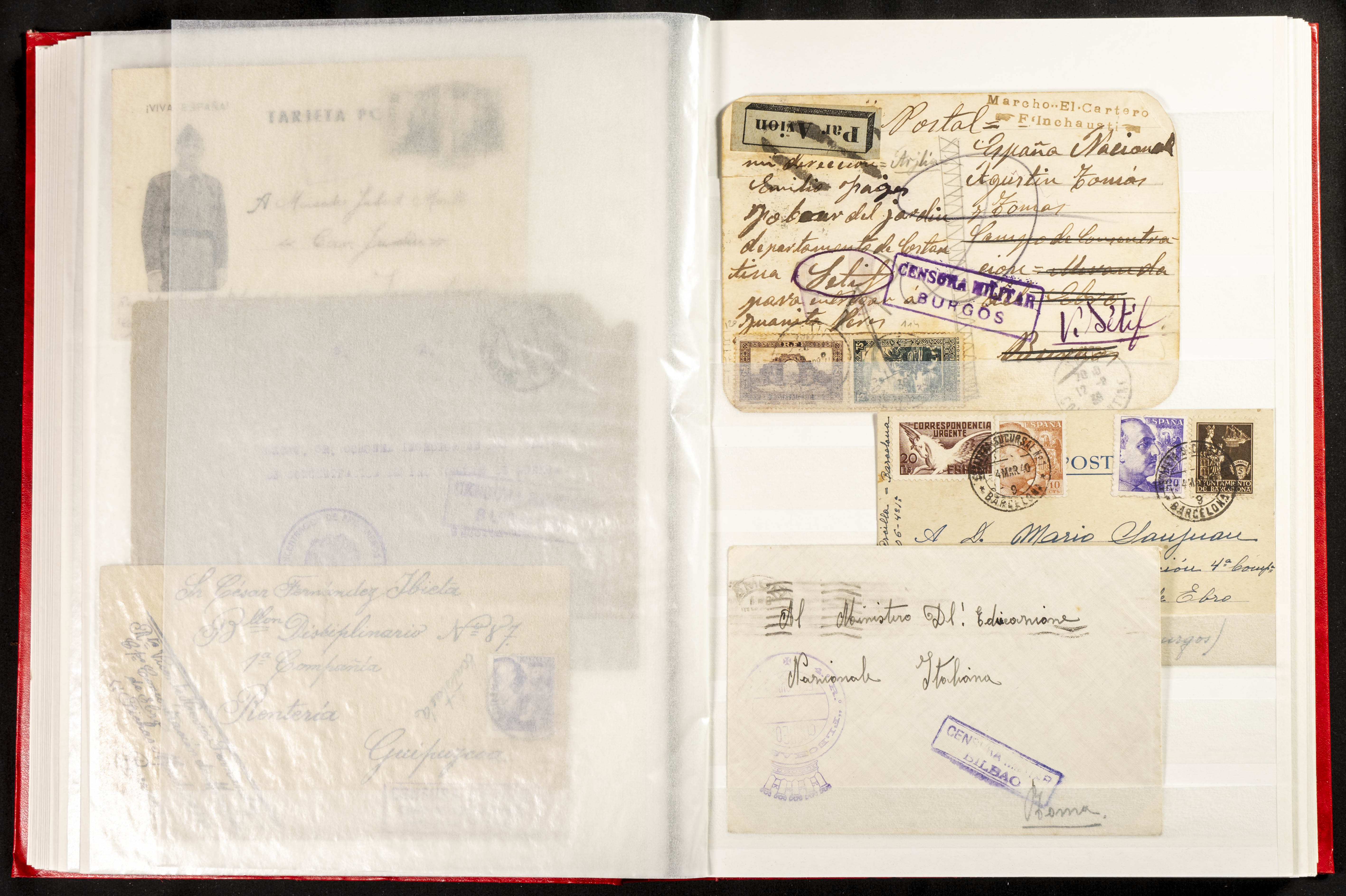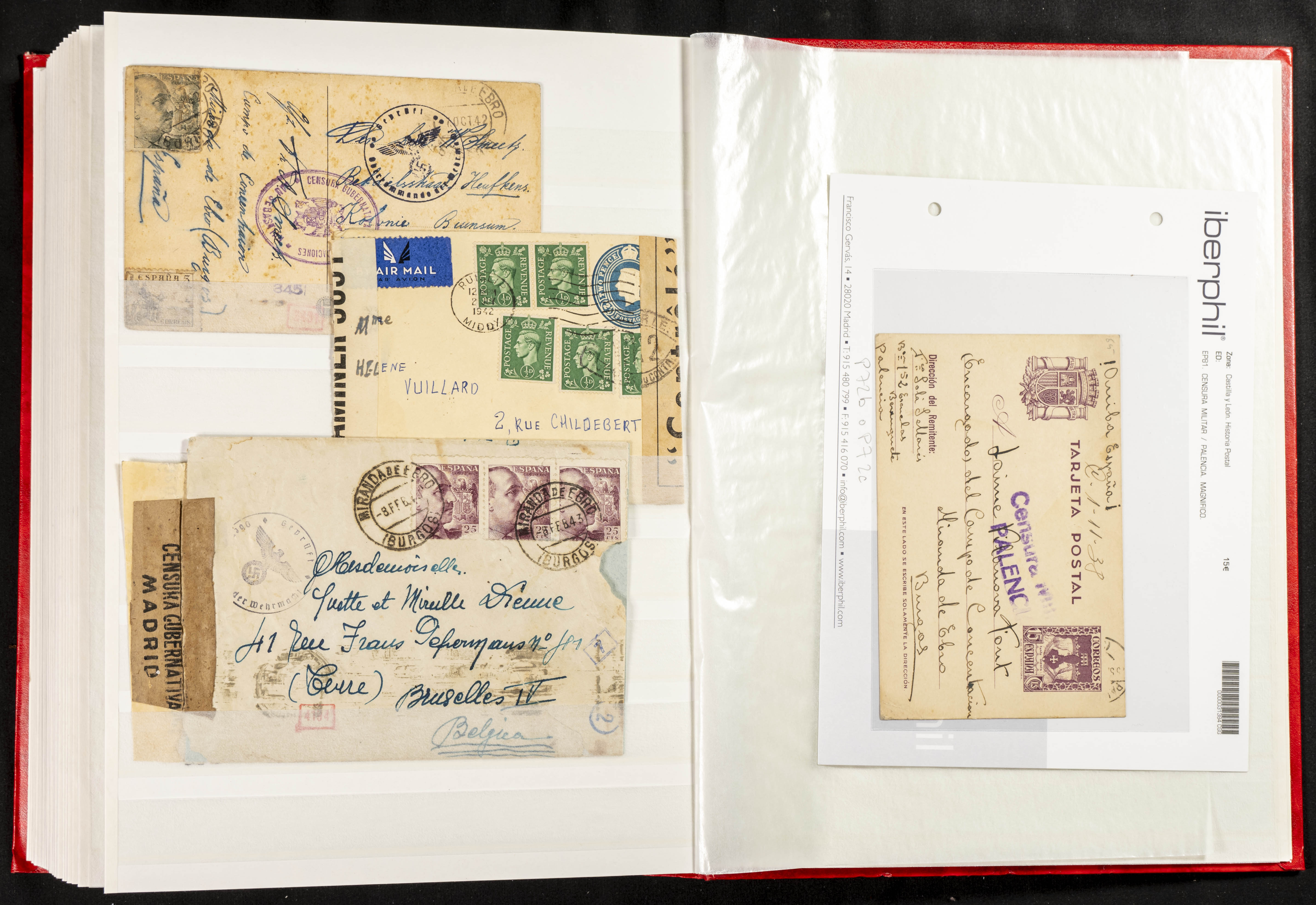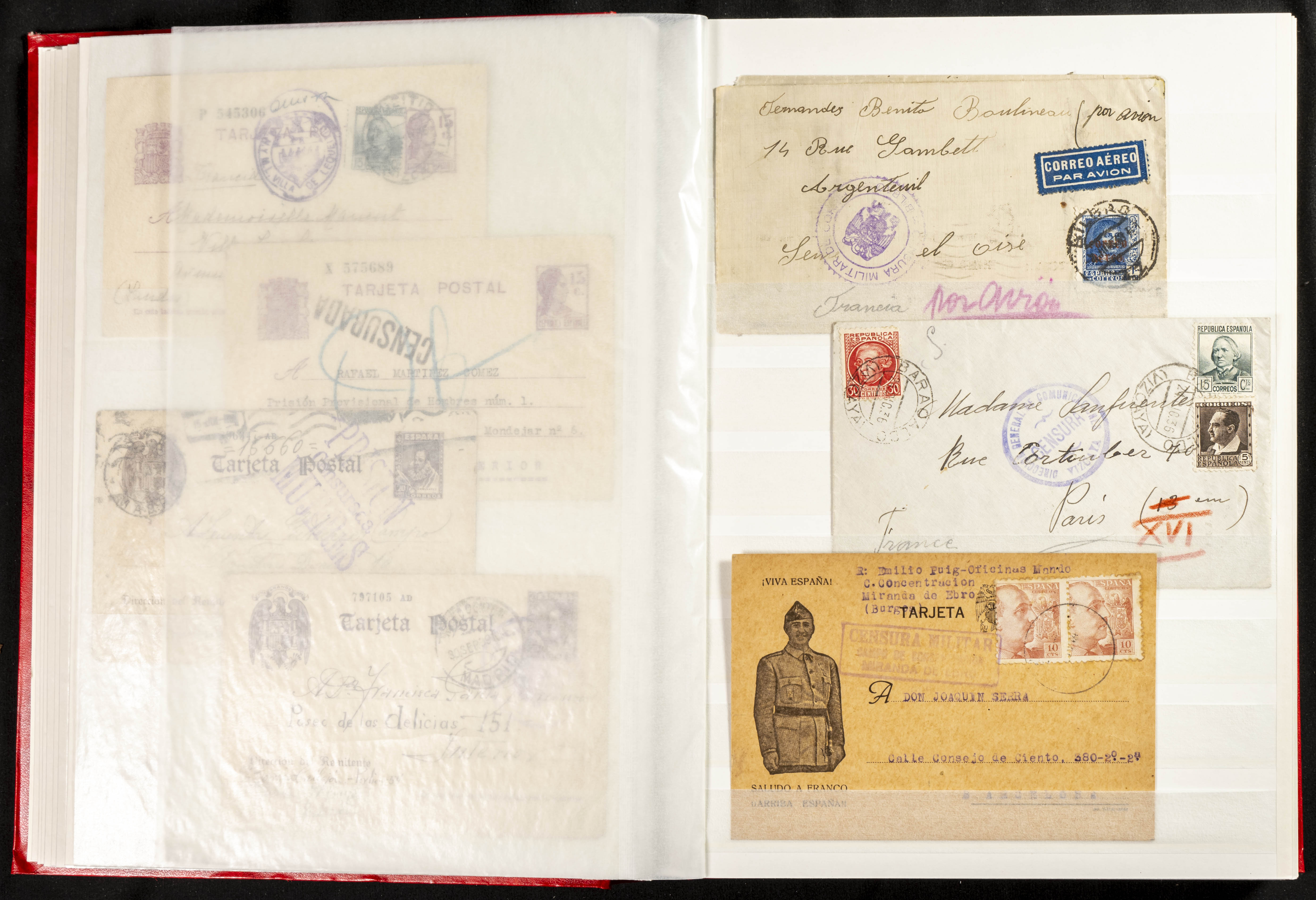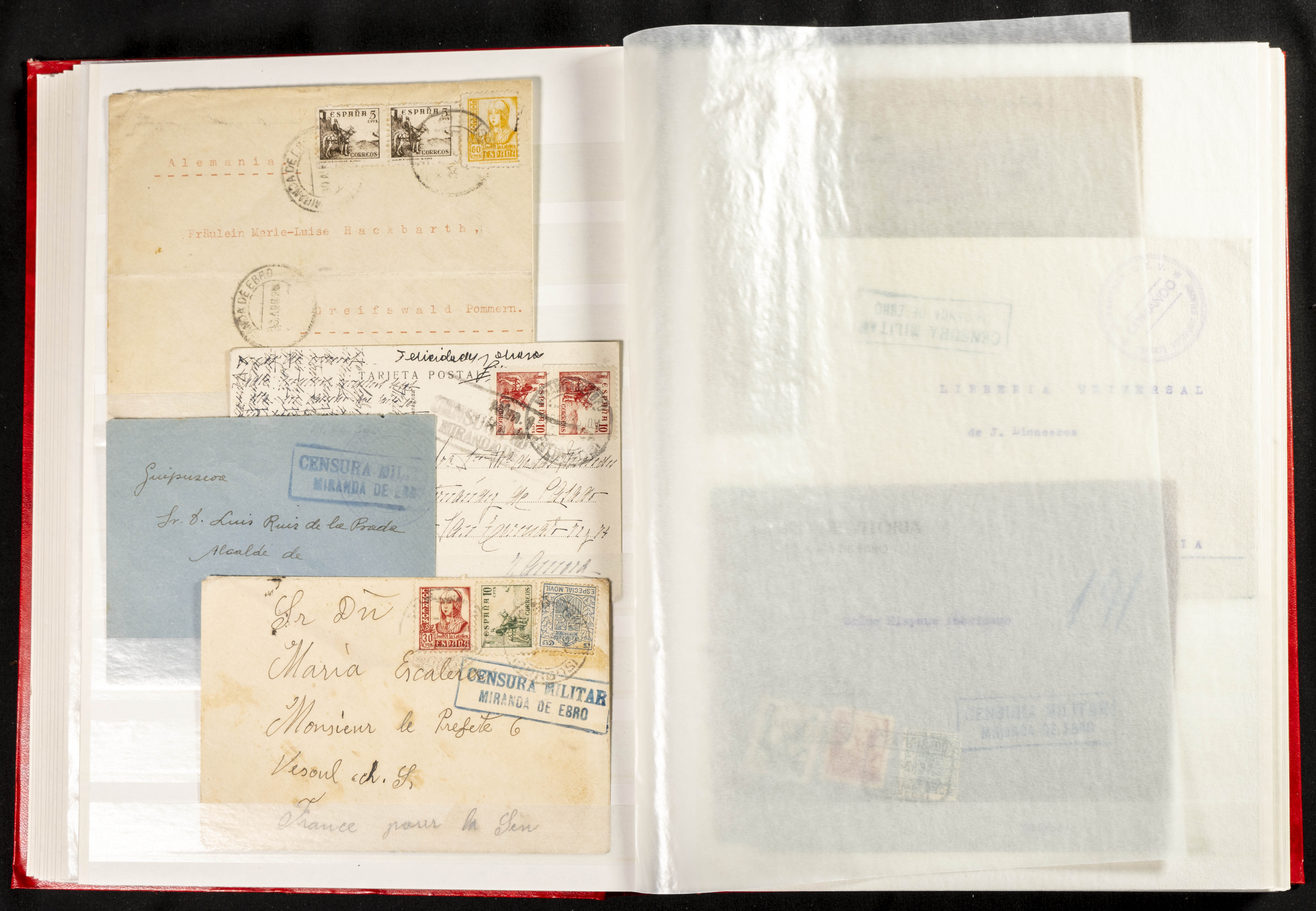 (1937ca). Espectacular colección sobre el Campo de Miranda de Ebro reunida por Estanislao Pan de Alfaro, estudiando numerosa correspondencia generada en este Campo y otros repartidos por España y Europa, incluye más de cuatrocientas cartas, tarjetas, entero postales, tarjetas entero postales, recibos, fotografías, etc, relacionadas con este campo y su periodo de funcionamiento que comienza durante la Guerra Civil y a partir de los años cuarenta sirve además como internado para extranjeros, conteniendo correspondencia de Legión Cóndor, Brigadas, Voluntarios Italianos y correspondencia extranjera, relacionada con campos de refugiados y de trabajadores extranjeros. IMPRESCINDIBLE EXAMINAR.