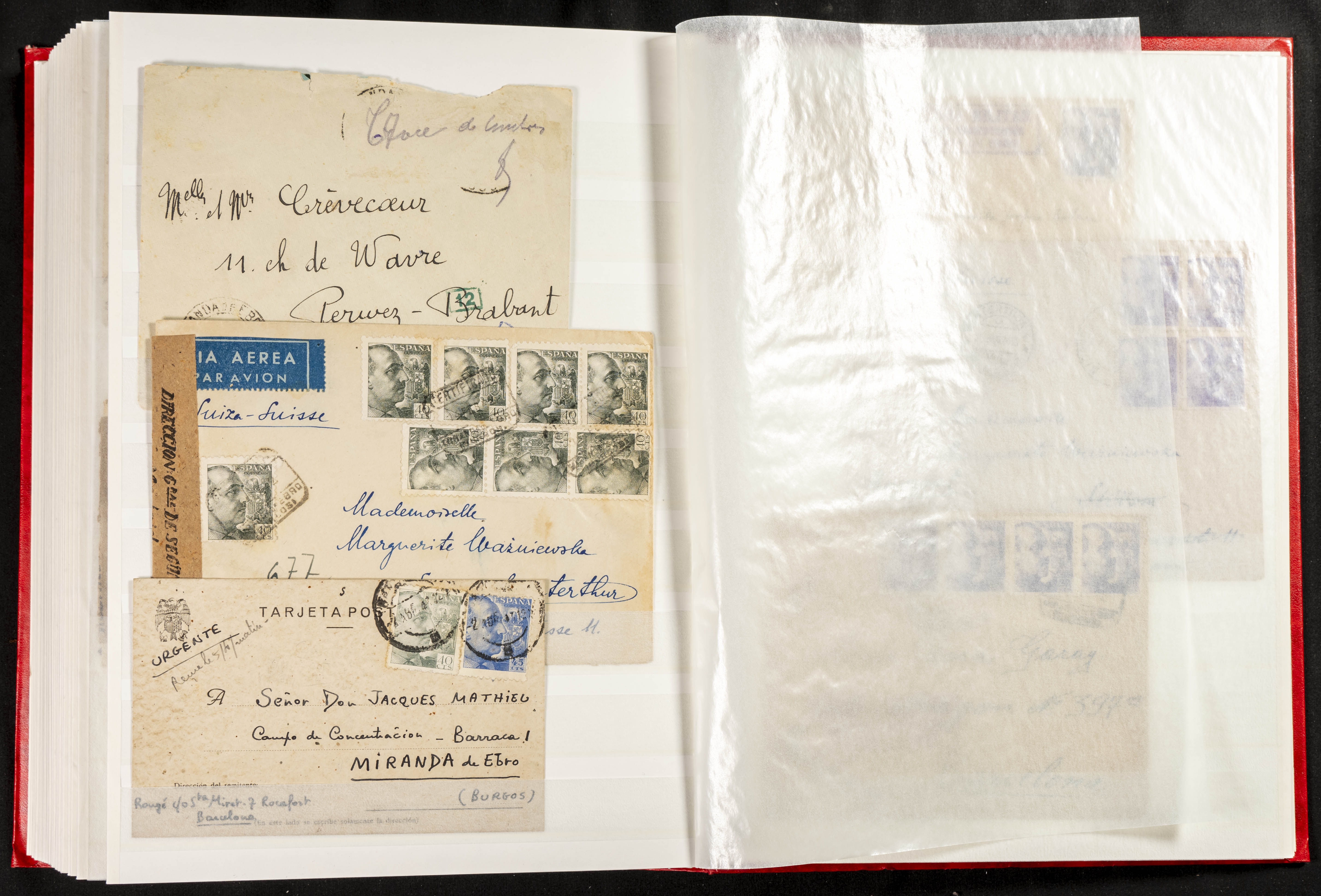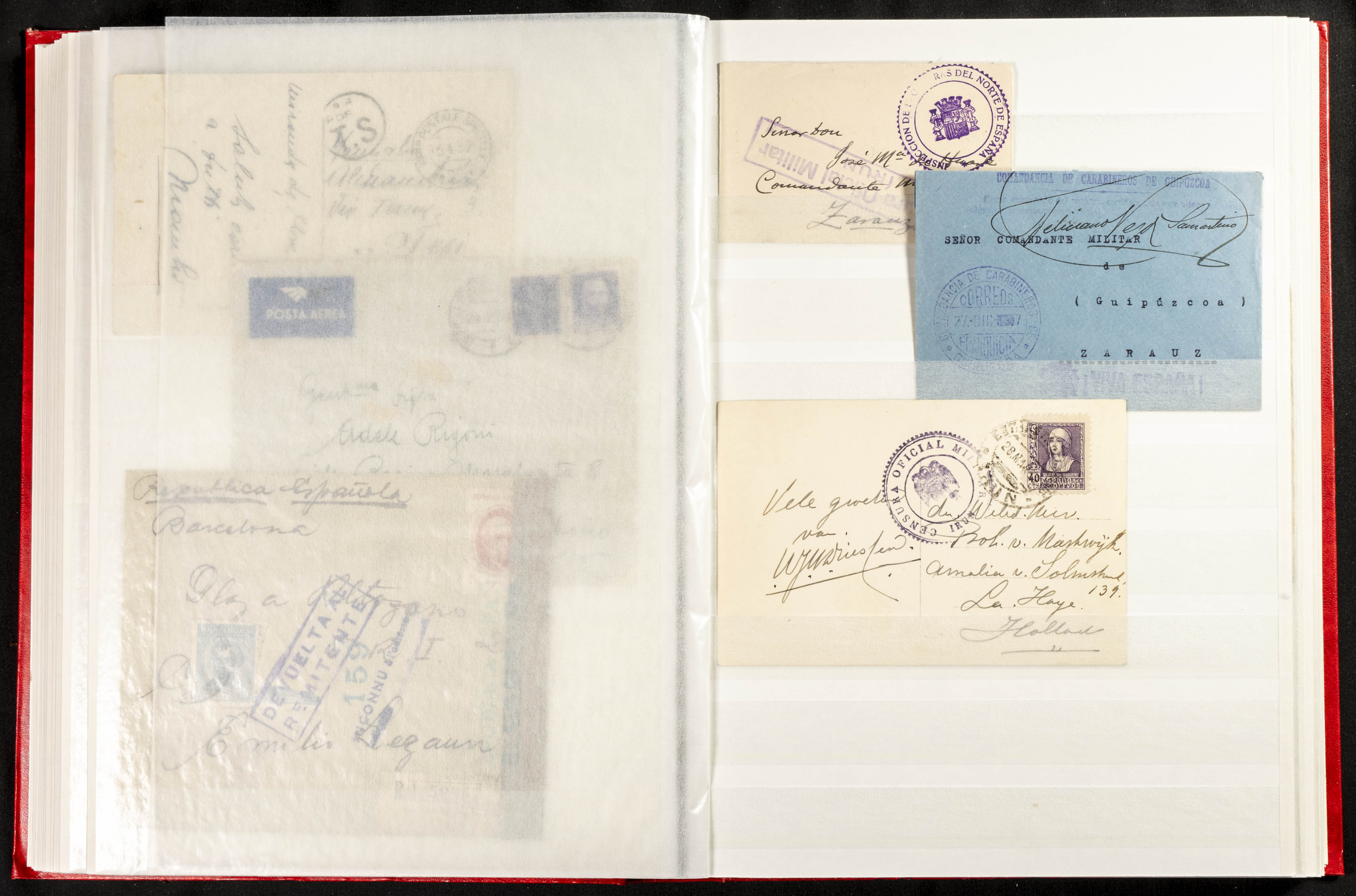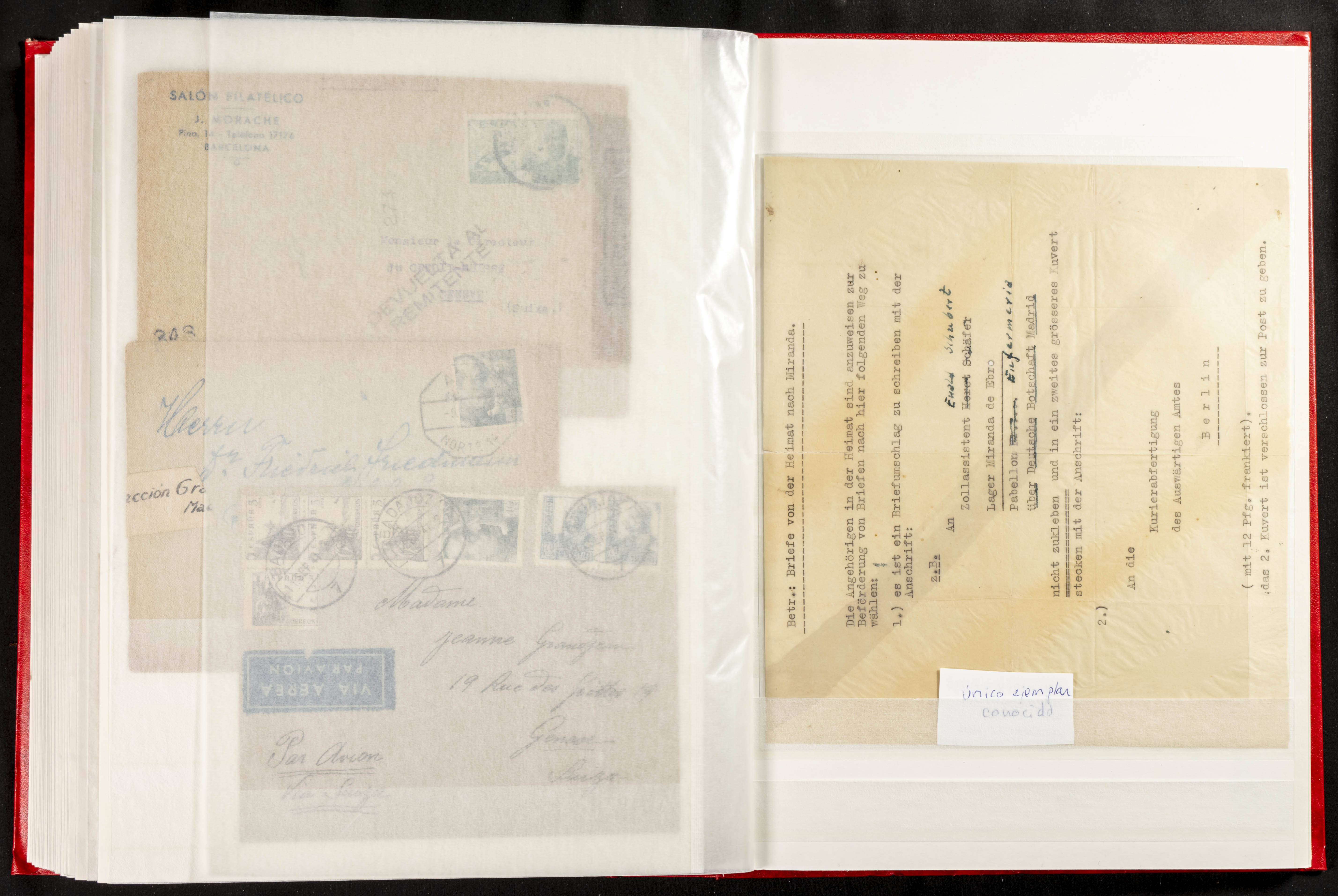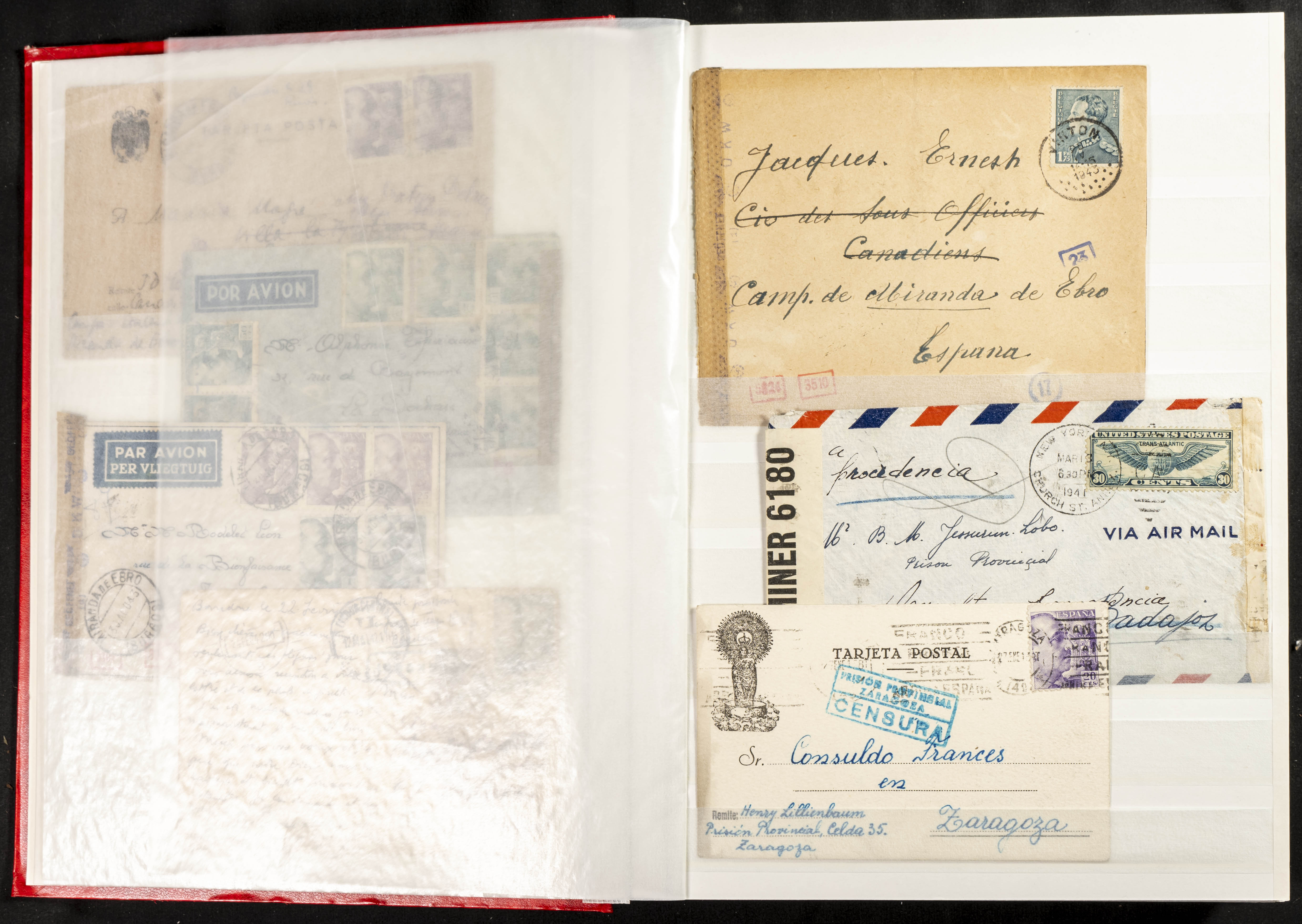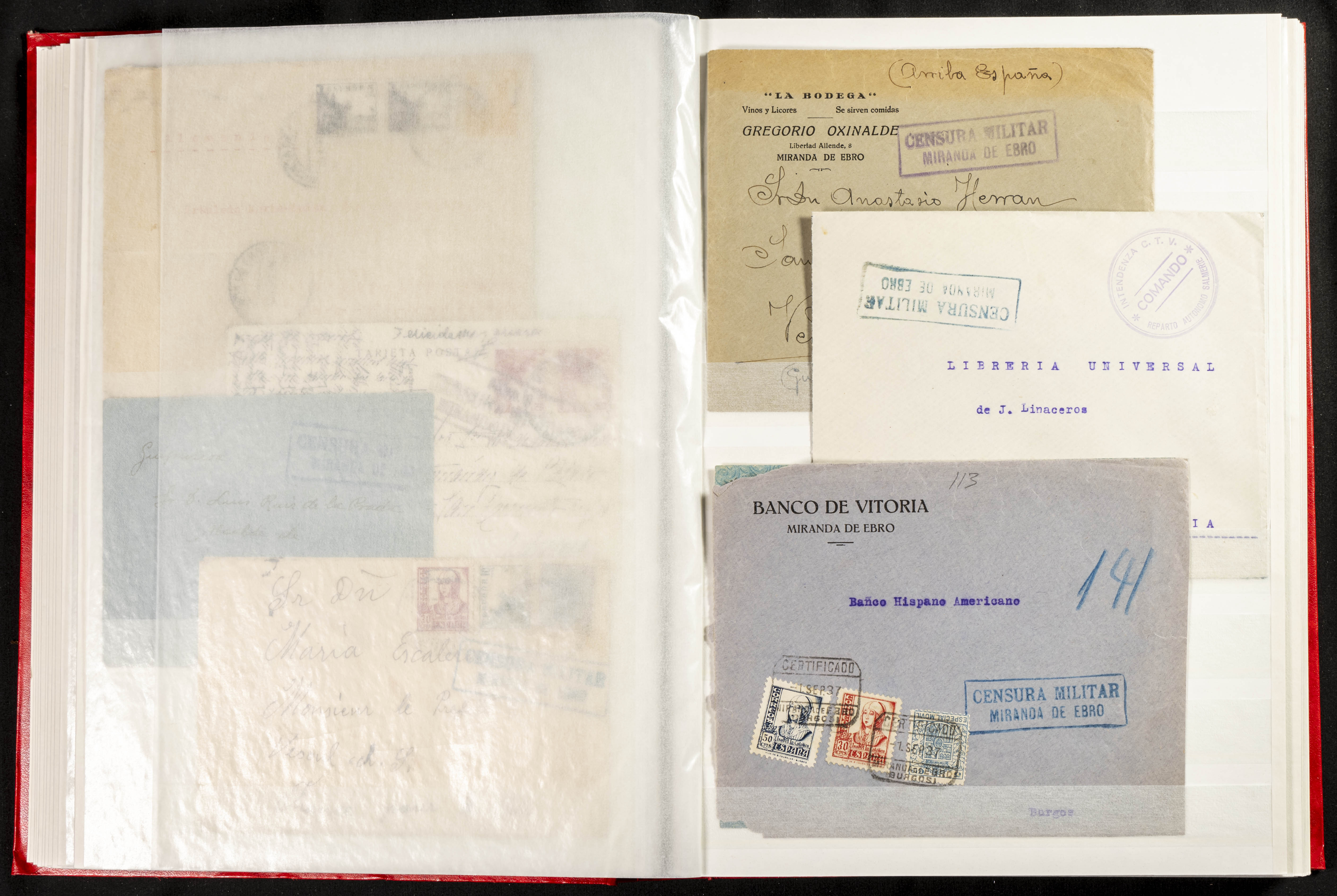 (1937ca). Espectacular colección sobre el Campo de Miranda de Ebro reunida por Estanislao Pan de Alfaro, estudiando numerosa correspondencia generada en este Campo y otros repartidos por España y Europa, incluye más de cuatrocientas cartas, tarjetas, entero postales, tarjetas entero postales, recibos, fotografías, etc, relacionadas con este campo y su periodo de funcionamiento que comienza durante la Guerra Civil y a partir de los años cuarenta sirve además como internado para extranjeros, conteniendo correspondencia de Legión Cóndor, Brigadas, Voluntarios Italianos y correspondencia extranjera, relacionada con campos de refugiados y de trabajadores extranjeros. IMPRESCINDIBLE EXAMINAR.