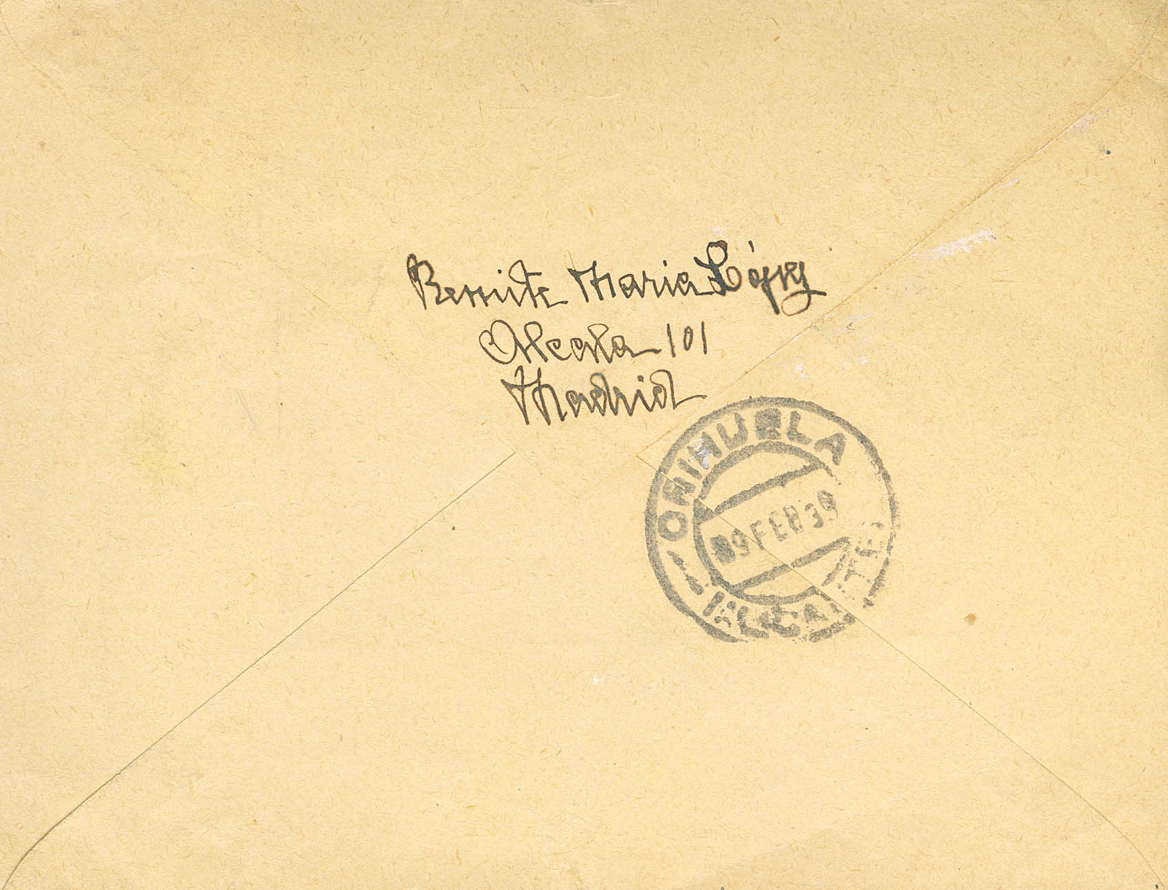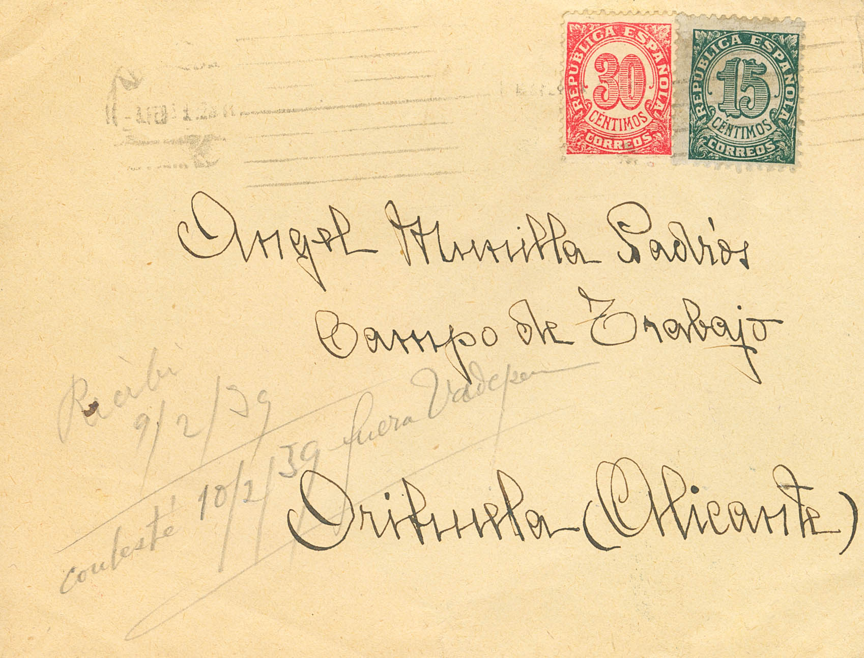 747, 750. 1939. 15 cts verde y 30 cts rojo. MADRID a ORIHUELA (ALICANTE), dirigida al Campo de Trabajo de San Miguel, ubicado en un seminario en la zona alta de la población y en funcionamiento desde Julio de 1937. MAGNIFICA.