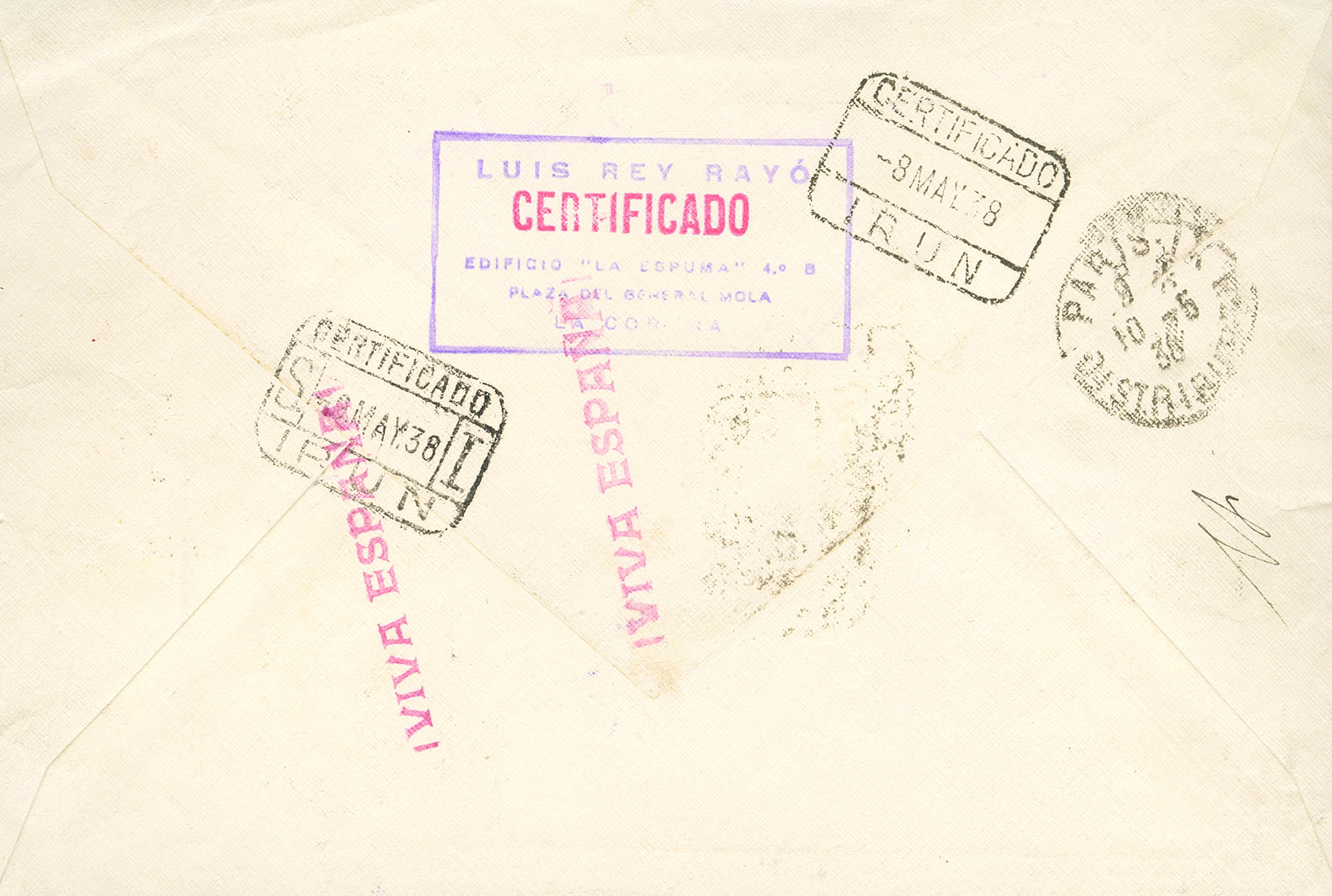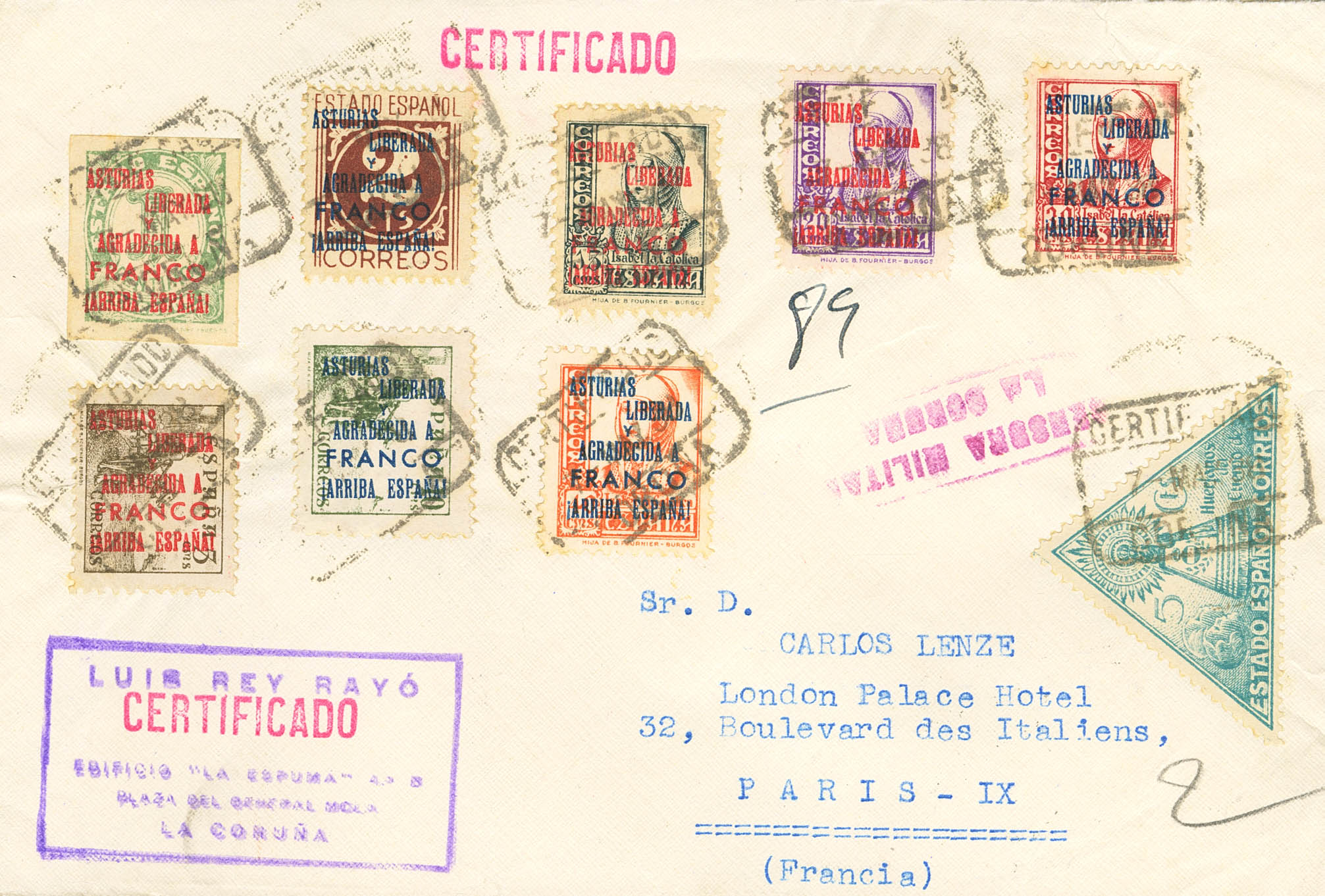 10/17. 1938. Serie completa. Certificado de LA CORUÑA a PARIS (FRANCIA). Al dorso llegada. MAGNIFICA Y RARISIMA.