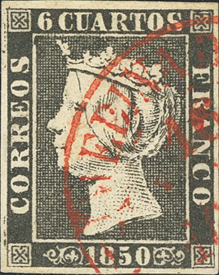 1. 1850. 6 cuartos negro. Matasello baeza MEDINA DEL C. / CAST.LA.V. (Tipo II). BONITO Y RARISIMO.