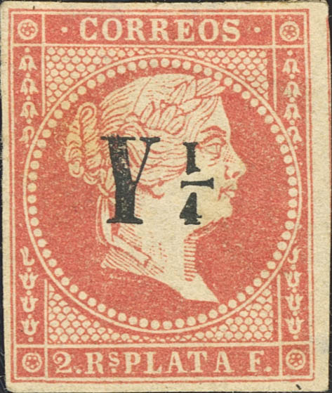 (★) 10G. 1860. Y¼ sobre 2 reales rojo naranja (leve puntito claro en el margen). CIFRA "1" INVERTIDA. BONITO Y RARO. Cert. ECHENAGUSIA.