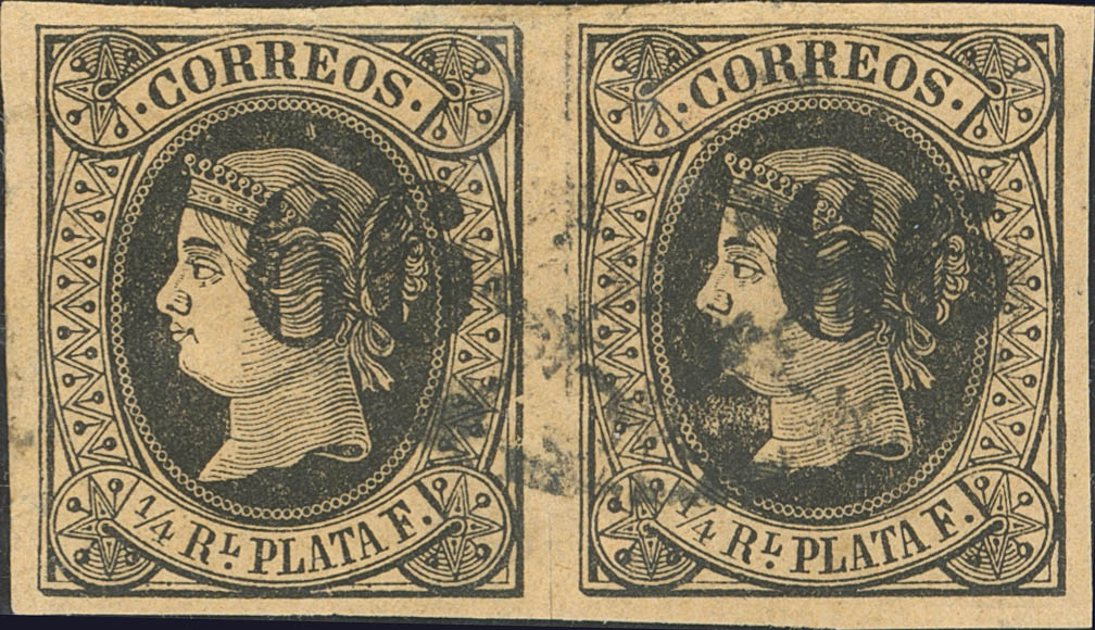 17(2). 1866. "66" sobre ¼ real negro, pareja. Matasello PARRILLA COLONIAL. MAGNIFICA Y MUY RARA PAREJA EN USADO, PARA CUBRIR EL PORTE DENTRO DE LA ISLA. Cert. ECHENAGUSIA.