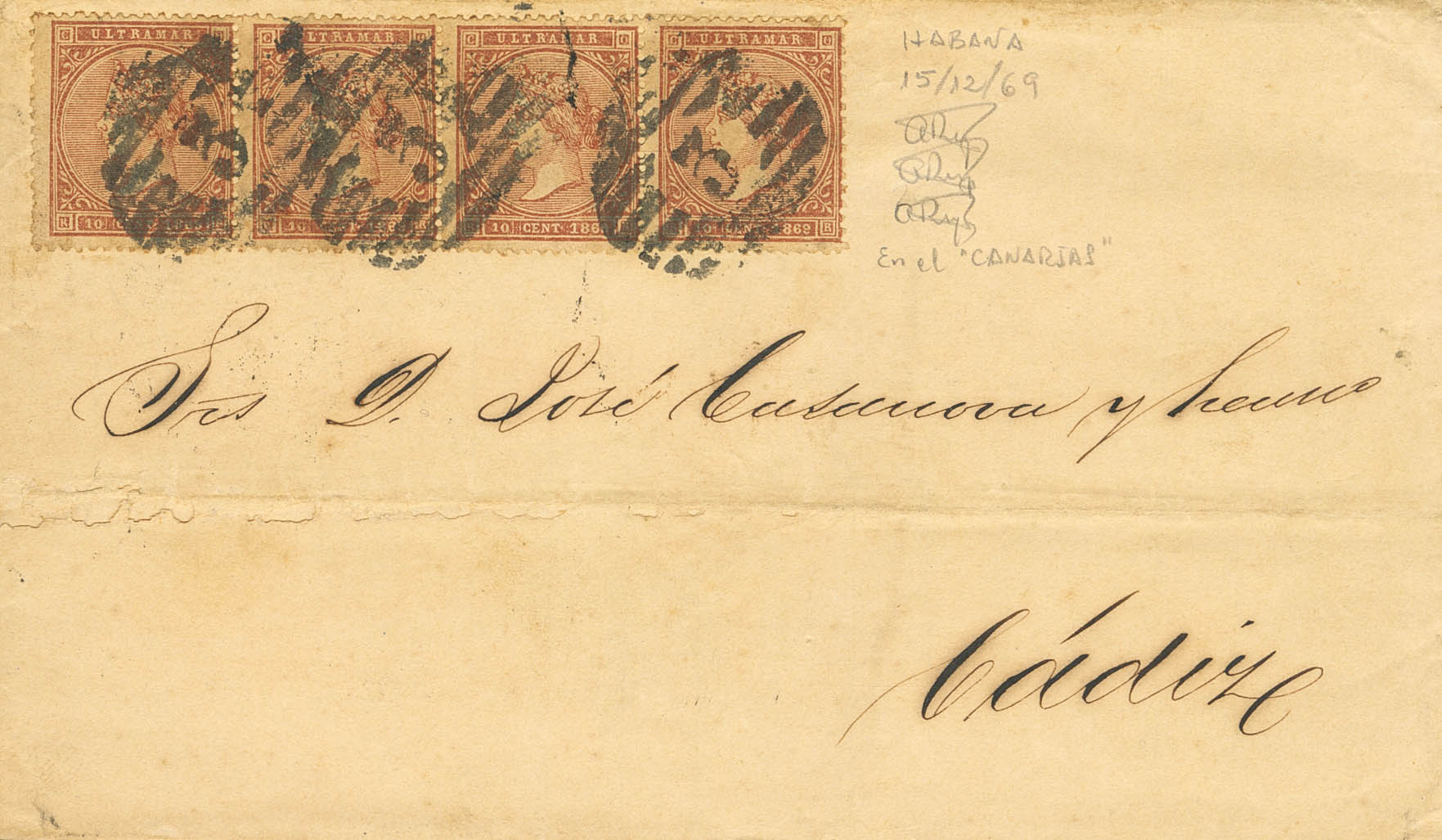 Ant.16(4). 1869. 10 cts castaño amarillo de Antillas, cuatro sellos. LA HABANA a CADIZ (alguna erosión en el frente). Encaminada privadamente hasta Cádiz, donde es matasellada con la PARRILLA CON Nº3. MAGNIFICA Y RARISIMA. Cert. GRAUS.