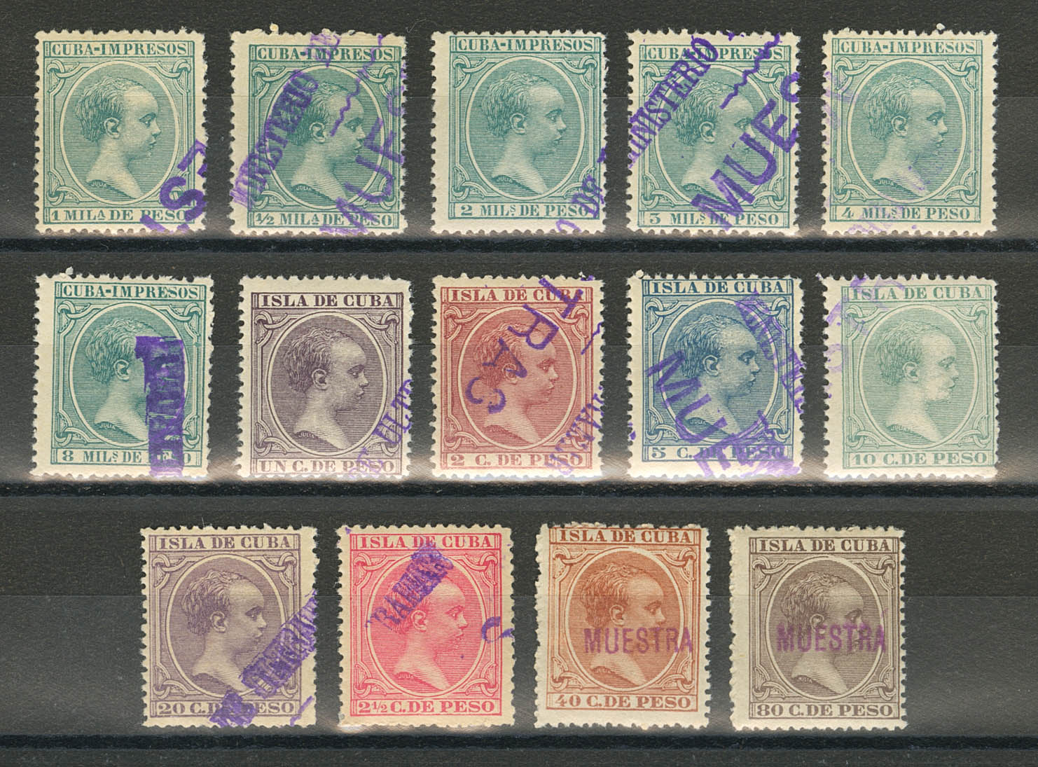 ★★/★ 140/53M. 1896. Serie completa. Sobrecarga MINISTERIO DE ULTRAMAR / MUESTRAS, en violeta (sólo Muestra sobre 40 cts y 80 cts). MAGNIFICA Y RARA.