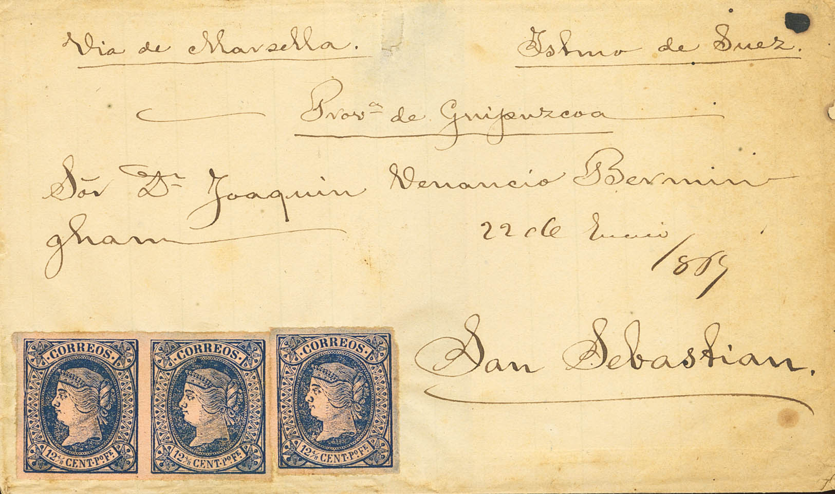 19(3). 1864. 12 4/8 ctvo, tres sellos (sin matasellar). MANILA a SAN SEBASTIAN. MAGNIFICA Y RARA.