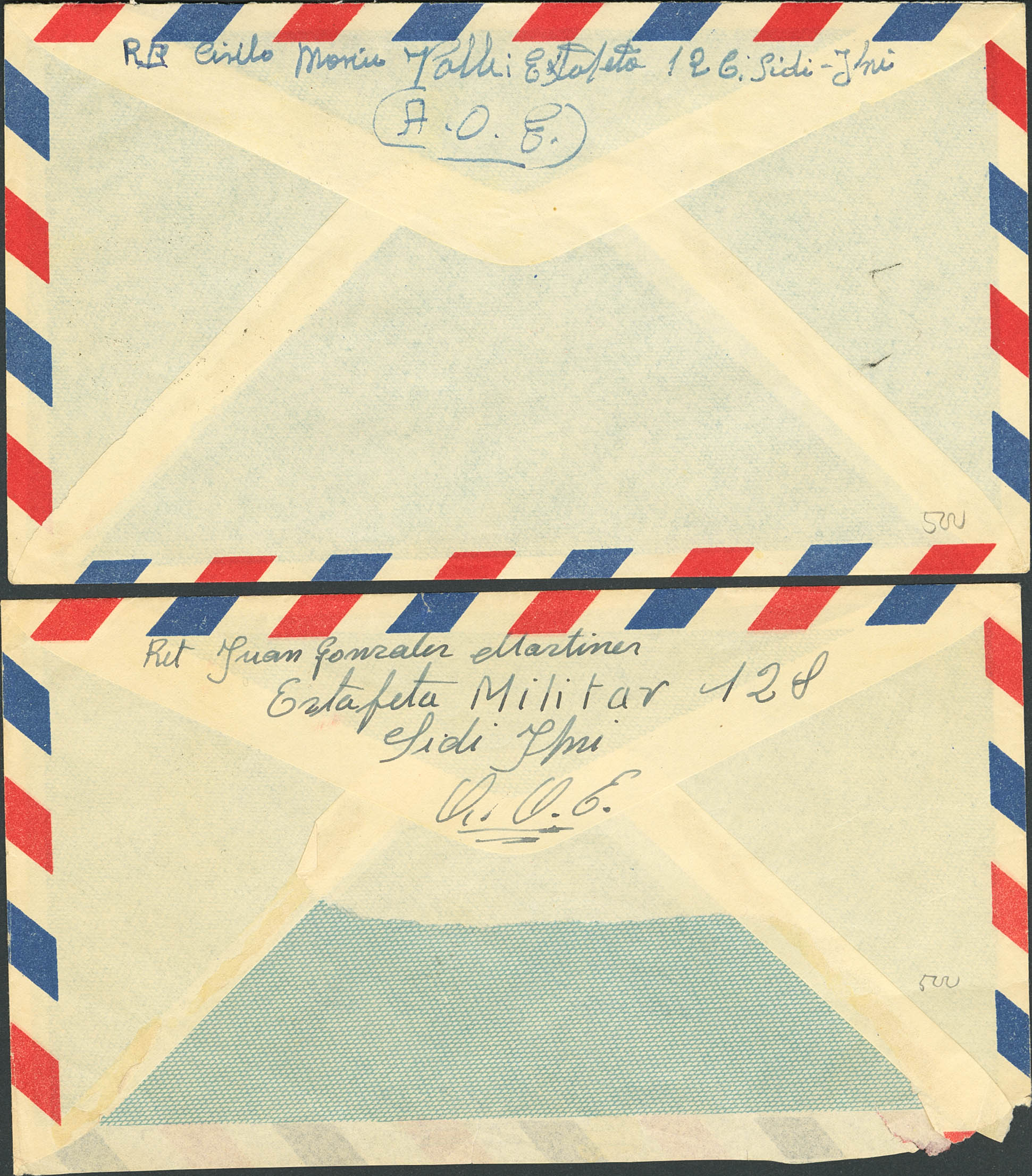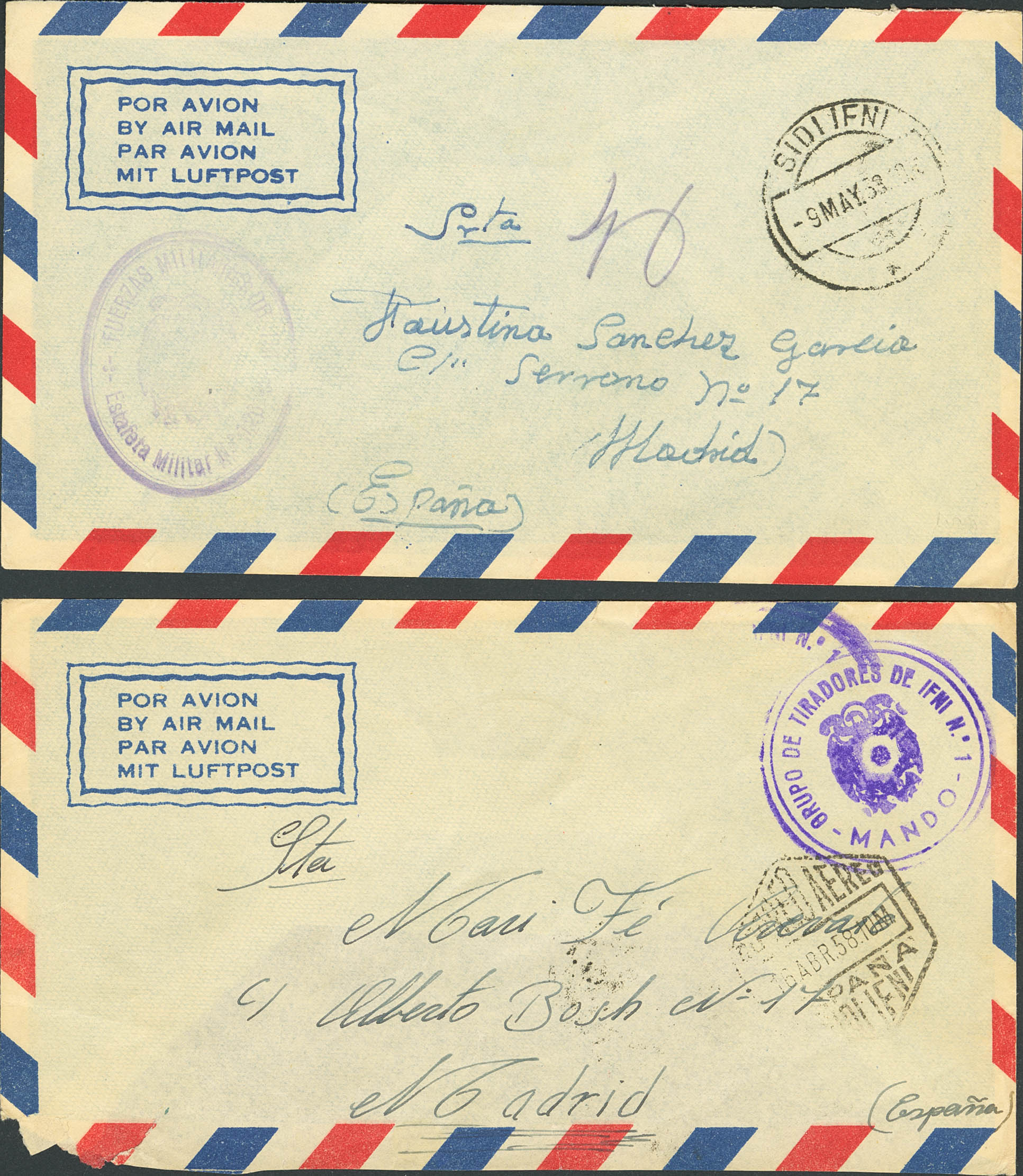 1958. Dos cartas circuladas de SIDI IFNI a MADRID con marcas de franquicia militar durante la Guerra de Ifni entre Noviembre de 1957 y Junio de 1958. MAGNIFICAS.