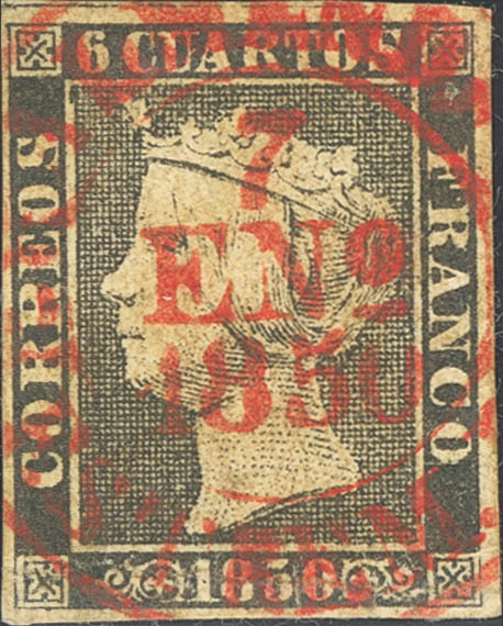 1. 1850. 6 cuartos negro (I-6). Matasello baeza ALMENDJº / ESTREM B. MAGNIFICO Y RARO.