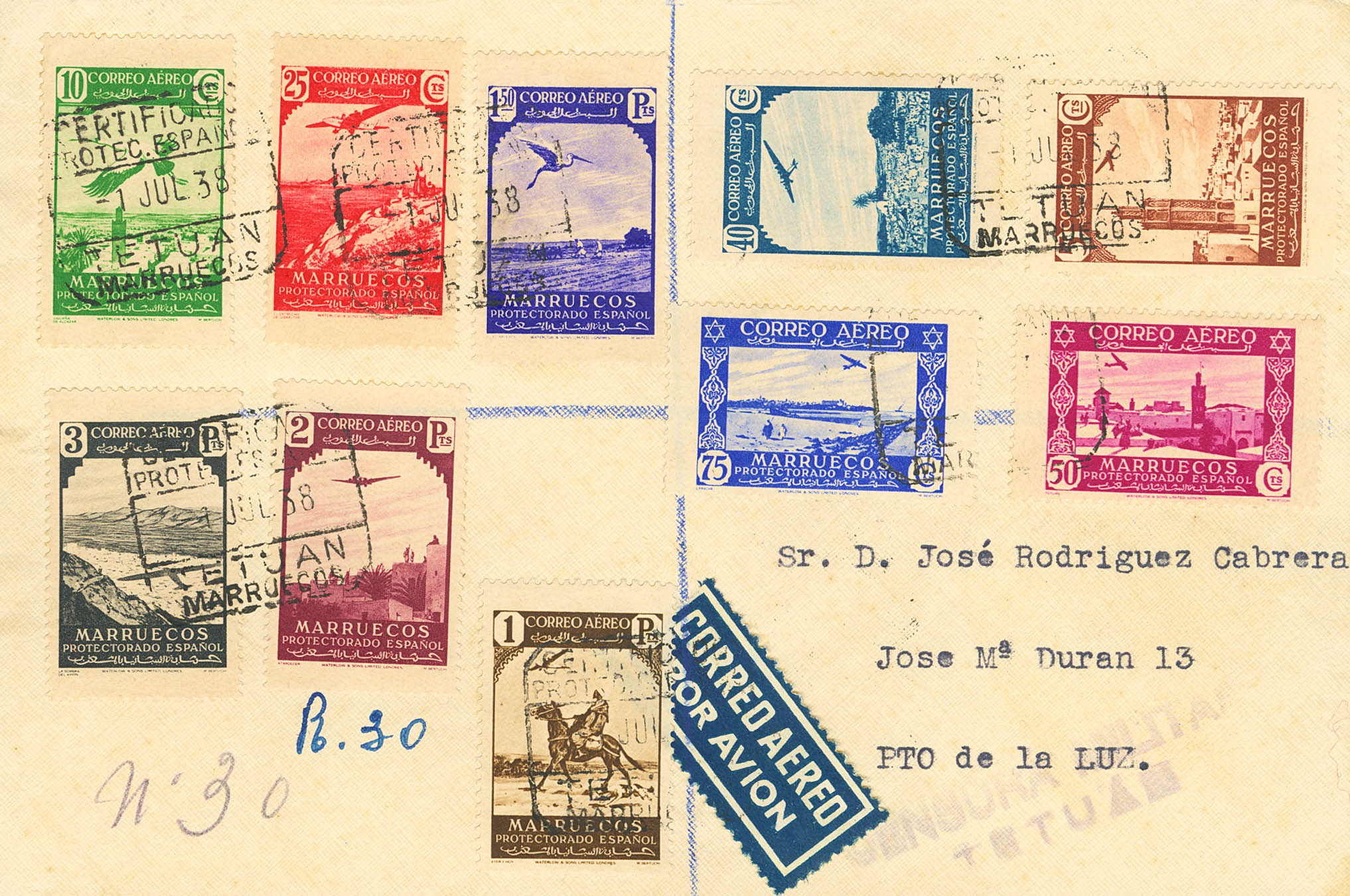 186/95. 1938. Serie completa. Certificado de TETUAN a PUERTO DE LA LUZ. Al dorso llegada. MAGNIFICA.