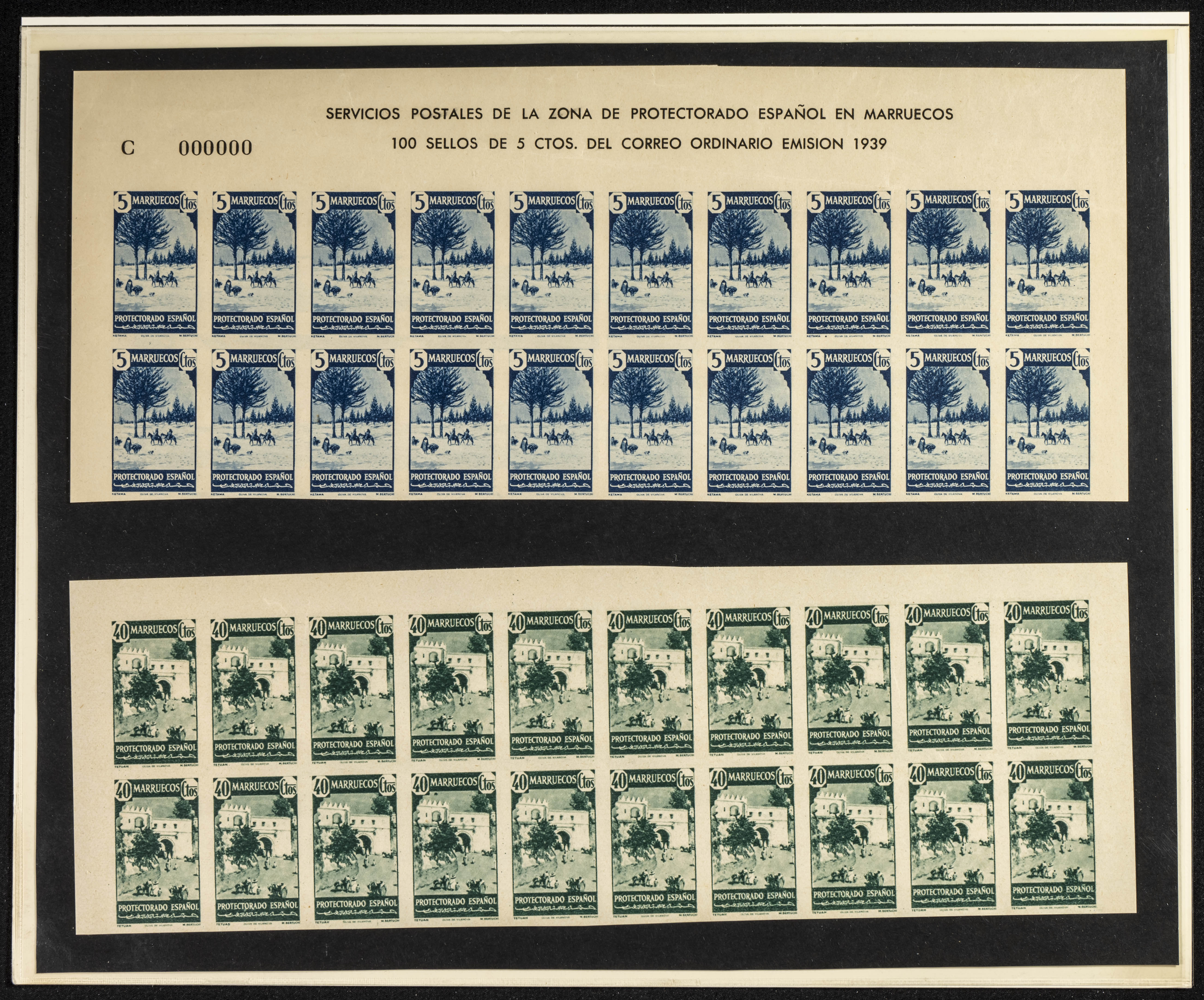 (★)1940. Pliego completo de cien inscripciones ARCHIVO DEL / INSTITUTO GRAFICO / OLIVA DE VILANOVA / MUESTRA con anotación "Modelo de la Impresión hecha al respaldo de las 34 hojas que quedan en poder del Instituto Oliva de Vilanova...", fechado y firmado en Barcelona para la emisión de tipos diversos de 1940, incluye dos bloques de veinte sin dentar del 5 cts azul (numeración C00000 en la cabecera) y del 40 cts verde oscuro. MAGNIFICO Y MUY RARO CONJUNTO.