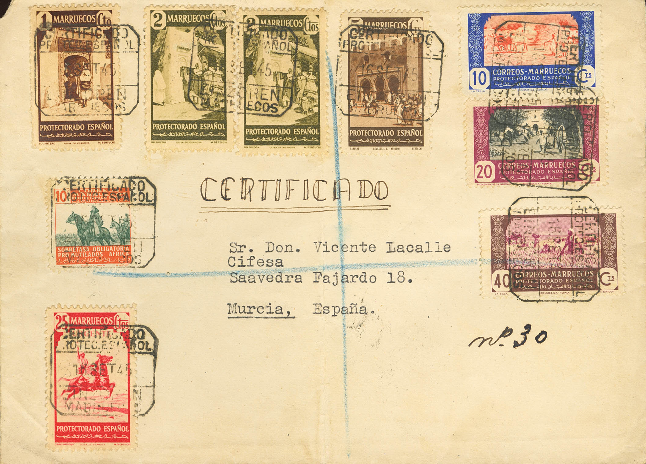 200,201(2),202,216,249,251,254. 1945. Diversos valores y 10 cts de Beneficencia. Certificado de EINZOREN a MURCIA. Al dorso tránsitos diversos y llegada. MAGNIFICA Y ESPECTACULAR FRANQUEO E INUSUAL ORIGEN.