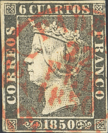 1. 1850. 6 cuartos negro. Matasello baeza PADRON / GALICIA. RARO.