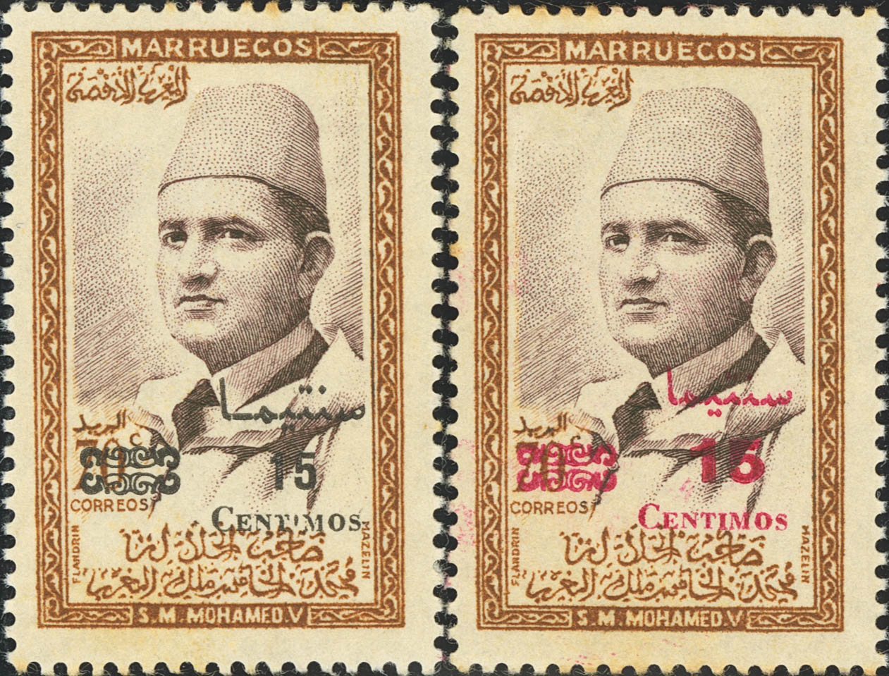 ★★1957. 15 cts sobre 70 cts bistre y castaño, dos sellos con sobrecargas diferentes a las emitidas, en negro y carmín. MAGNIFICOS Y RARISIMOS, NO RESEÑADOS.