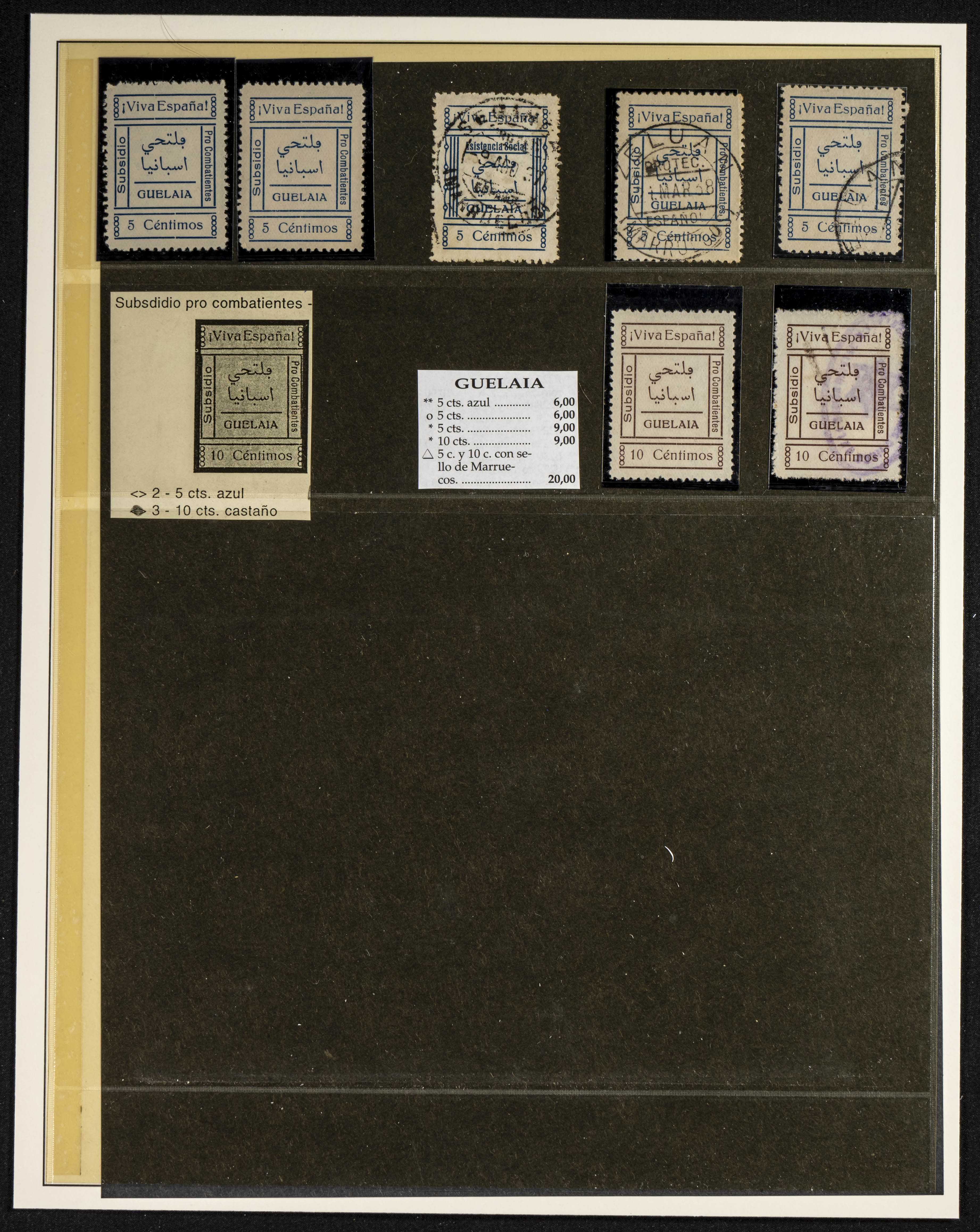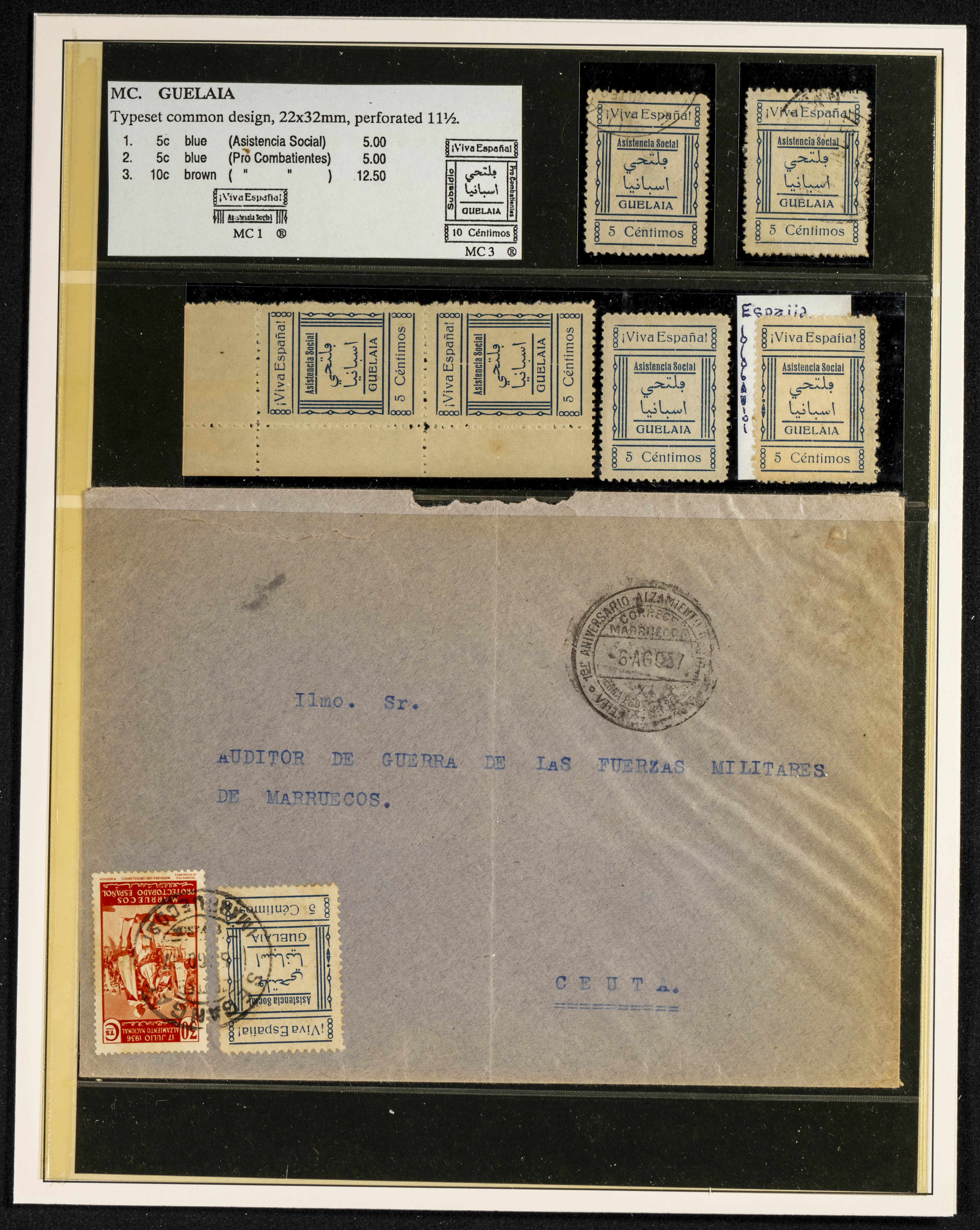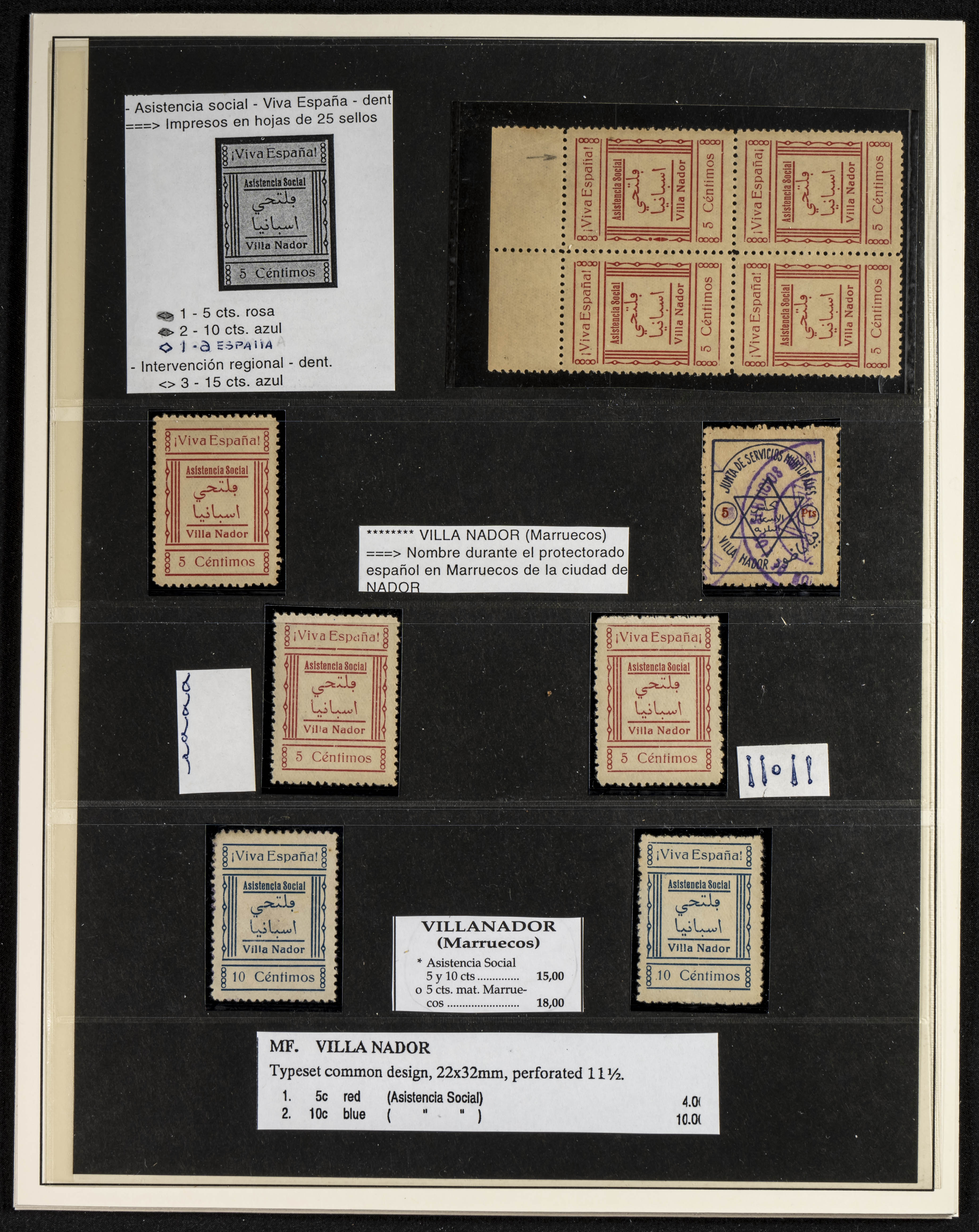 ★/1937. Interesante conjunto de sellos Locales, la mayoría emitidos entre 1937 y 1939, nuevos y usados de localidades como Villa Nador, Zaio, Guelaia, Villa Sanjurjo y Beni-Buyadi, incluye tres cartas verdaderamente circuladas, una con sellos de Villa Nador, otra con sellos de Melilla desde Villa Sanjurjo y una con sello de Guelaila. MAGNIFICO Y RARO CONJUNTO.