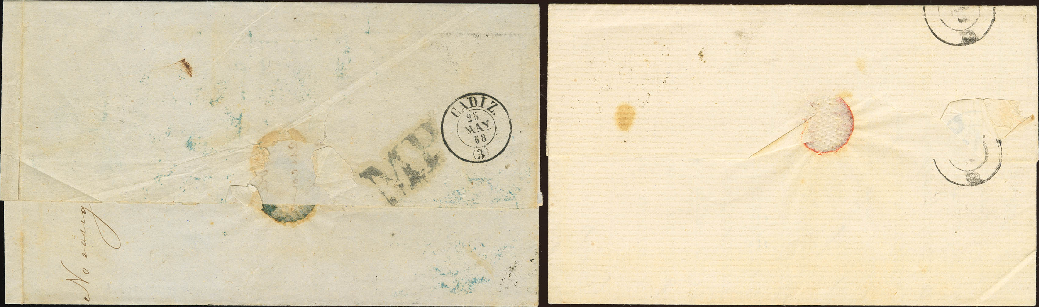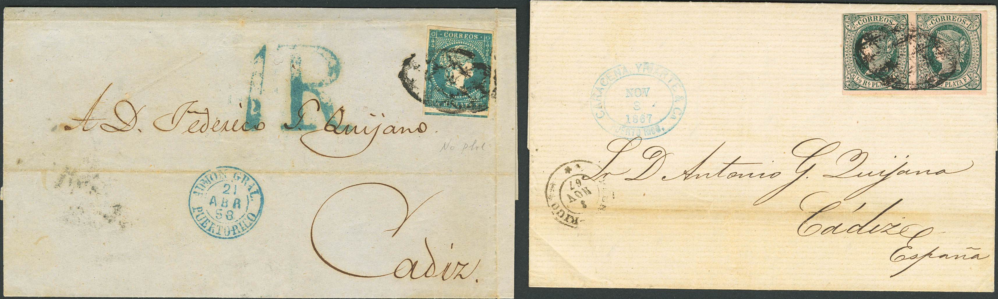 Ant.5, Ant.10(2). (1858ca). Dos cartas de SAN JUAN a CADIZ, franqueadas con sellos de Antillas de 1 real de 1856 y ½ real (dos sellos) de 1864. MAGNIFICAS.
