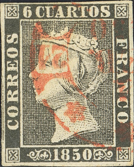 1. 1850. 6 cuartos negro. Matasello baeza *** / MURCIA. BONITO.