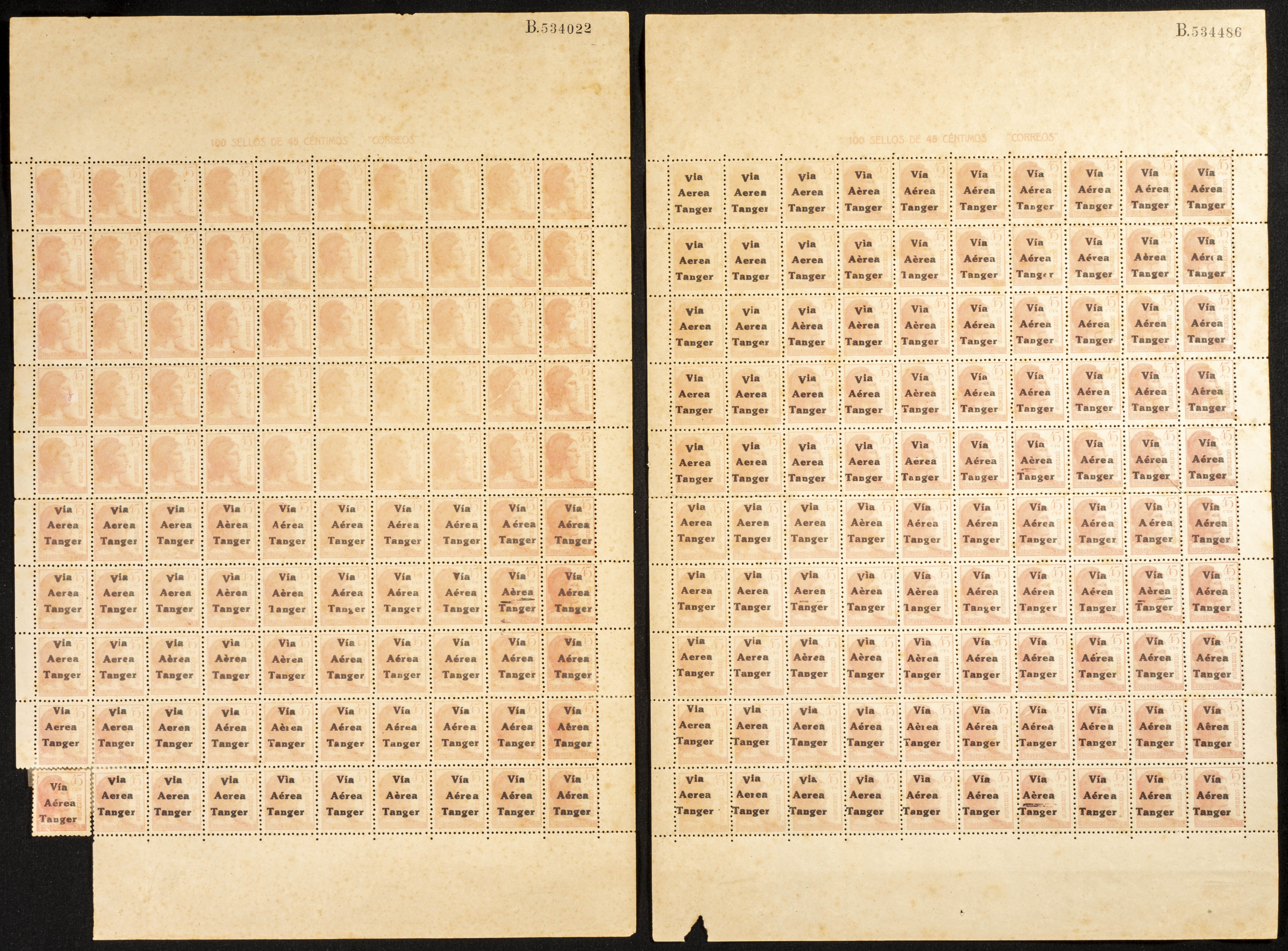 ★★/★ 135(199). 1938. 45 cts rosa, dos pliegos completos de cien sellos (uno a falta de un sello) con sobrecarga VIA / AEREA / TANGER, uno con la sobrecarga en la mitad de los sellos inferiores (conservación habitual). BONITOS E IDEAL PARA ESTUDIO DE LA SOBRECARGA.