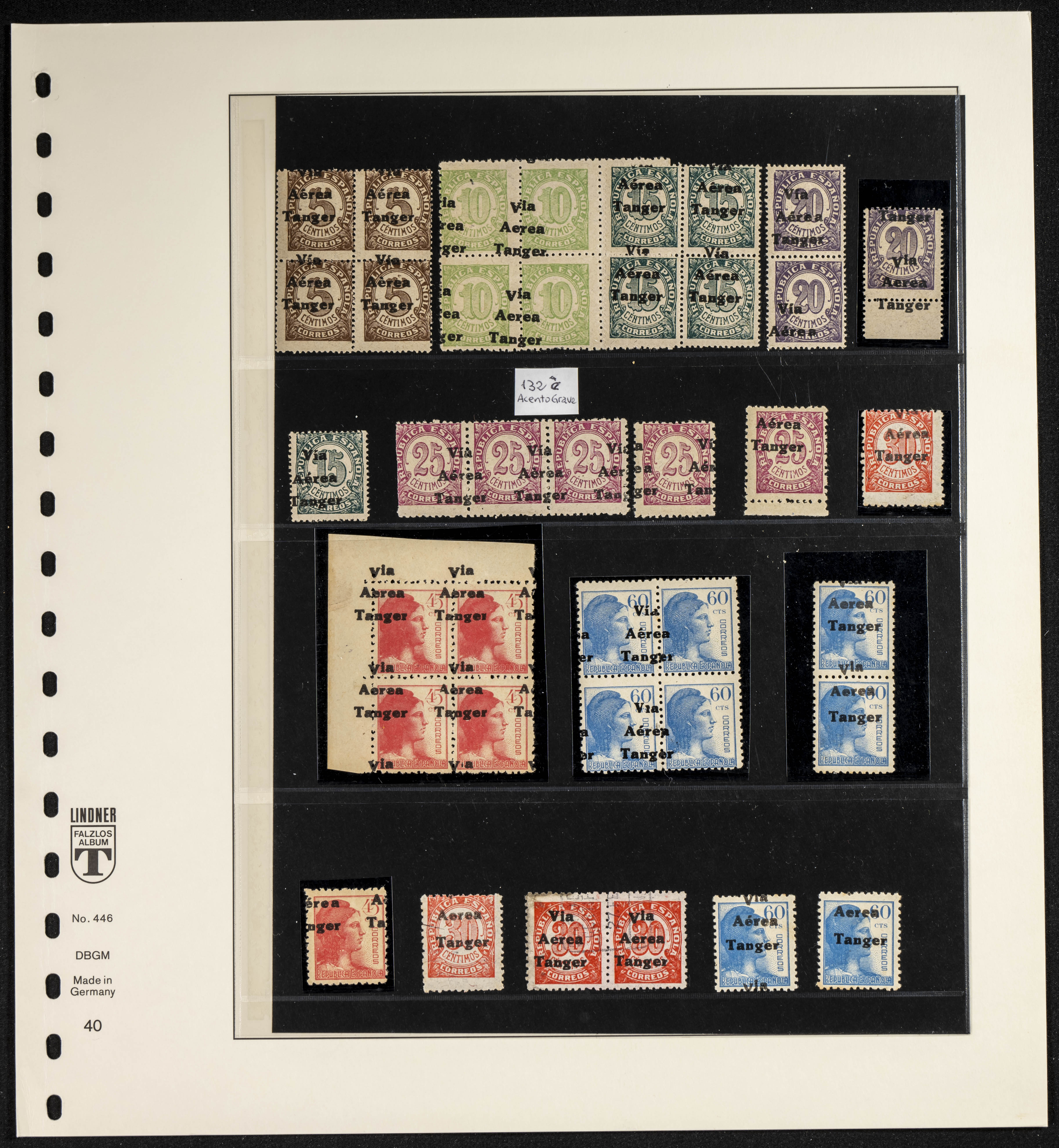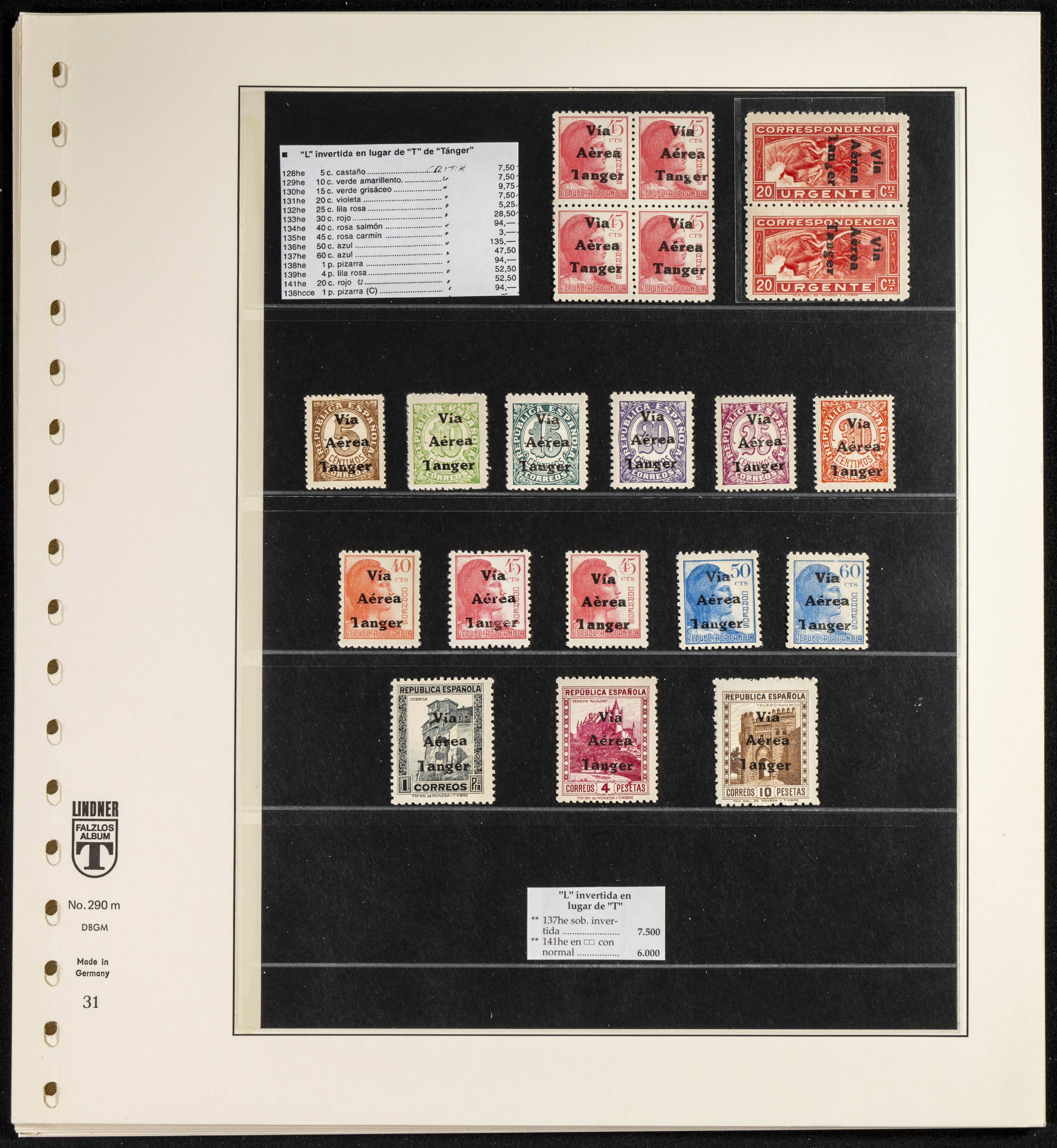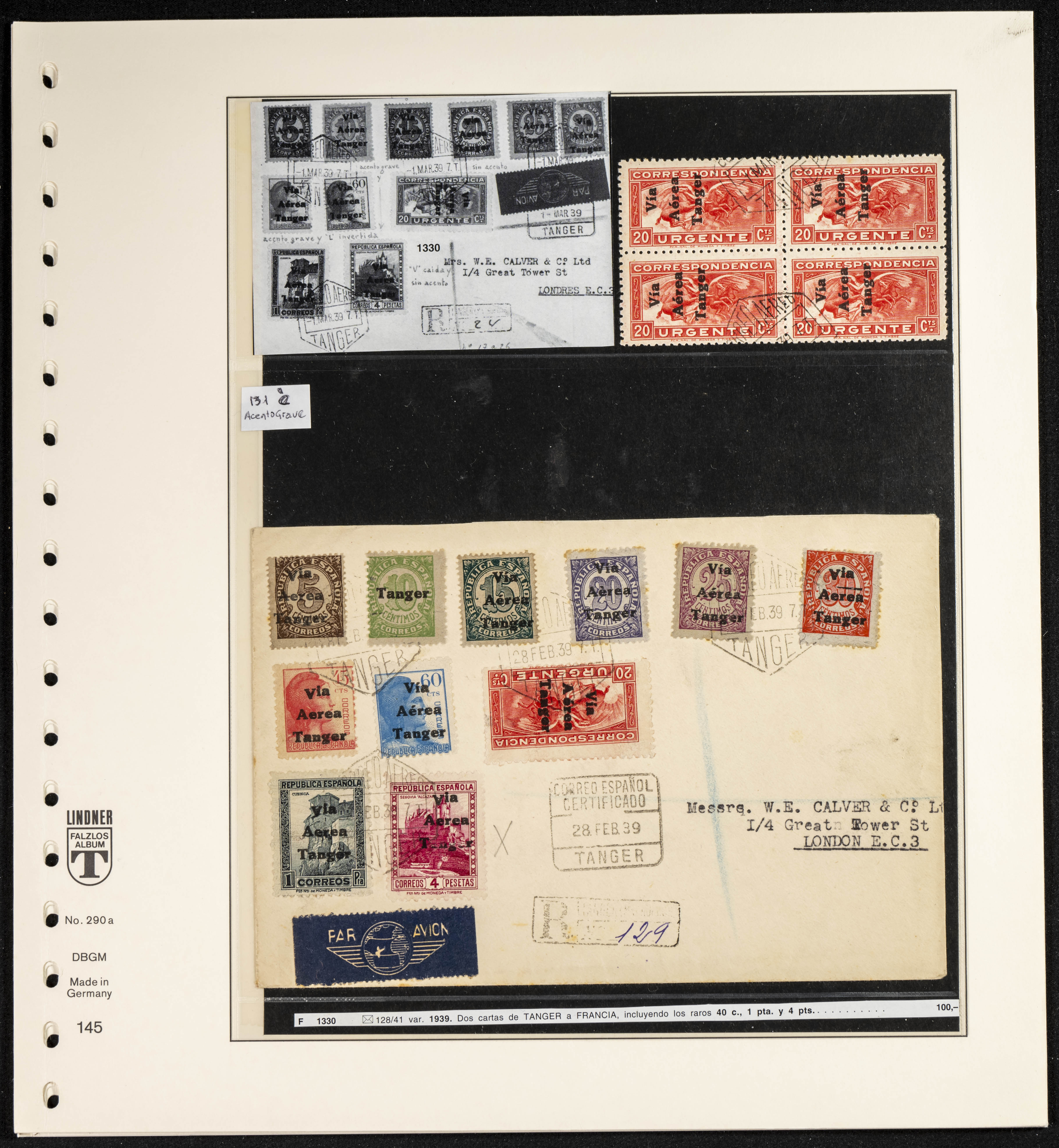 ★★/★1938. Espectacular conjunto de la emisión de 1938 con sobrecarga VIA / AEREA / TANGER, incluye la serie tipo y numerosas variedades de sobrecarga como invertidas, dobles, desplazadas, "L" invertida, parejas con un sello sin sobrecargar, etc, además de algún sello usado, dos cartas certificadas y tres bloques grandes del 45 cts. ALTISIMO VALOR DE CATALOGO. IMPRESCINDIBLE EXAMINAR.