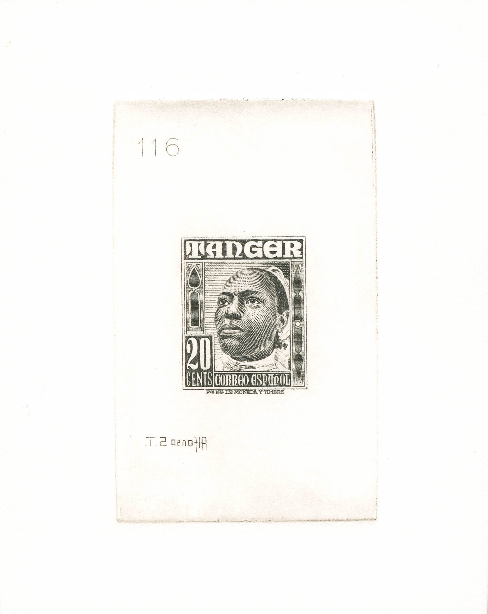 (★) 155P. 1948. 20 cts negro. PRUEBA DE PUNZON, con numeración y nombre del grabador. MAGNIFICA Y RARA.