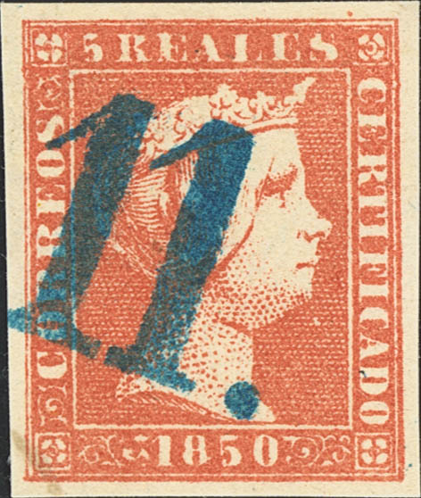 3F. 1850. 5 reales rojo FALSO SPERATI, al dorso marca de la B.P.A. Matasello "11", en azul de Zaragoza. MAGNIFICO.
