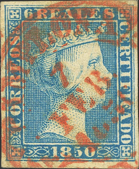 4. 1850. 6 reales azul (márgenes enormes). Matasello baeza *** / PAMPLONA. PIEZA DE LUJO. Cert. CEM.
