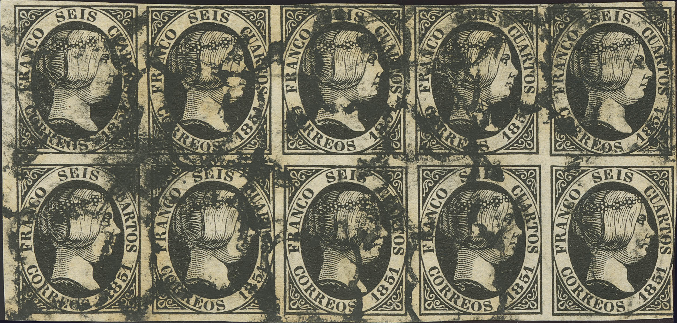 6(10). 1851. 6 cuartos negro, bloque de diez. MAGNIFICO Y RARISIMO, LOS GRANDES BLOQUES DE ESTE SELLO NO SON HABITUALES.