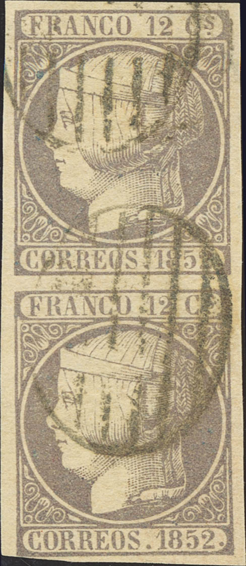 13(2). 1852. 12 cuartos lila gris, pareja vertical. MAGNIFICA.