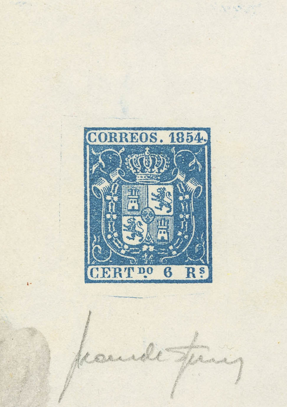 (★) 27P. 1854. 6 reales azul. PRUEBA DE SPERATI, firma de Jean Sperati y al dorso marca de la B.P.A. MAGNIFICA Y RARA.