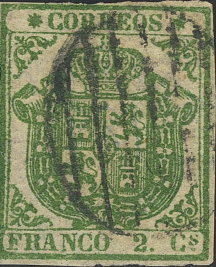 32F. 1854. 2 cuartos verde (margen izquierdo justo). FALSO SPERATI (Tipo A), al dorso marca de la B.P.A. BONITO.