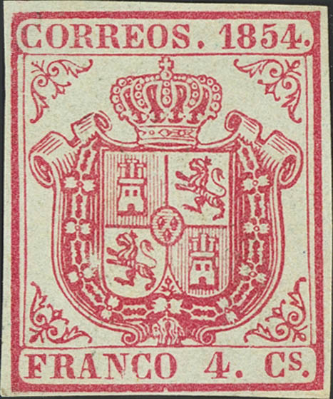 (★) 33A. 1854. 4 cuartos carmín. PAPEL GRUESO AZULADO. MAGNIFICO Y RARO. Cert. CEM.