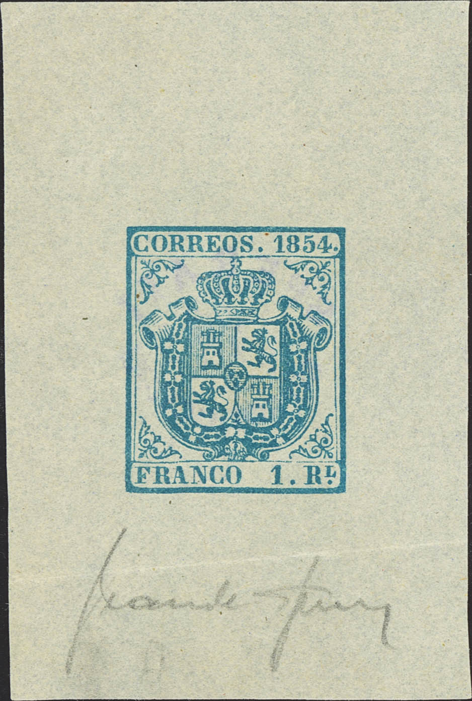 (★) 34AP. 1854. 1 real azul claro. PRUEBA DE SPERATI (Tipo A), firma de Jean Sperati y al dorso marca de la B.P.A. MAGNIFICA Y RARA.
