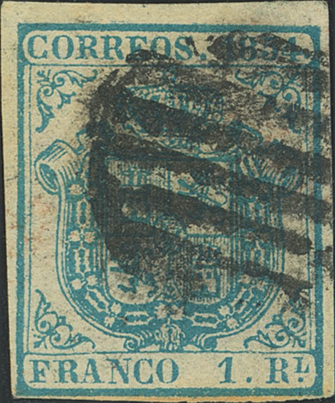 34AF. 1854. 1 real azul claro. FALSO SPERATI (Tipo B), sin firma de Jean Sperati y sin marca de la B.P.A. MAGNIFICO.