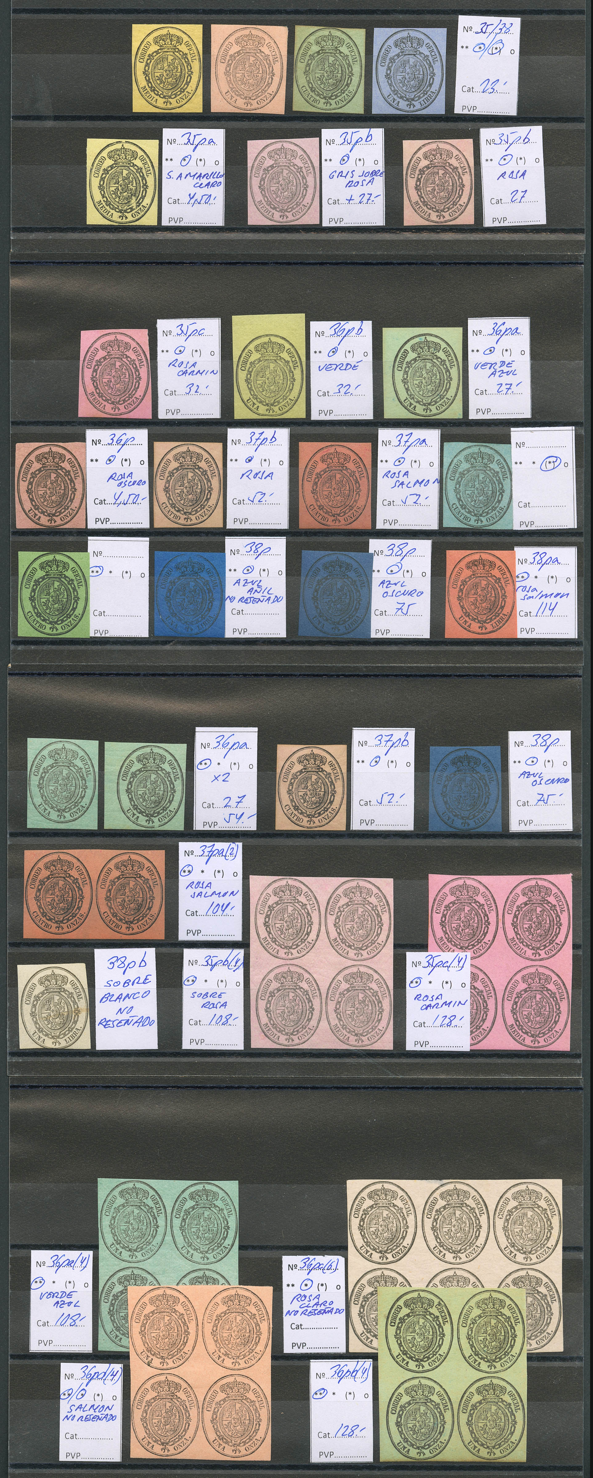 ★★/★ 35/38. 1855. Conjunto de la serie completa y las diferentes variantes de color de cada valor, algunos en bloques de cuatro y de seis. MAGNIFICO. Edifil 2020: ++1.200 Euros