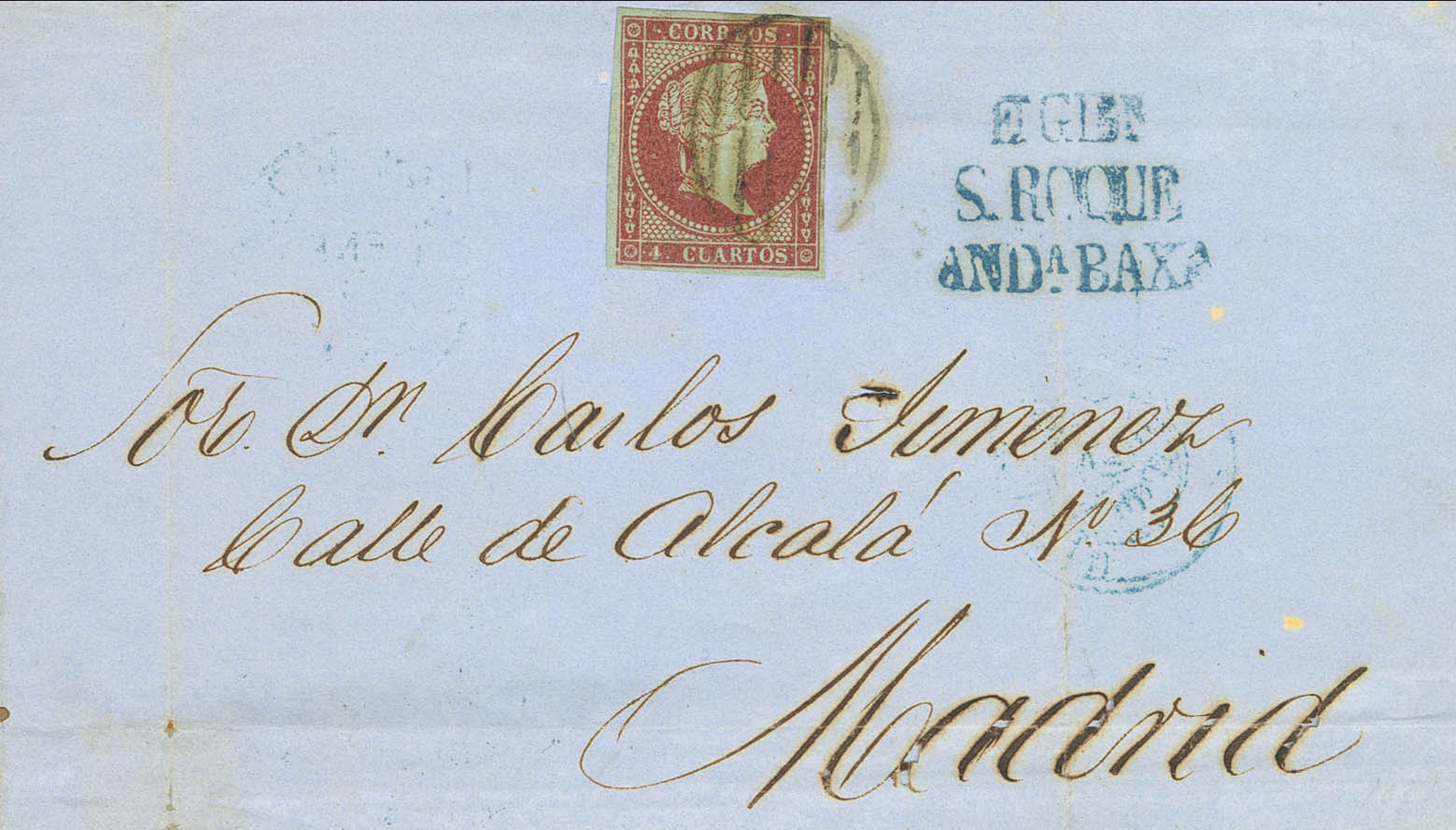40. 1856. 4 cuartos carmín. GIBRALTAR a MADRID. En el frente marca DE GIBR. / S. ROQUE / ANDA. BAXA, en azul. MAGNIFICA Y RARA.