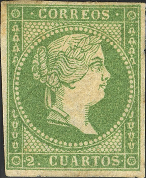 ★ 43. 1855. 2 cuartos verde. MAGNIFICO Y MUY RARO EN NUEVO. Cert. GRAUS.