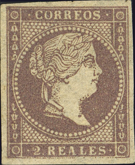 (★) 46. 1855. 2 reales violeta. Márgenes grandes. MAGNIFICO. Cert. COMEX.