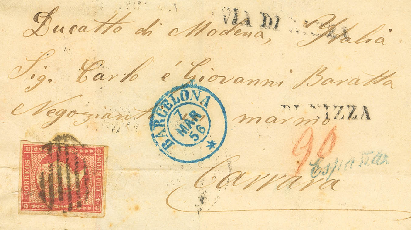 48. 1856. 4 cuartos rojo (doblez de archivo). BARCELONA a CARRARA (MODENA). Franqueo obligatorio hasta la frontera según Convenio con Estados Italianos en vigor desde junio de 1853. En el frente marcas ESPAÑA, en azul VIA DI NIZZA, en negro y porte manuscrito "90" (Crazia). MAGNIFICA Y RARA.