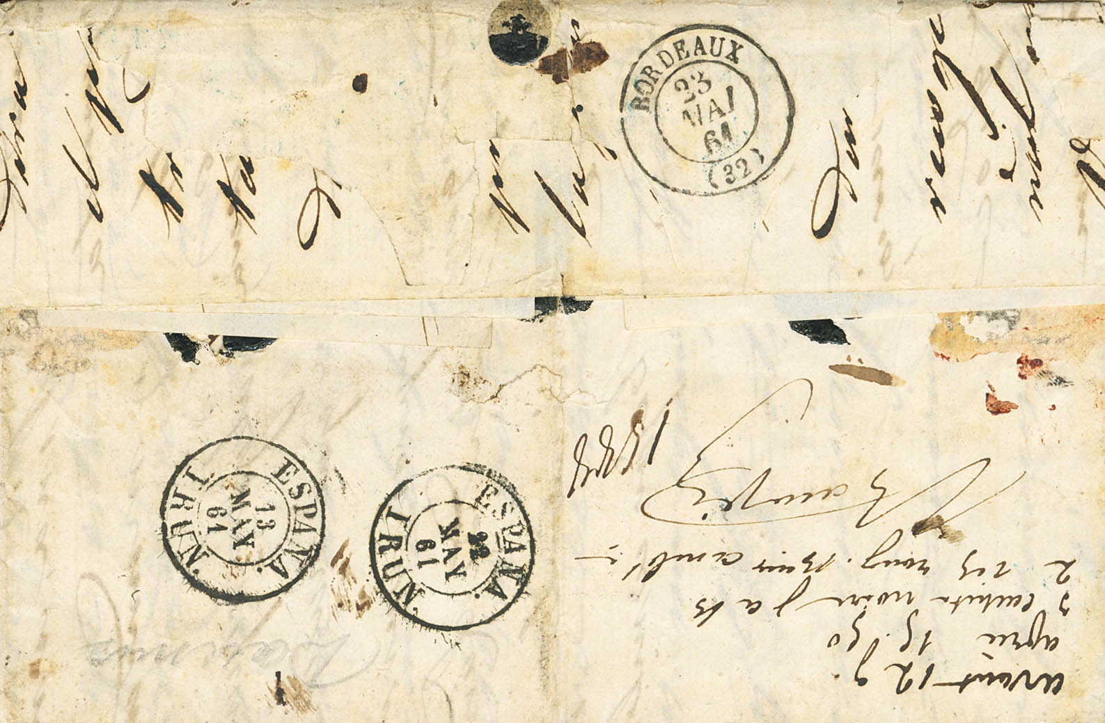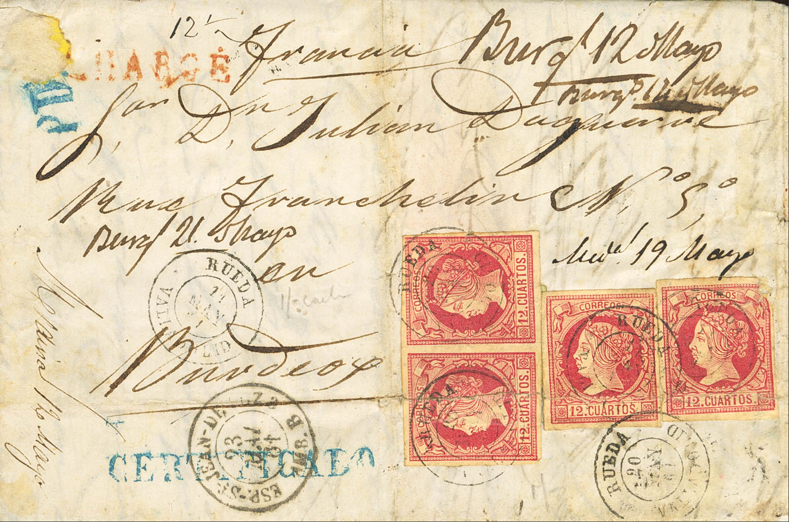 53(4). 1861. 12 cuartos carmín, pareja y dos sellos, adheridos sobre un sello del 4 cuartos amarillo. Certificado de RUEDA a BURDEOS (FRANCIA). Matasello RUEDA / VALLADOLID y en el frente marcas CERTIFICADO, en azul y CHARGE, en rojo, además de varias tomas de razón. MAGNIFICA Y RARISIMO FRANQUEO DE DOBLE PORTE CERTIFICADO EN CARTA COMPLETA A FRANCIA.