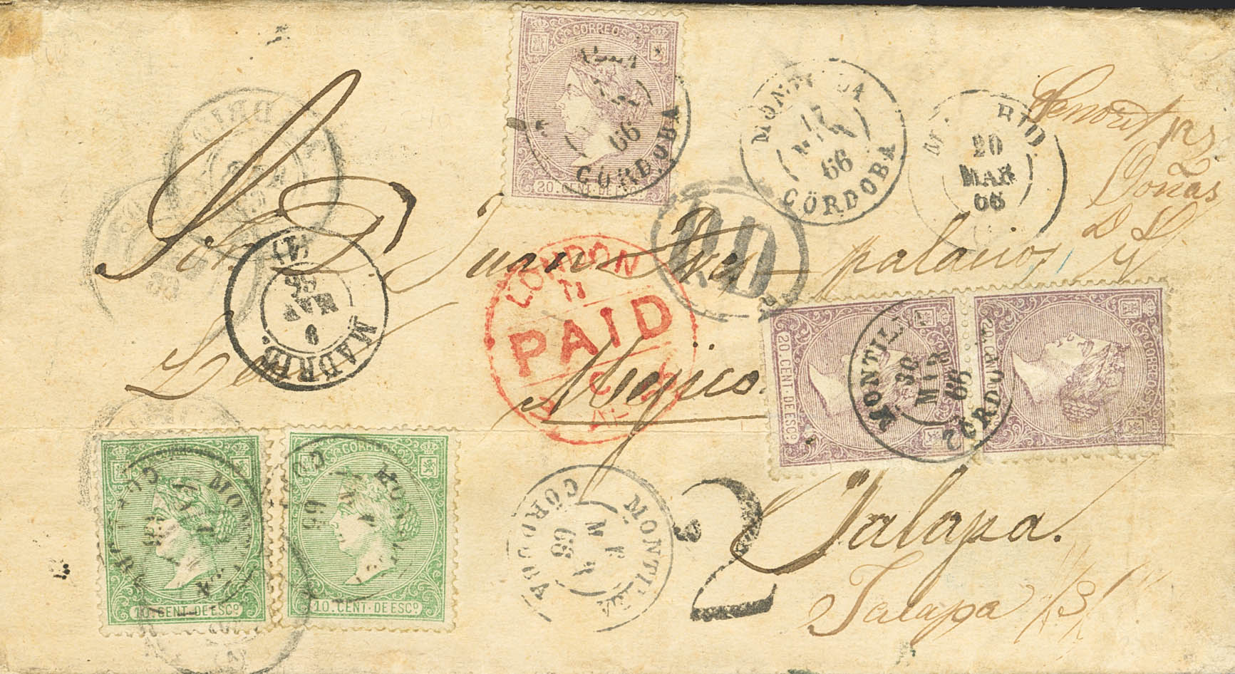 84(2), 85(3). 1866. 10 cts verde, dos sellos y 20 cts lila, tres sellos (uno con defecto). MONTILLA (CORDOBA) a JALAPA (MEXICO), la carta es devuelta hasta dos veces a Montilla para añadir el franqueo faltante, una con fecha 17 de Marzo para añadir un sello de 20 cts y otra el 30 de Marzo para añadir la pareja del 20 cts, de esta forma es definitivamente enviada a su destino con el franqueo correspondiente de doble porte vía Inglaterra. MAGNIFICA Y ESPECTACULAR Y RARISIMO FRANQUEO.
