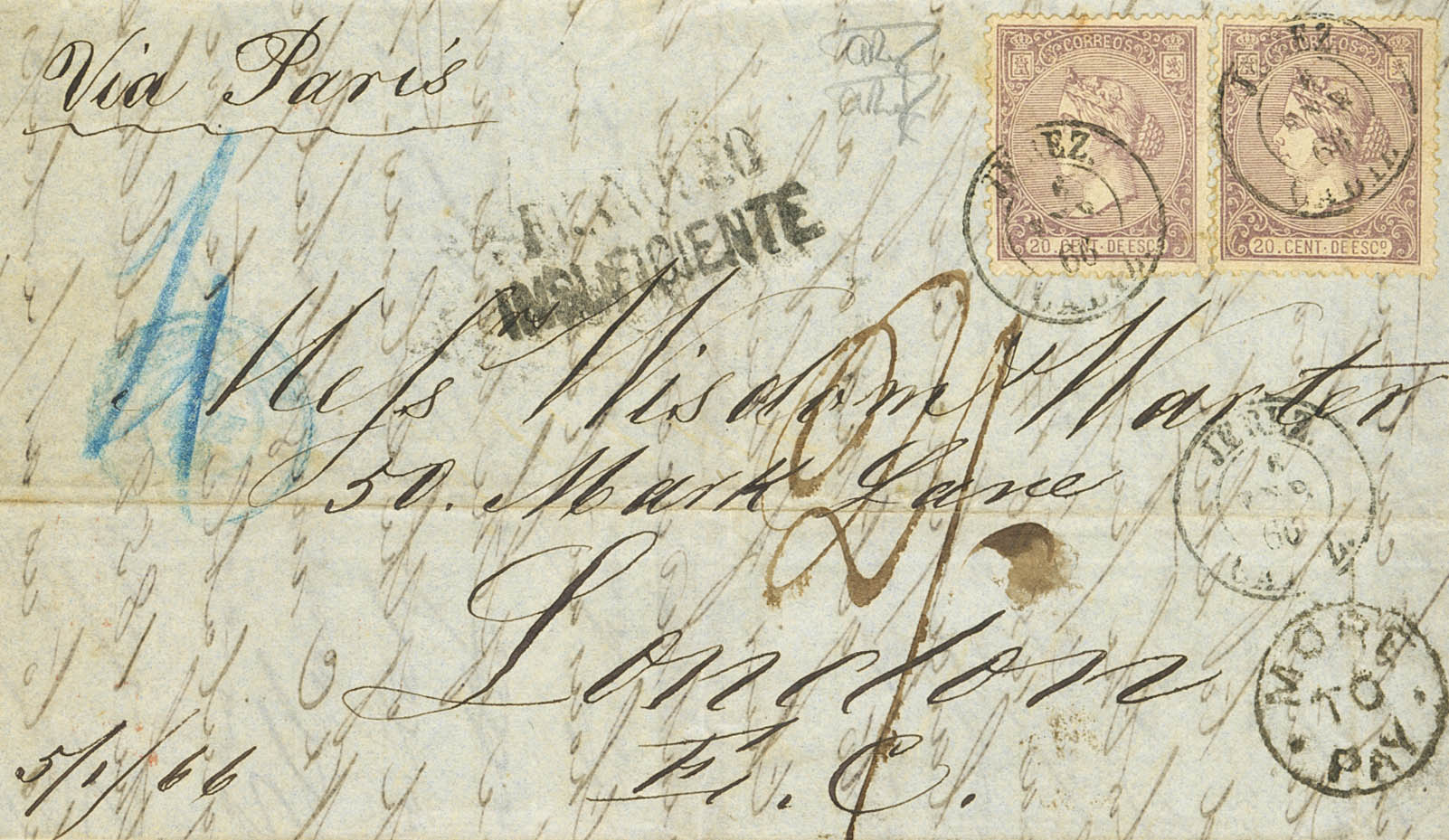 85(2). 1866. 20 cts lila, dos sellos. JEREZ DE LA FRONTERA a LONDRES (GRAN BRETAÑA). Franqueada como doble porte pero tasada por tratarse de cuatro portes aplicando marcas FRANQUEO / INSUFICIENTE y MORE / TO / PAY, además de la cifra "4" manuscrita para indicación de los cuatro portes. MAGNIFICA Y MUY RARA.
