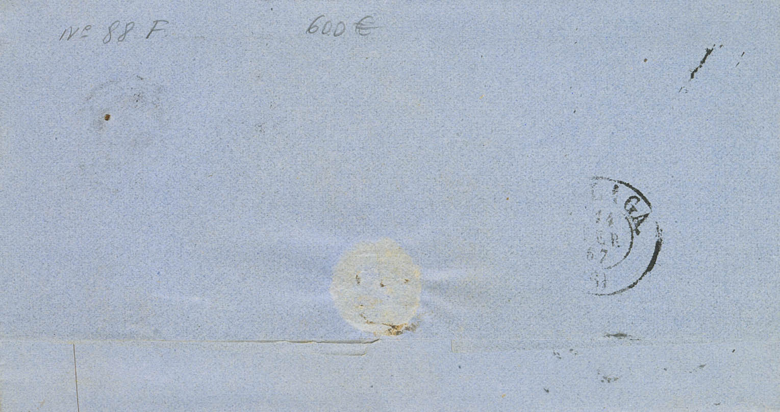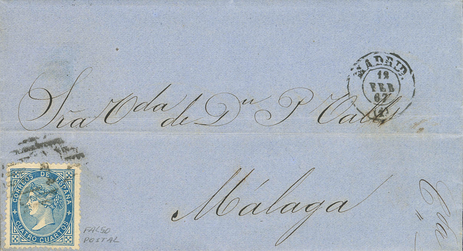88F. 1867. 4 cuartos azul FALSO POSTAL TIPO UNICO. MADRID a MALAGA. MAGNIFICA Y MUY RARA.