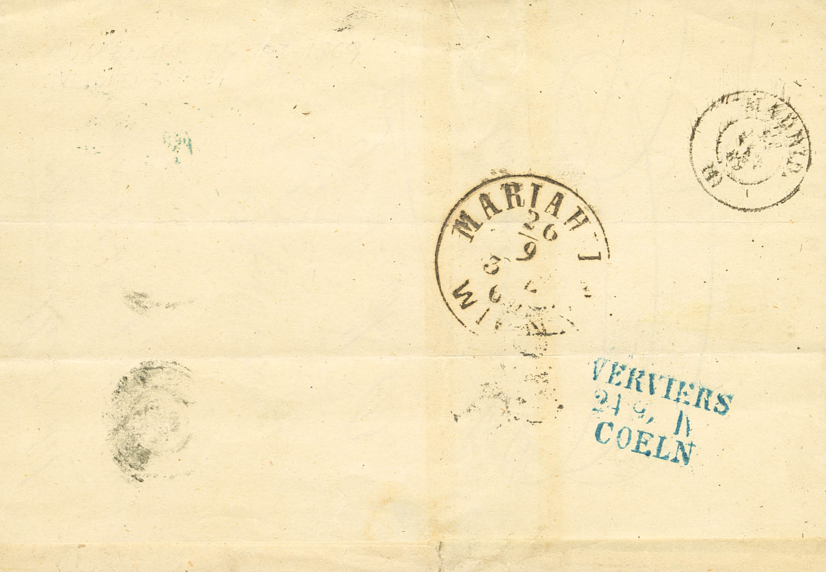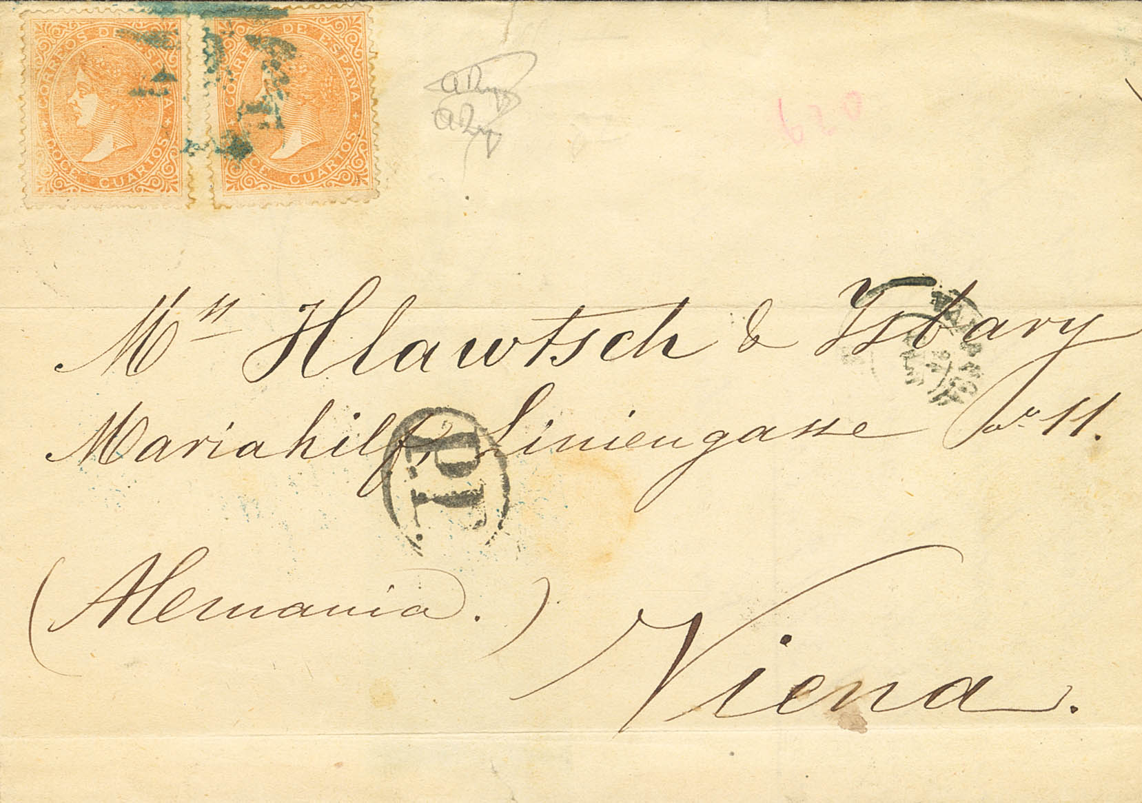 89A(2). 1869. 12 cuartos naranja, dos sellos. VALENCIA a VIENA (AUSTRIA). Matasello PARRILLA CON Nº8, en azul de Valencia. MAGNIFICA E INUSUAL DESTINO CON LA PARTICULARIDAD DEL EMPLEO DEL COLOR AZUL EN EL MATASELLO DE LA CAPITAL VALENCIANA.