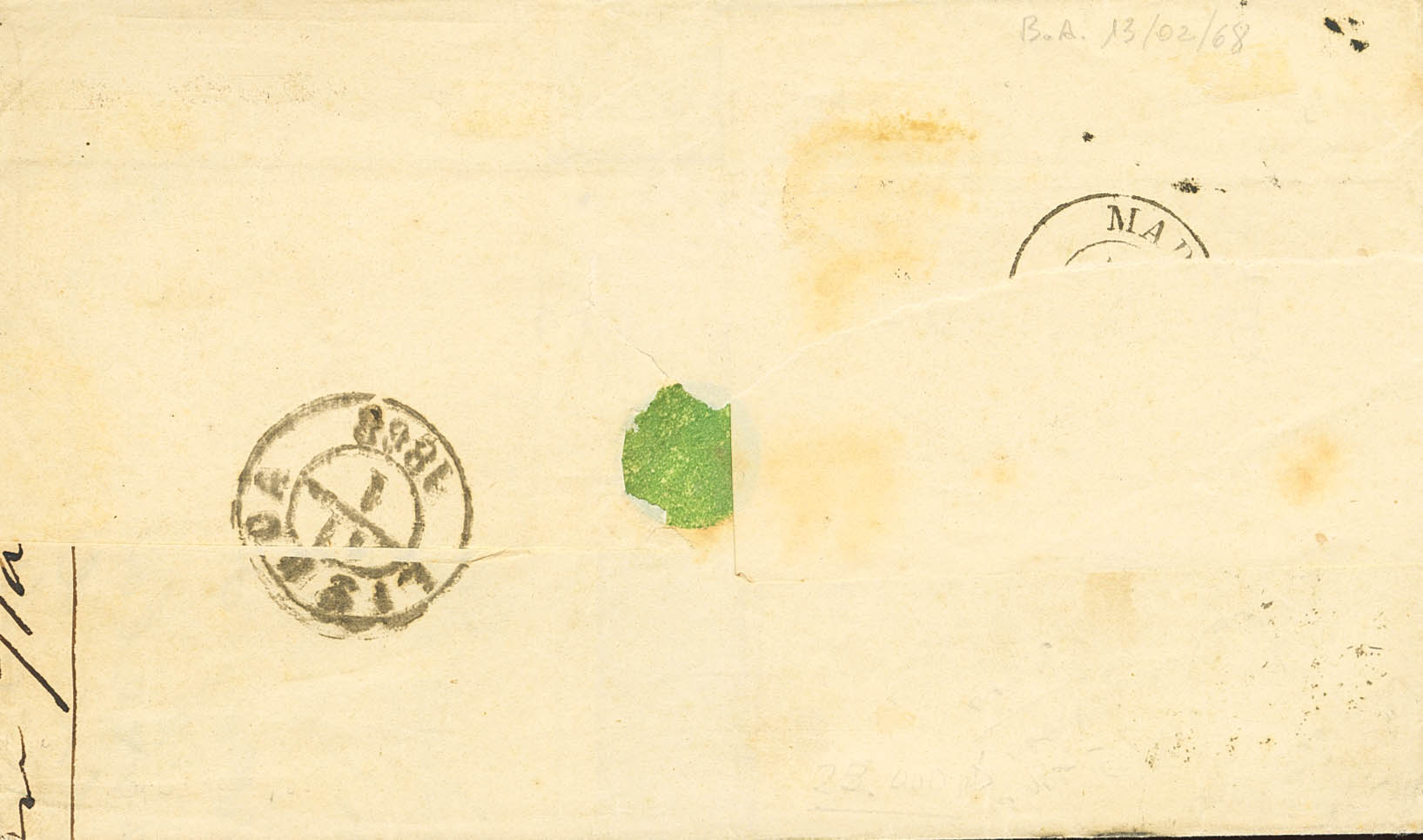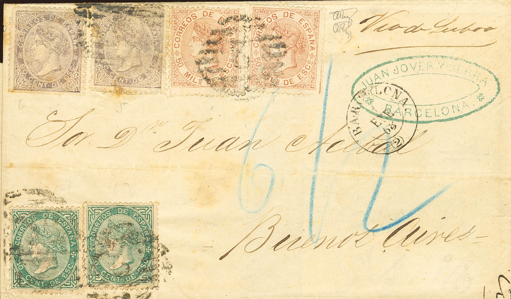 91(2), 92(2), 96(2). 1868. 10 cts verde, 20 cts lila y 50 mils castaño claro, dos sellos de cada. BARCELONA a BUENOS AIRES (ARGENTINA). MAGNIFICA Y ESPECTACULAR Y RARISIMA COMBINACION DE FRANQUEO PARA COMPLETAR LA TARIFA DE DOBLE PORTE (700 MILS) VIA PORTUGAL.