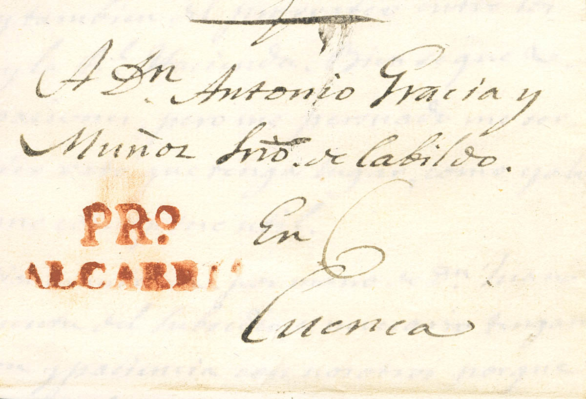 1832. PRIEGO (CUENCA) a CUENCA. Marca PRO. / ALCARRIA, en rojo de Priego (P.E.1) edición 2004. MAGNIFICA Y MUY RARA.