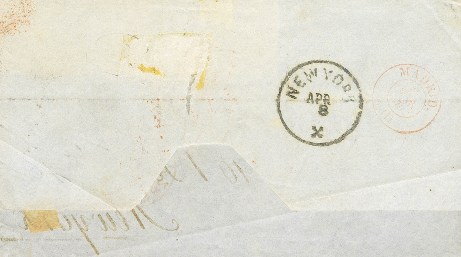 109(4). 1870. 200 mils castaño, dos parejas. Frontal (con una solapa al dorso) de JEREZ DE LA FRONTERA a NUEVA YORK (U.S.A.). En el frente tránsito LONDON / PAID, en rojo y al dorso tránsito MADRID / (1) y llegada. MAGNIFICA.